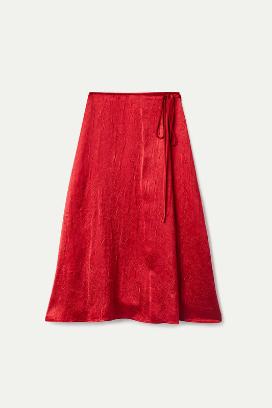 Flowy midi skirt in red crumpled satin