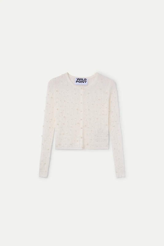 White openwork knit cardigan with pearls