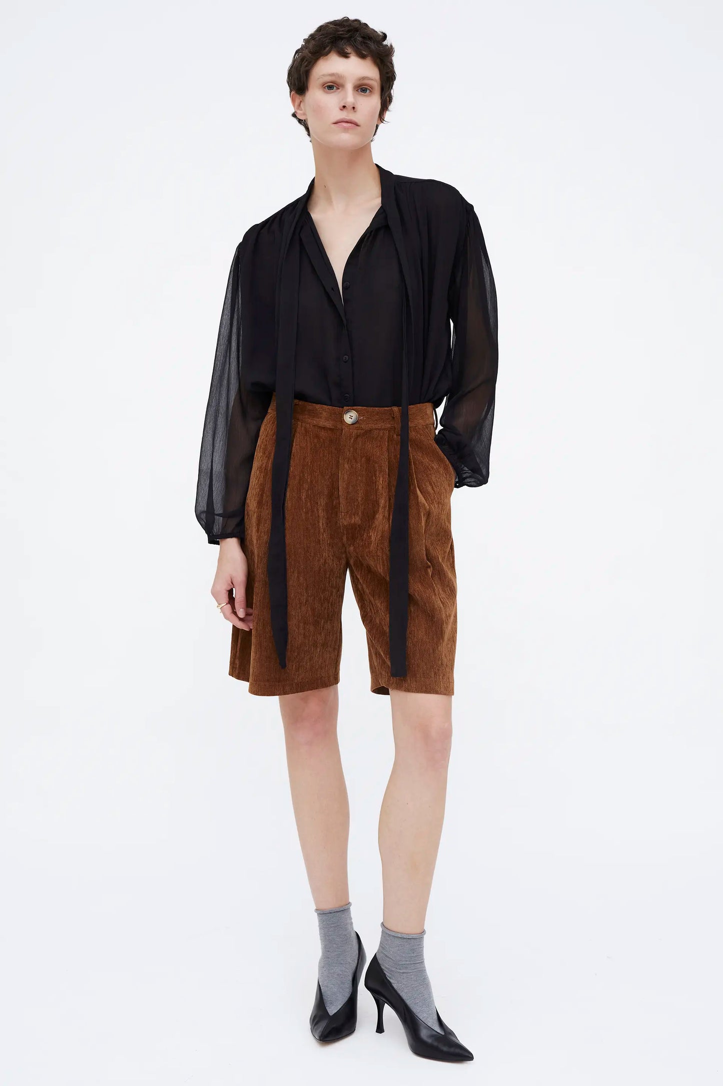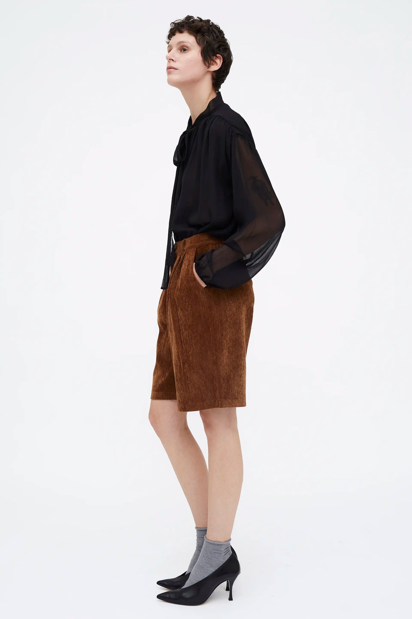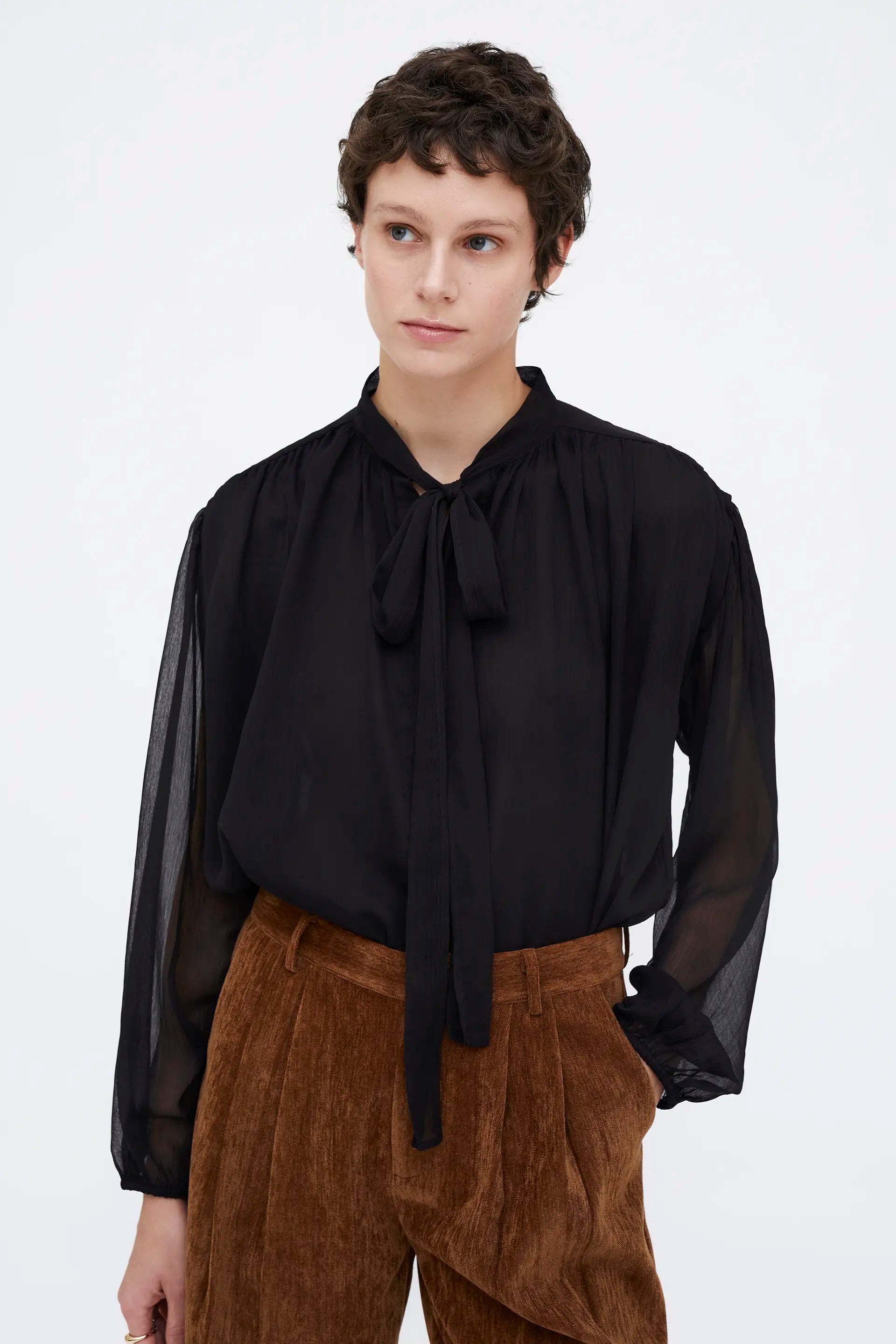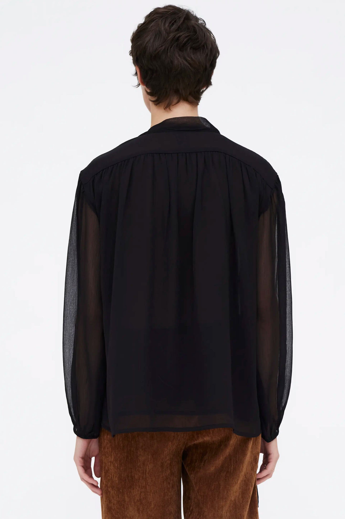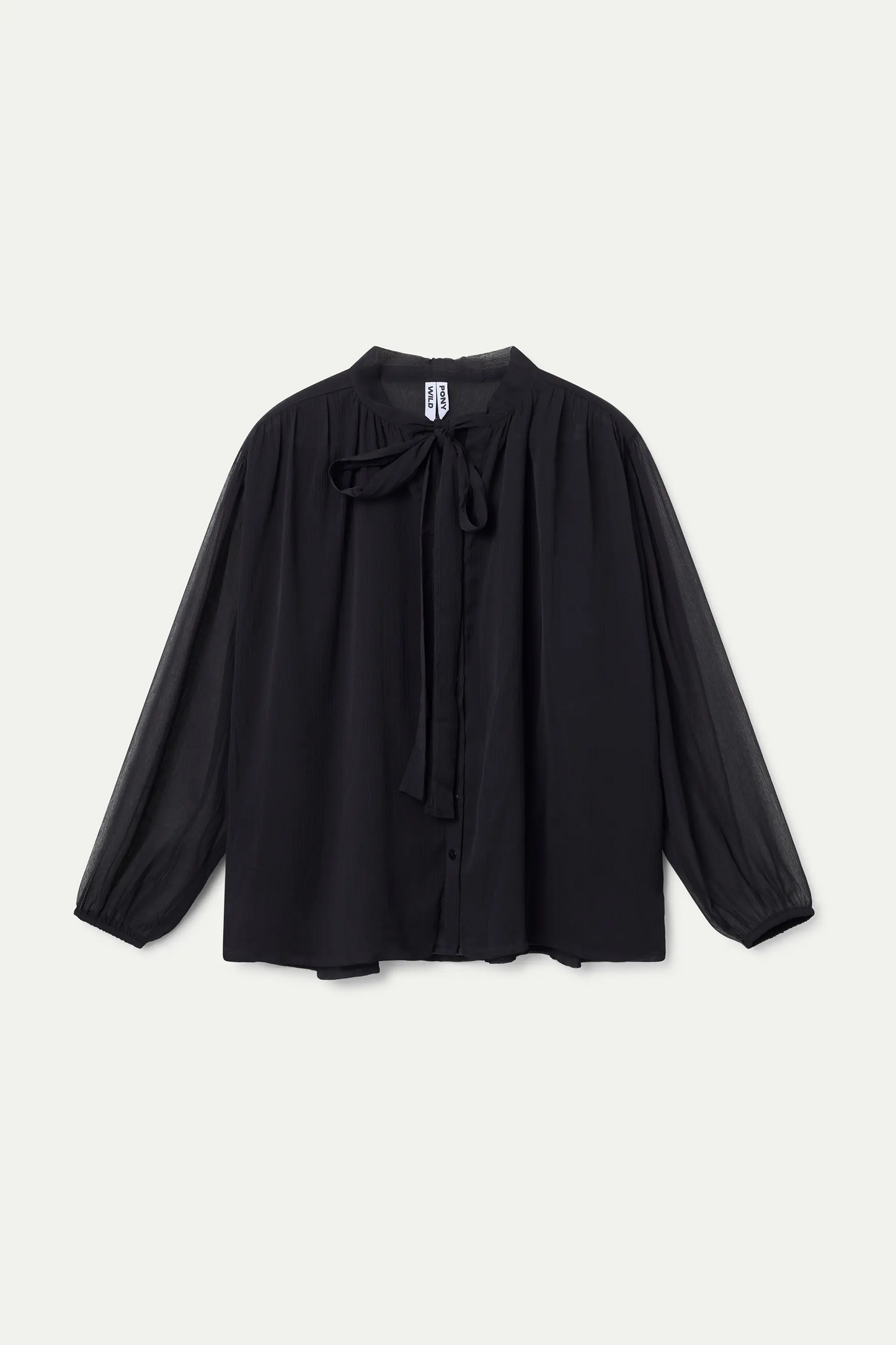 Black chiffon shirt. Round neck with a knotted V-neckline. Long sleeves with cuffs. Lined.