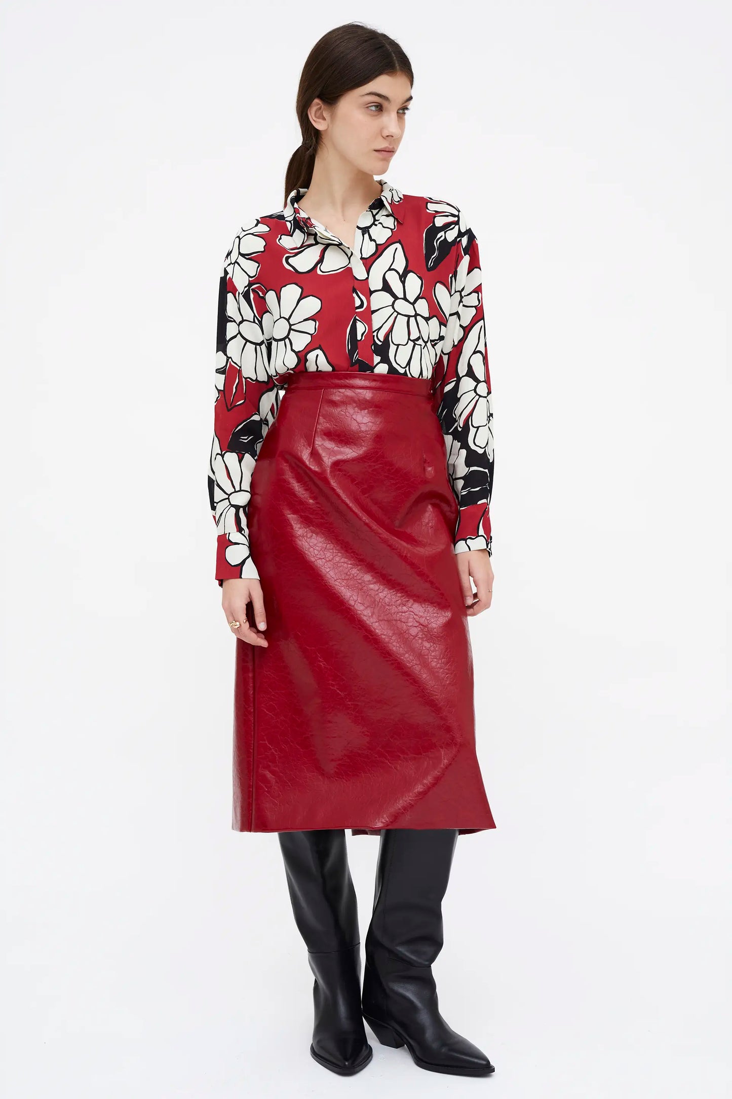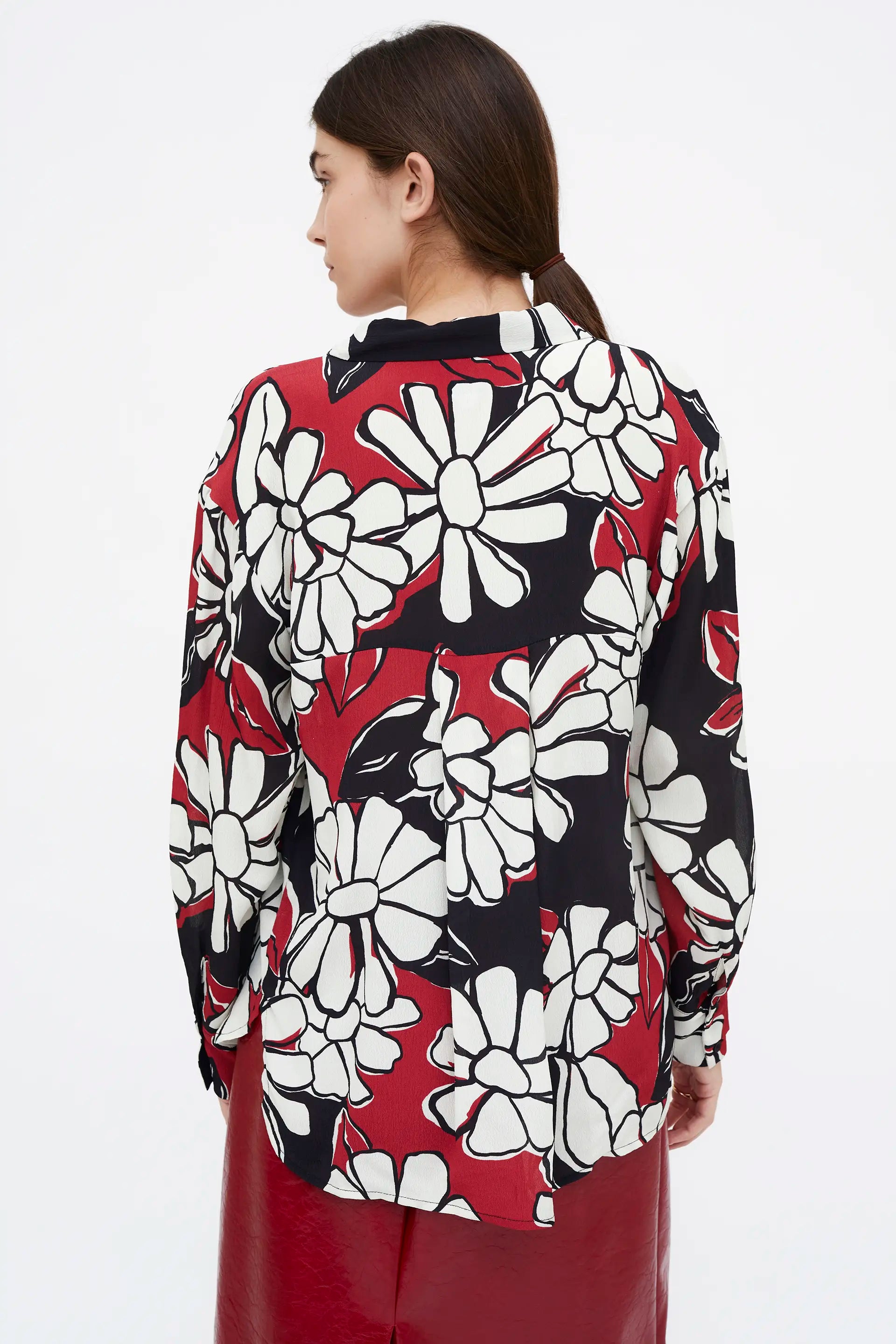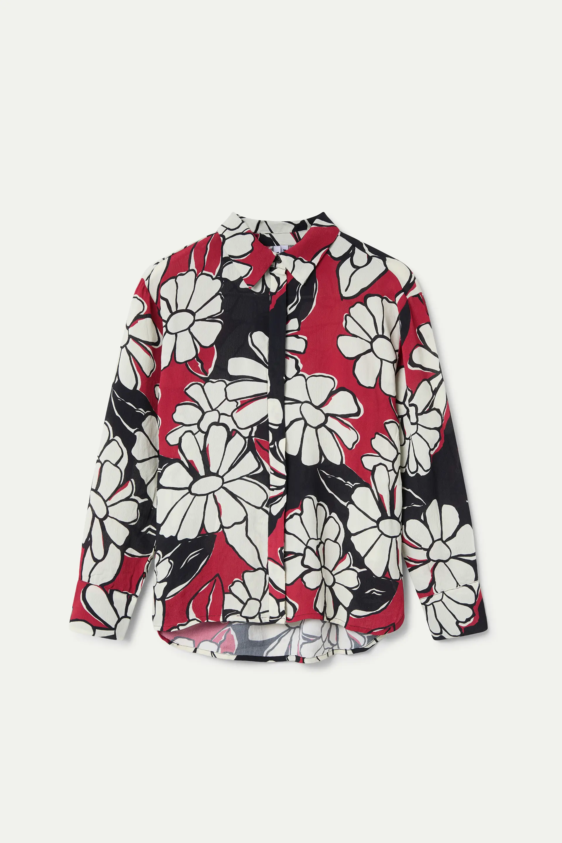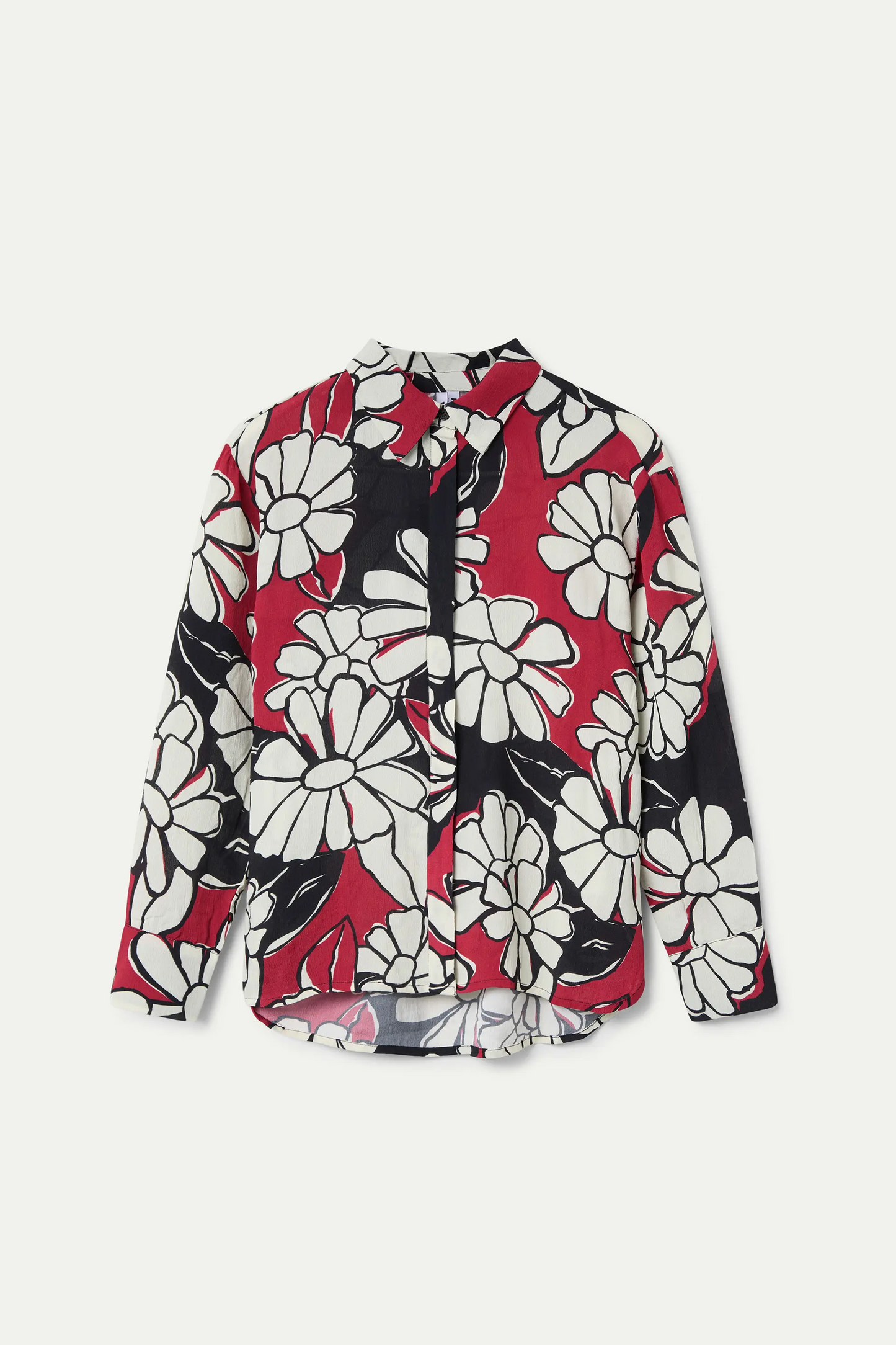 Blooming Sunset print shirt. Lapel collar and long sleeves with buttoned cuffs. Front button closure.