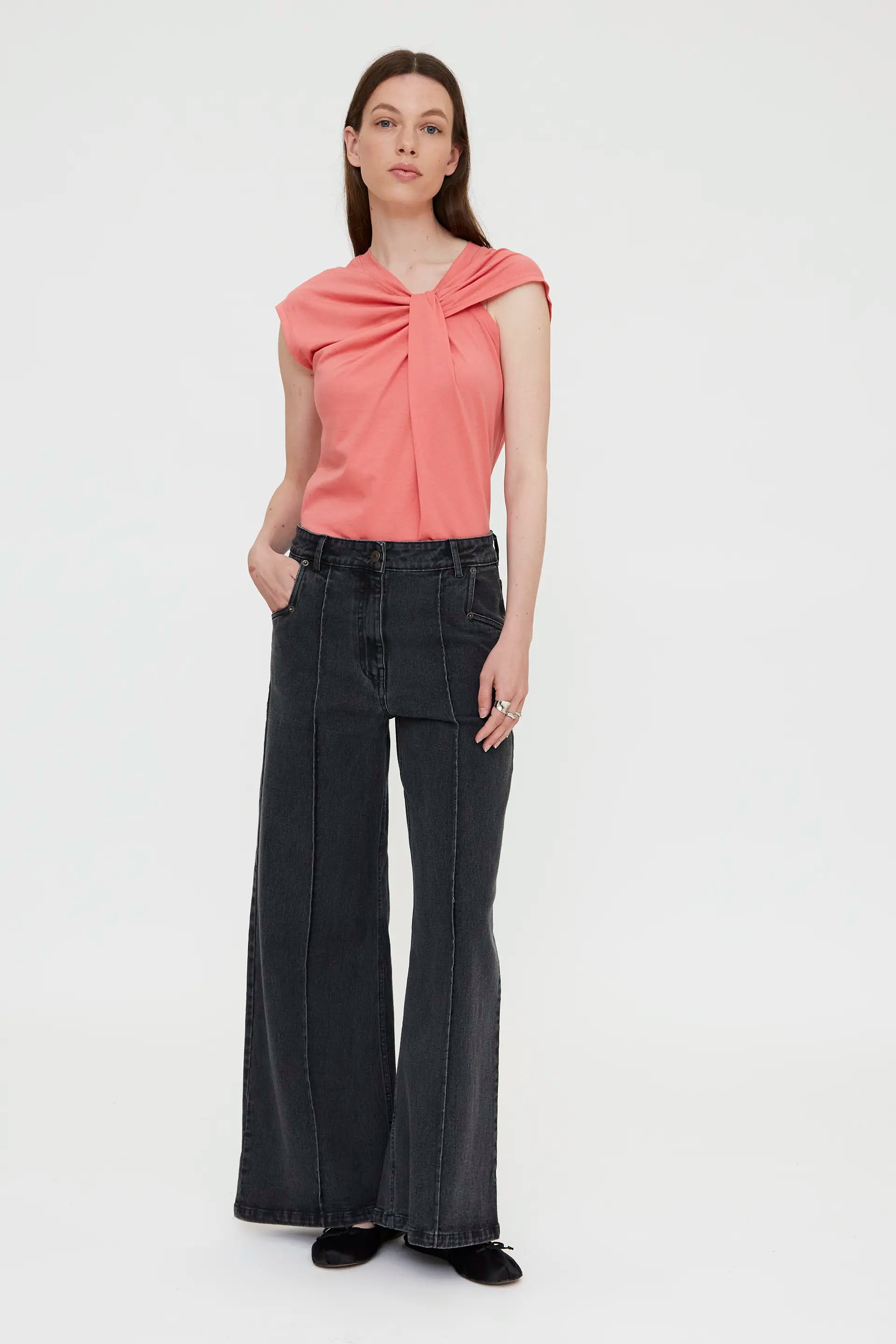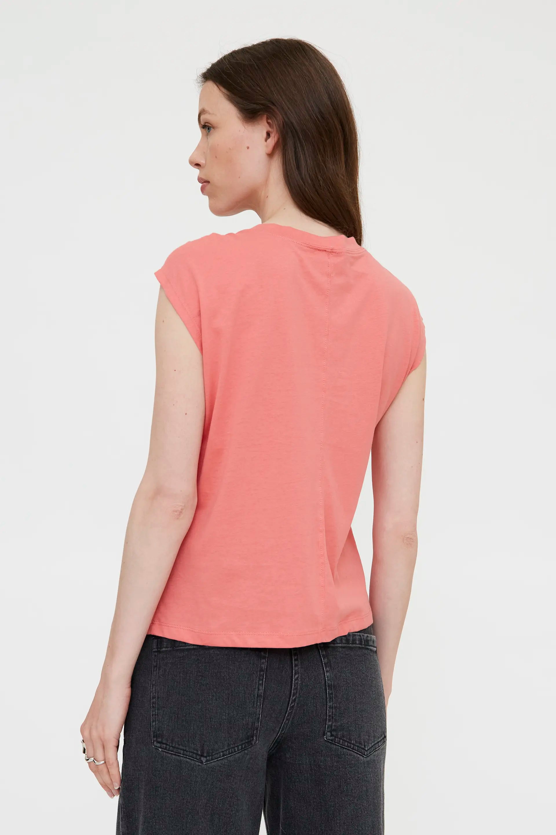 Coral-colored t-shirt made from 100% cotton. Features an asymmetrical neckline, short sleeves, and a knotted detail. The model is 178 cm tall and wears size S.