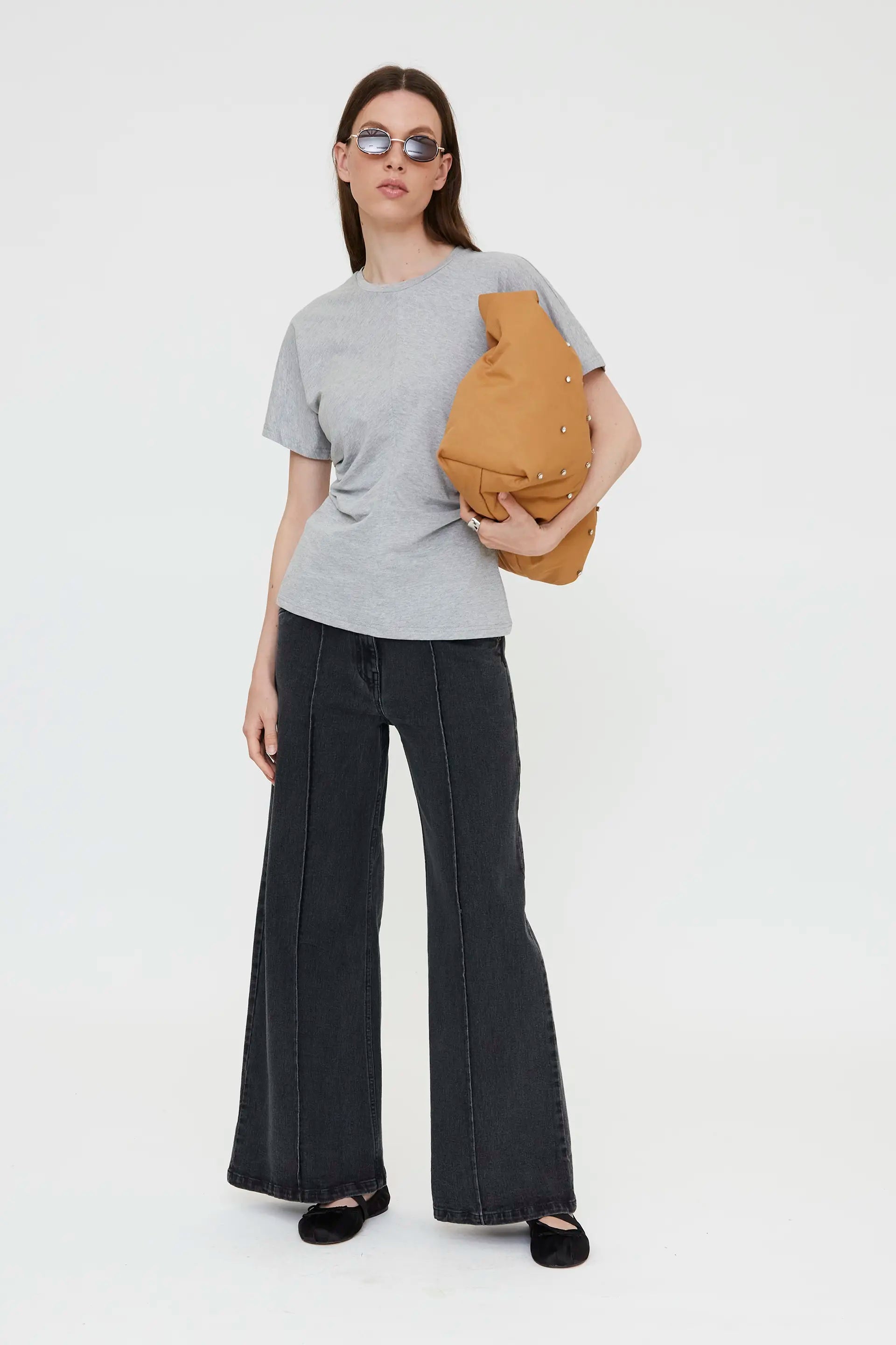 Grey t-shirt made from 100% cotton. Features a round neck, short sleeves, and a draped detail at the waist. The model is 178 cm tall and wears size S.