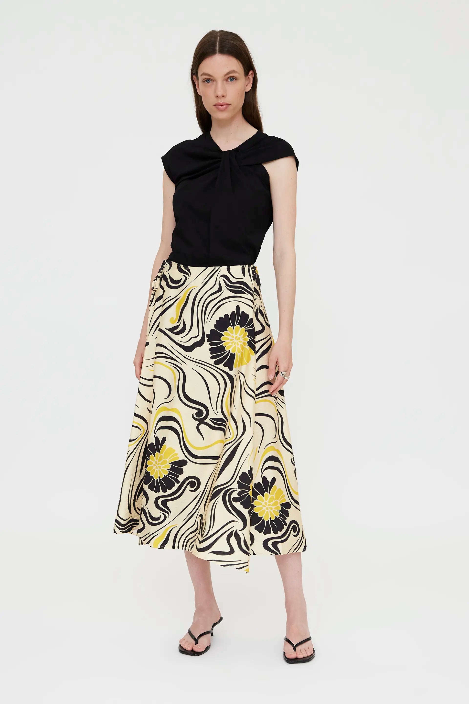 Black t-shirt made from 100% cotton. Features an asymmetrical neckline, short sleeves, and a knotted detail. The model is 178 cm tall and wears size S.
