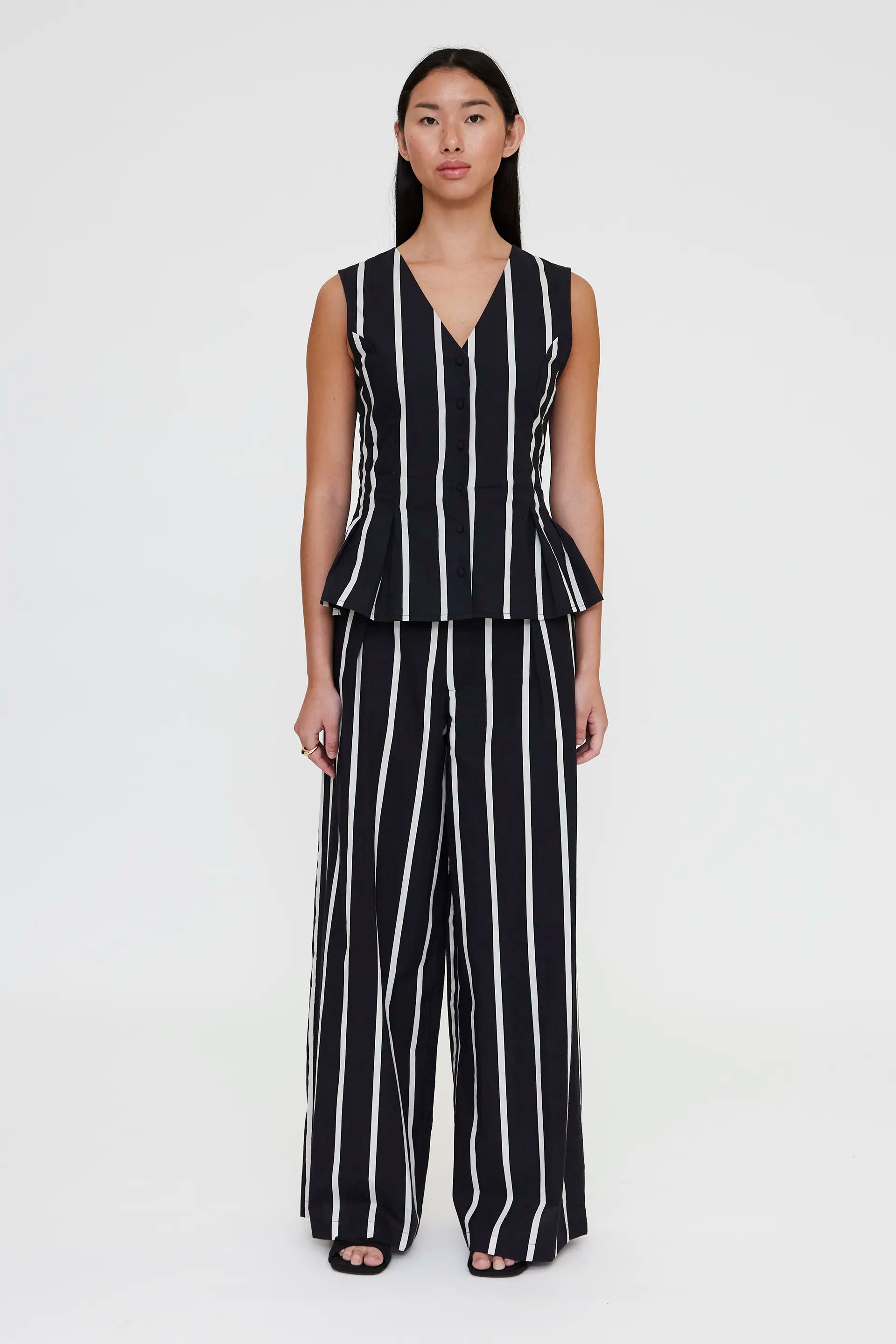 100% cotton vest with Grimaud Black print. V-neck and sleeveless. Front button closure with black covered buttons. Pleated detail. Lined. The model is 173 cm tall and wears size S.