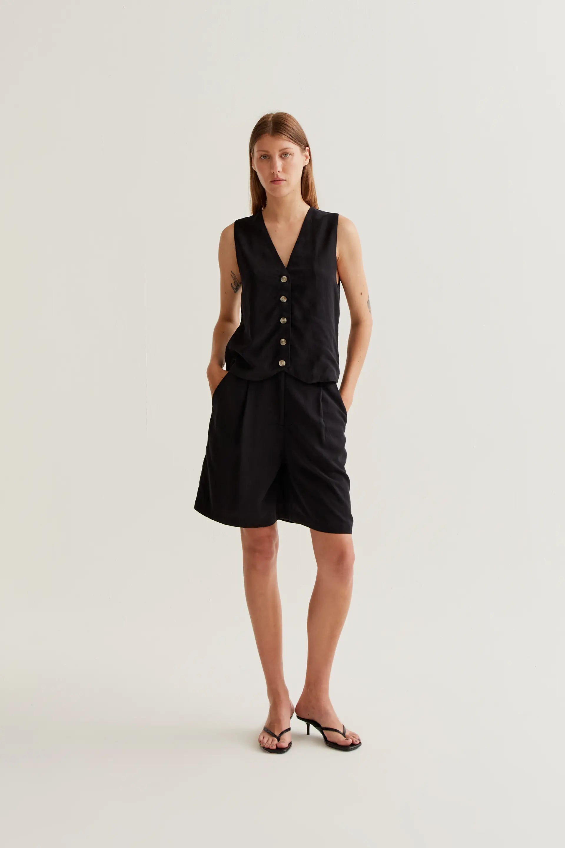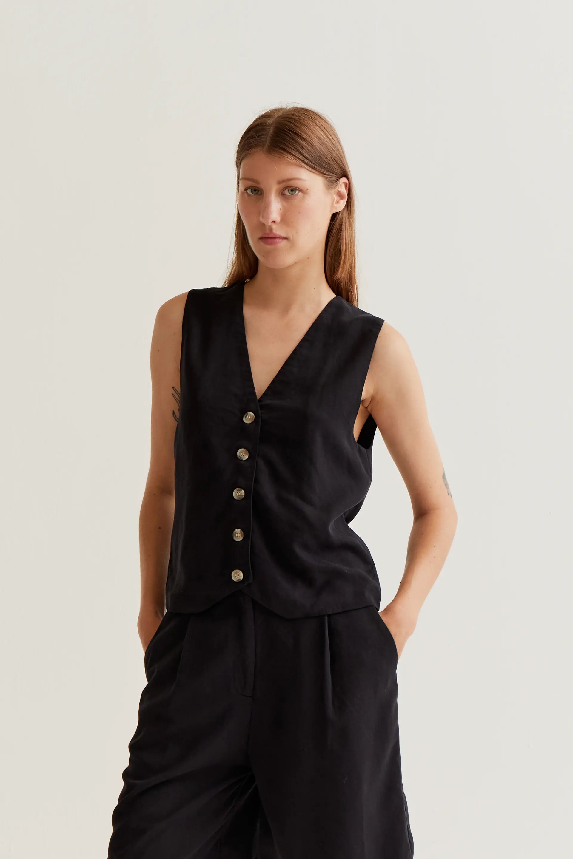 Vest made from 100% lyocell fabric in black. Features a V-neck and is sleeveless. Front closure with black buttons. The model is 177 cm tall and wears size S.