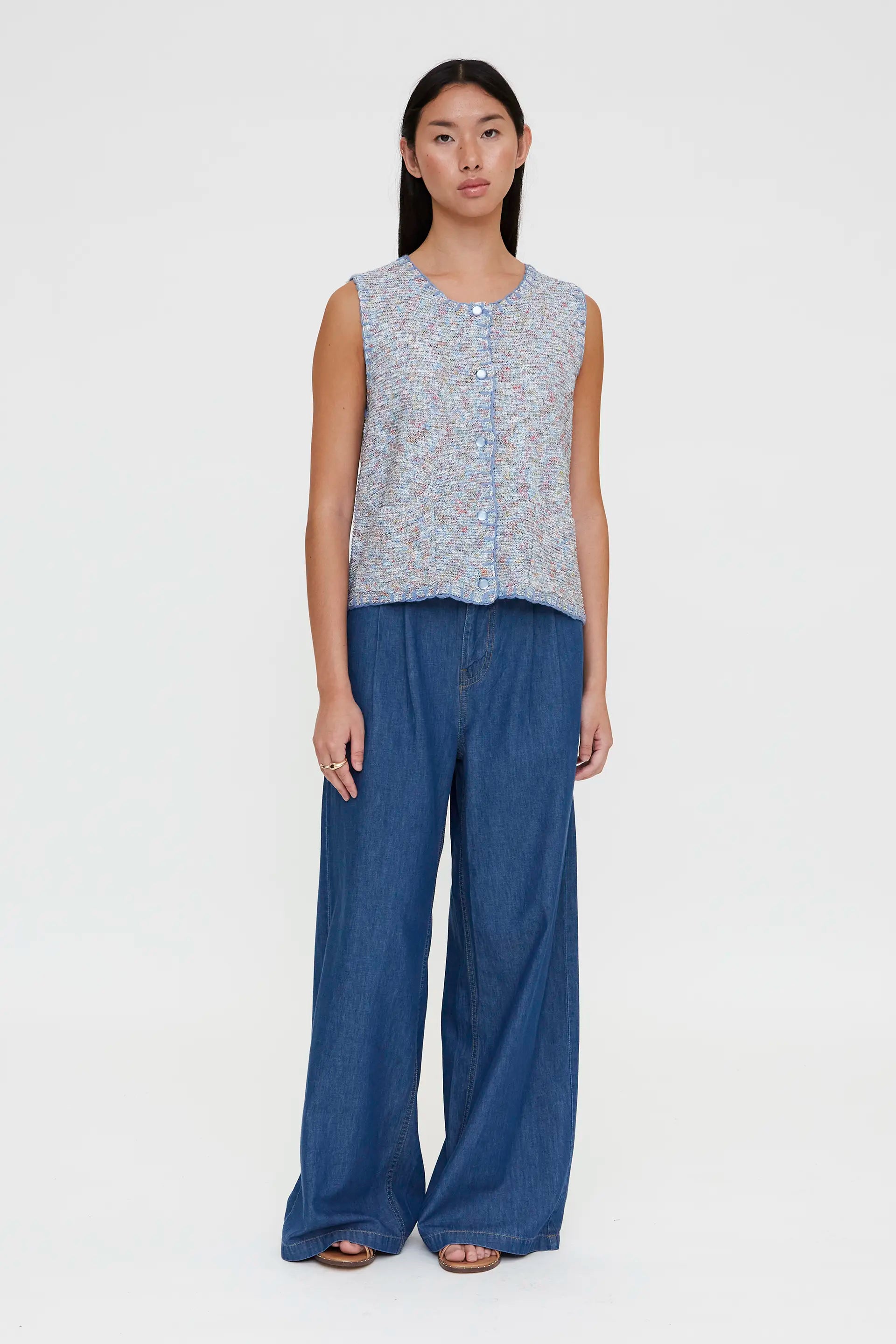 Vest in multicolored knit fabric. Interlaced details in blue. Round neck and sleeveless. Button front closure. Front pockets. The model is 173 cm tall and wears size S.