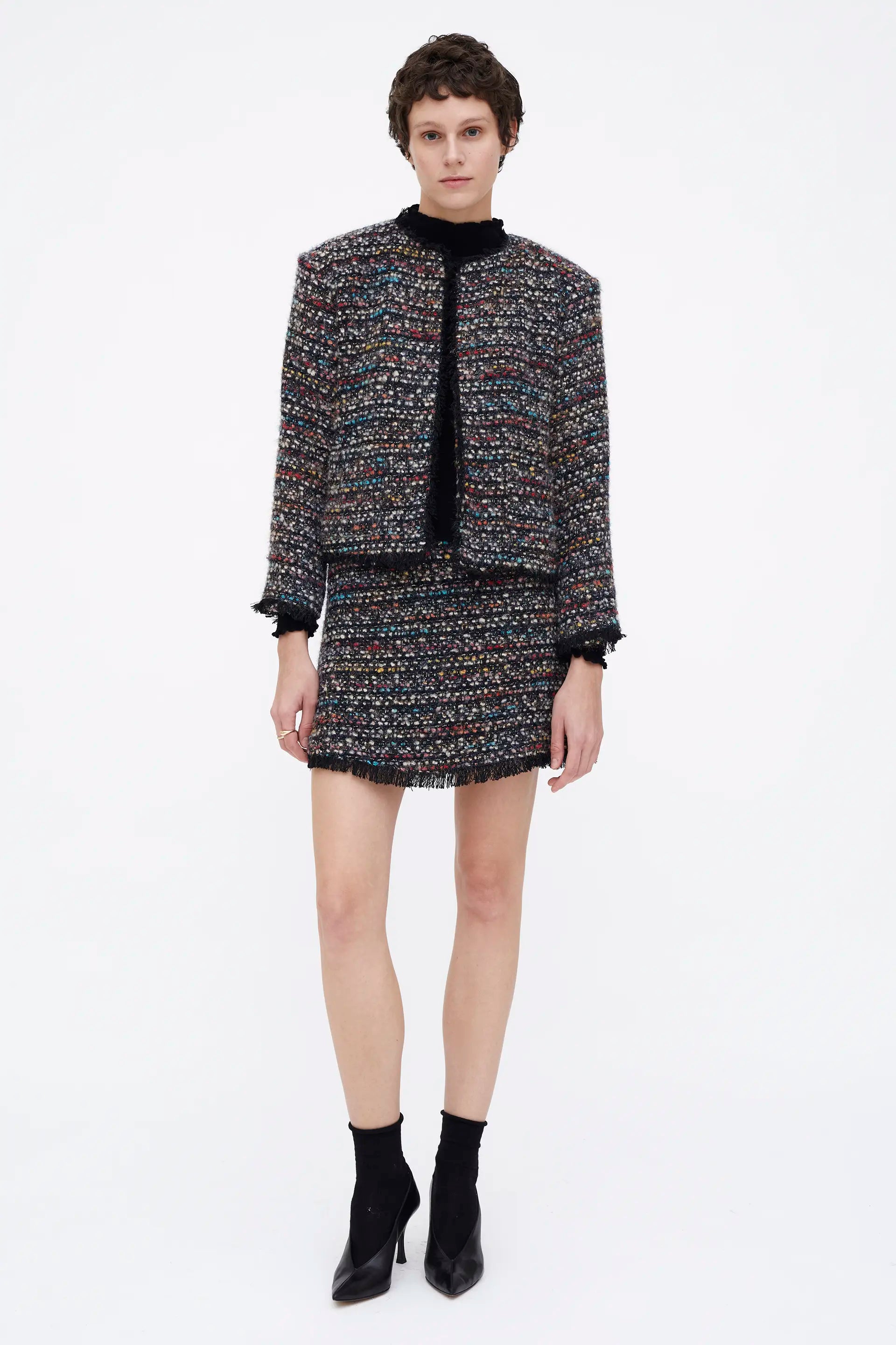 Multicolored tweed jacket. Round neck and long sleeves. Fringed trim. Lined.