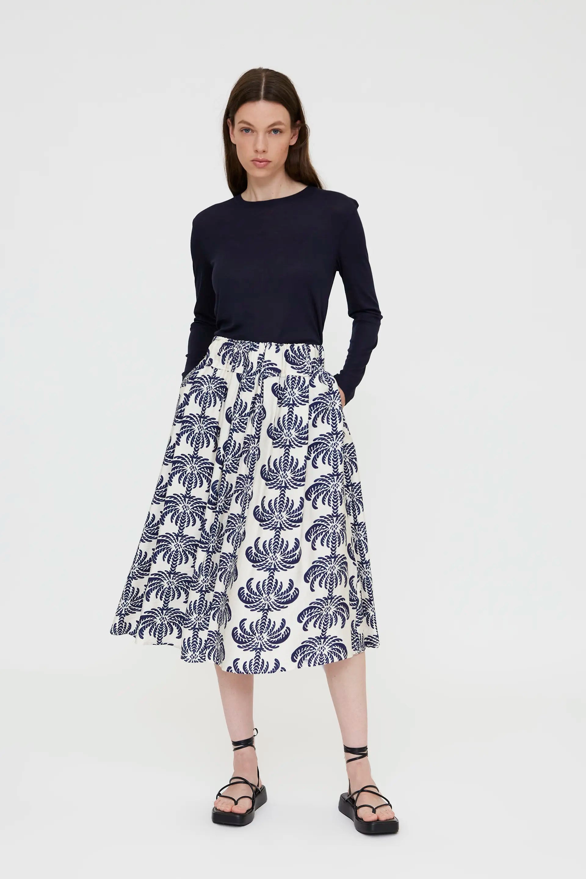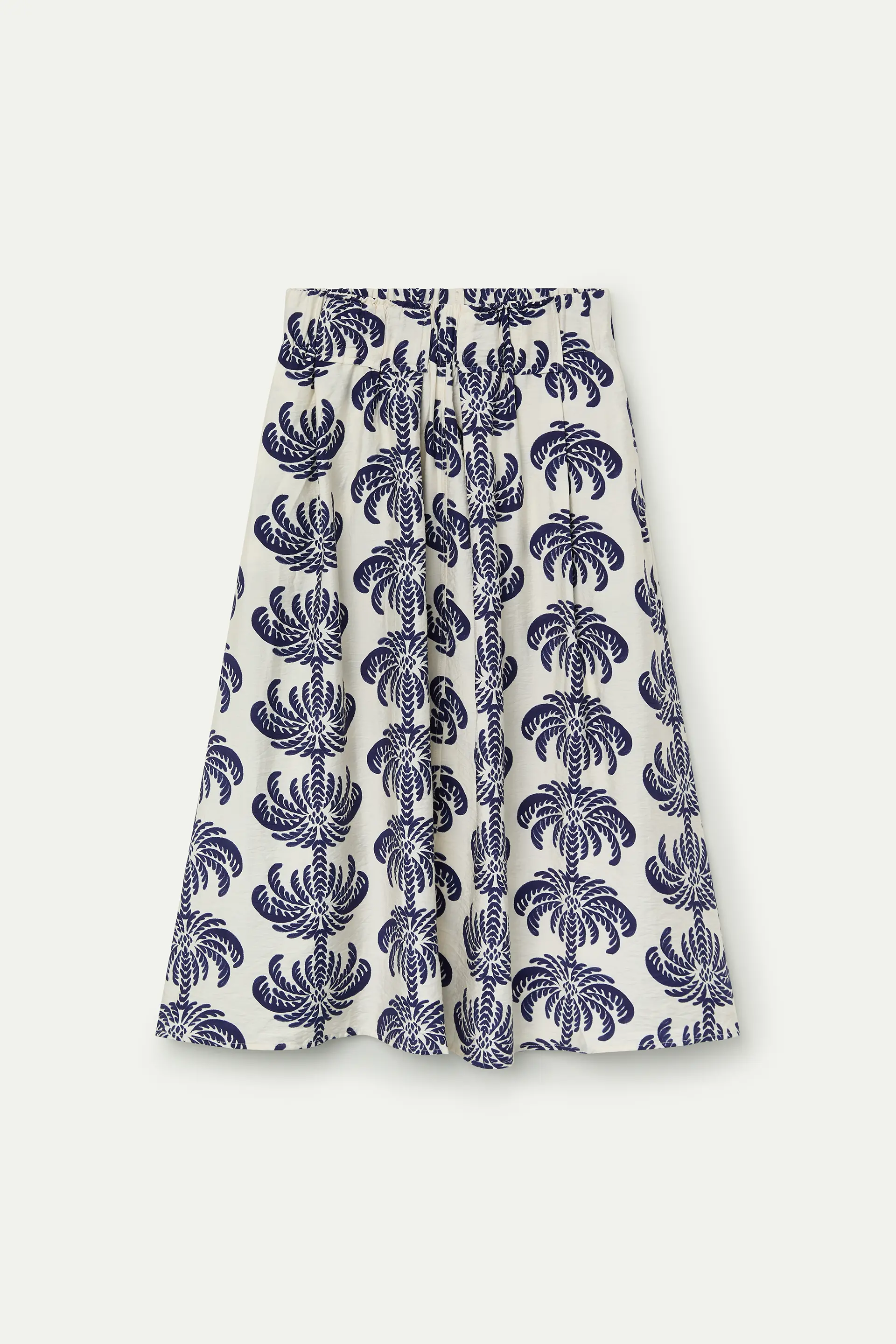 Crepe skirt with a palm spring print. High-waisted elasticated fixed waistband. Pleated details. The model is 178 cm tall and wears size S.