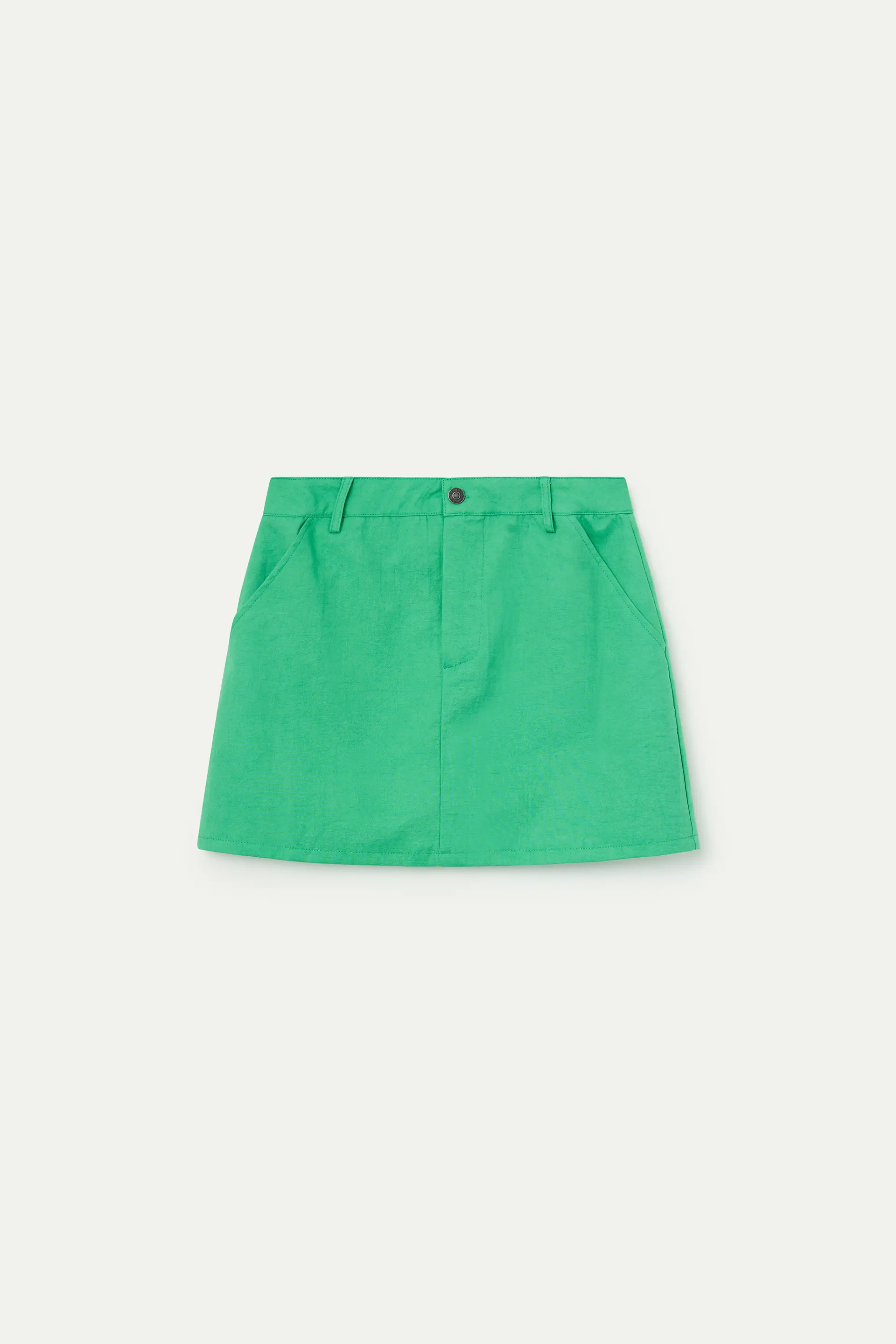 Short skirt in a linen and cotton blend fabric in green. High-waisted with a fixed waistband. Concealed zip and button front closure. Side pockets. The model is 173 cm tall and wears size S.
