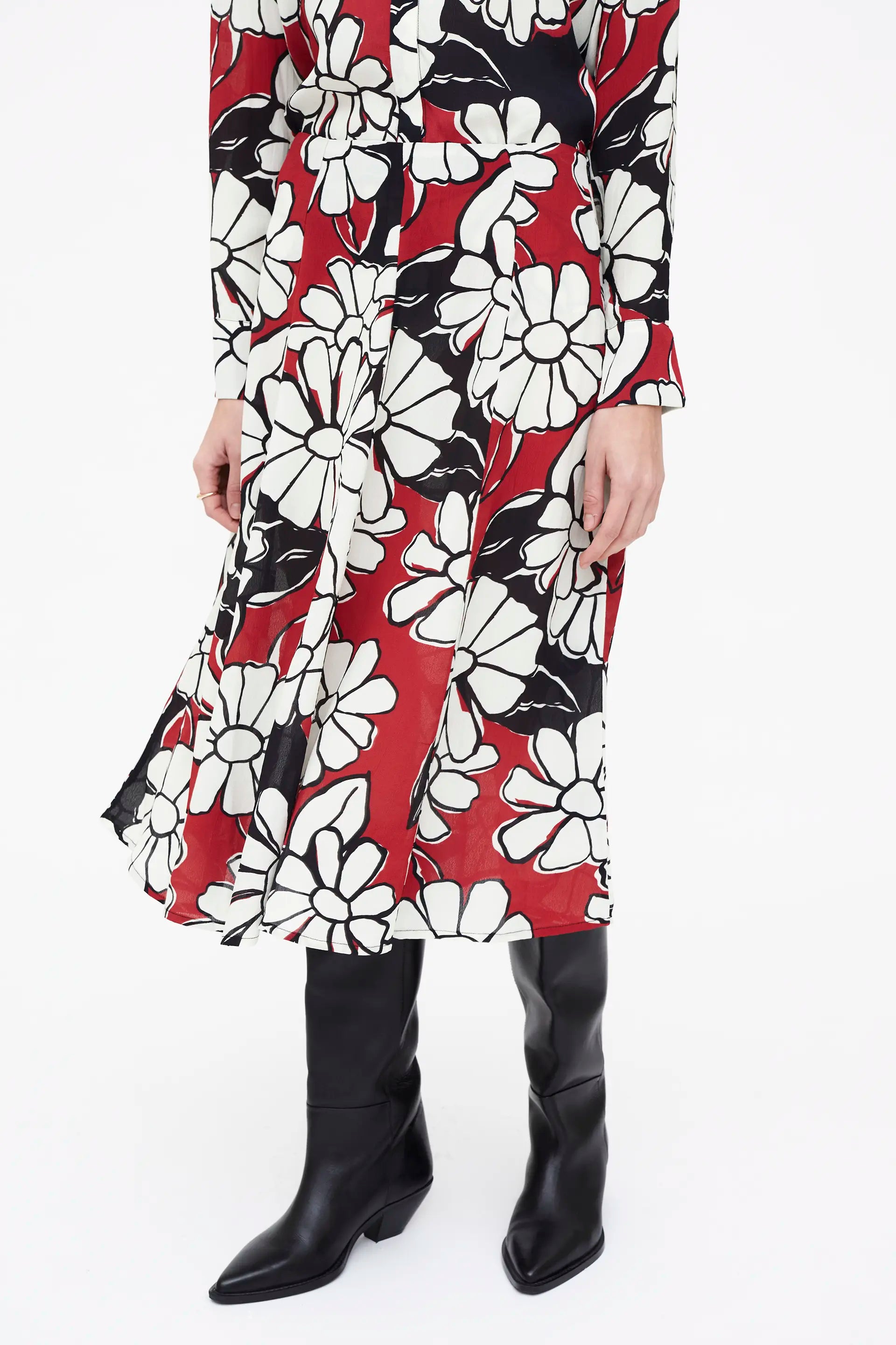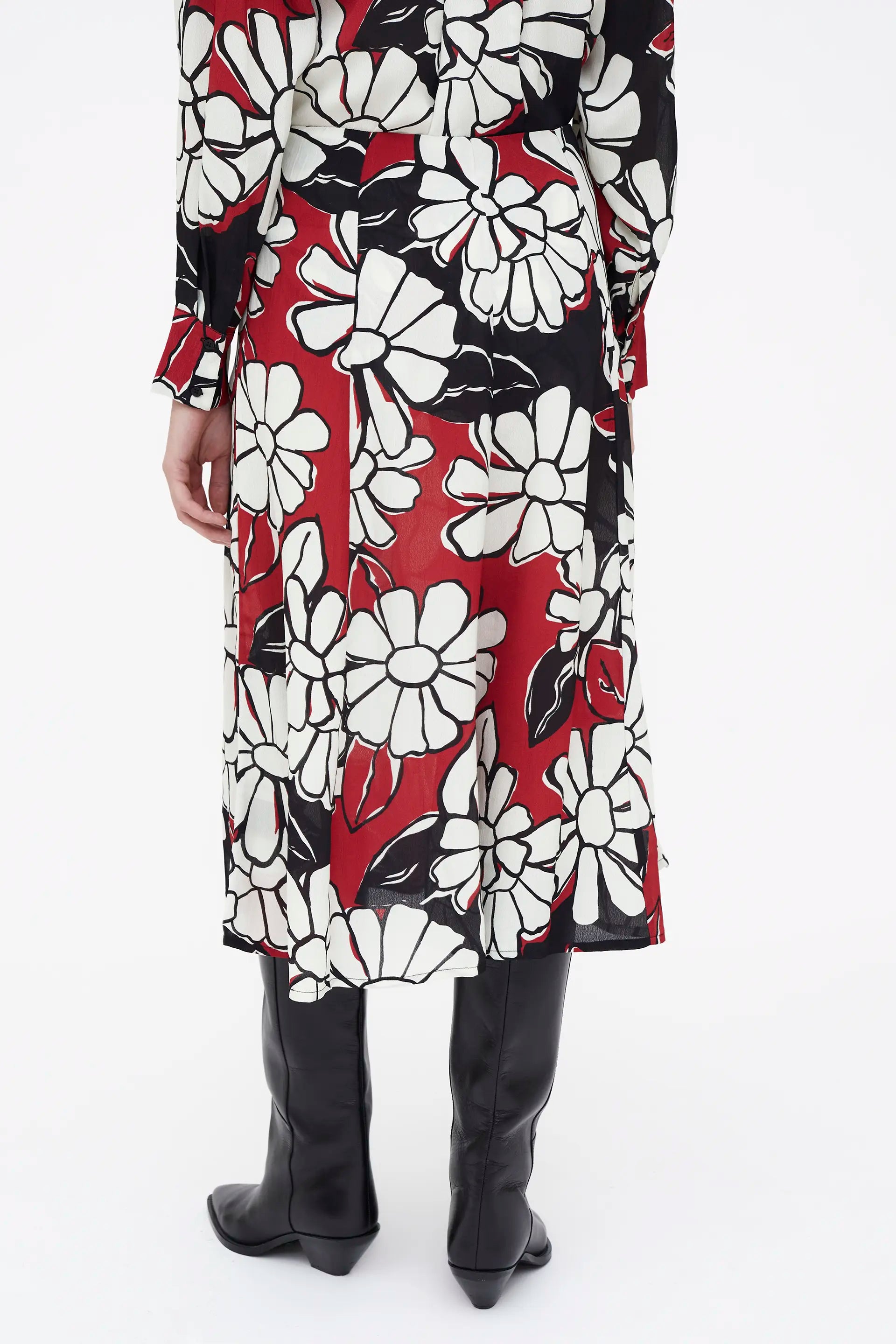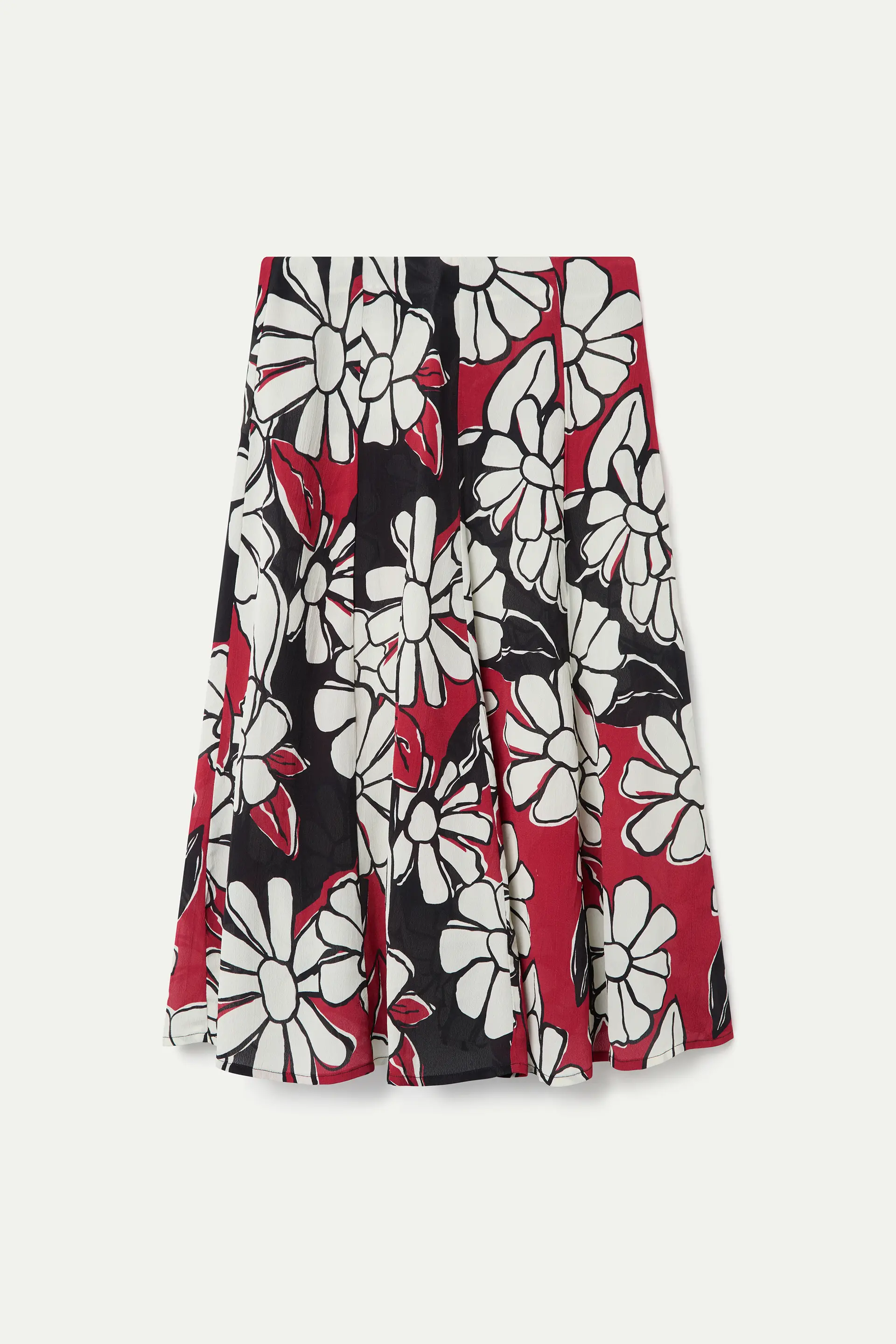 Blooming Sunset print midi skirt. Fixed mid-rise waistband. Invisible side zipper.