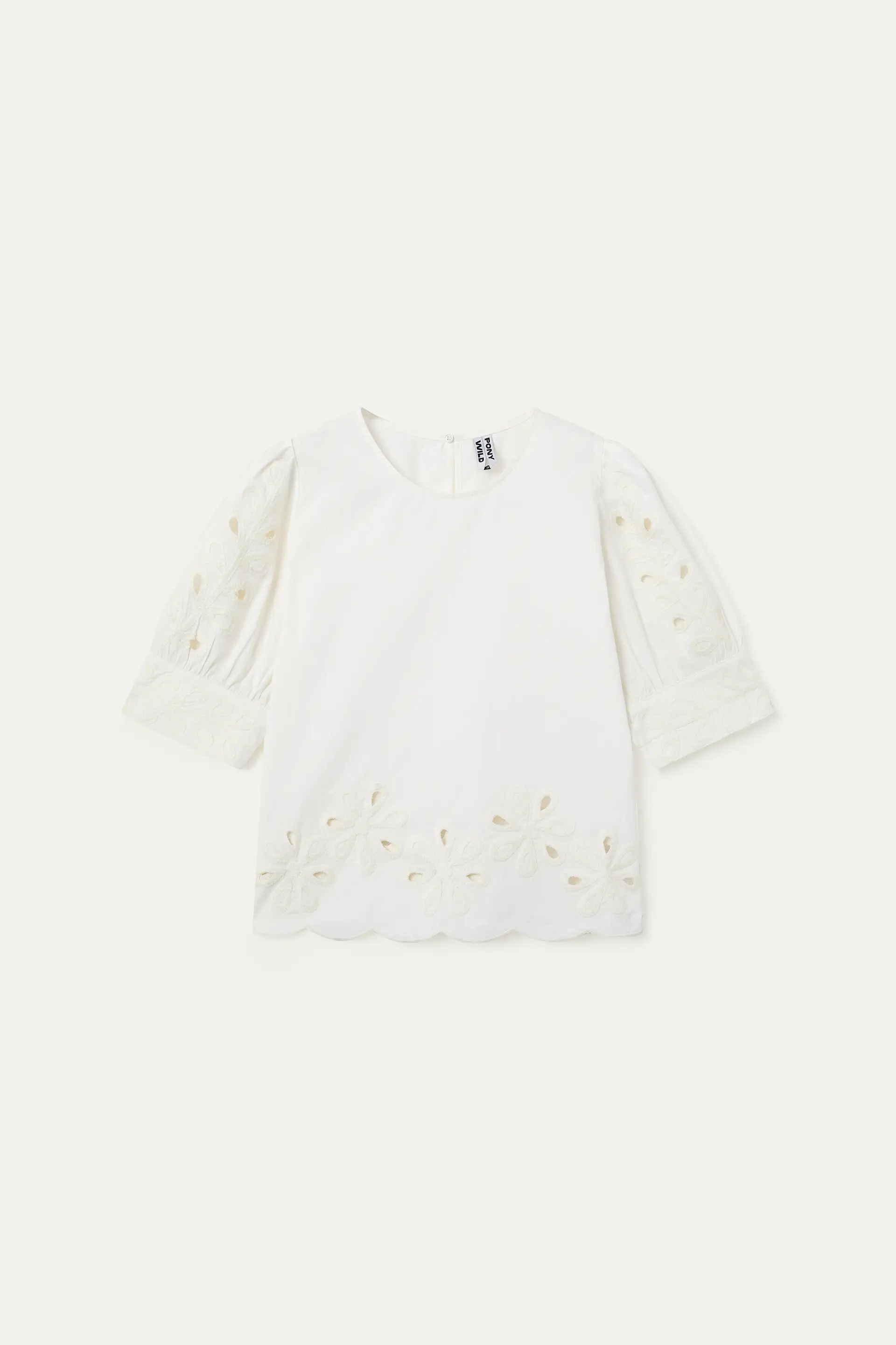 Top made from 100% cotton in off-white. Round neck and 3/4 sleeves. Embroidered details on the sleeves and hem. Button closure at the back. The model is 173 cm tall and wears size S.