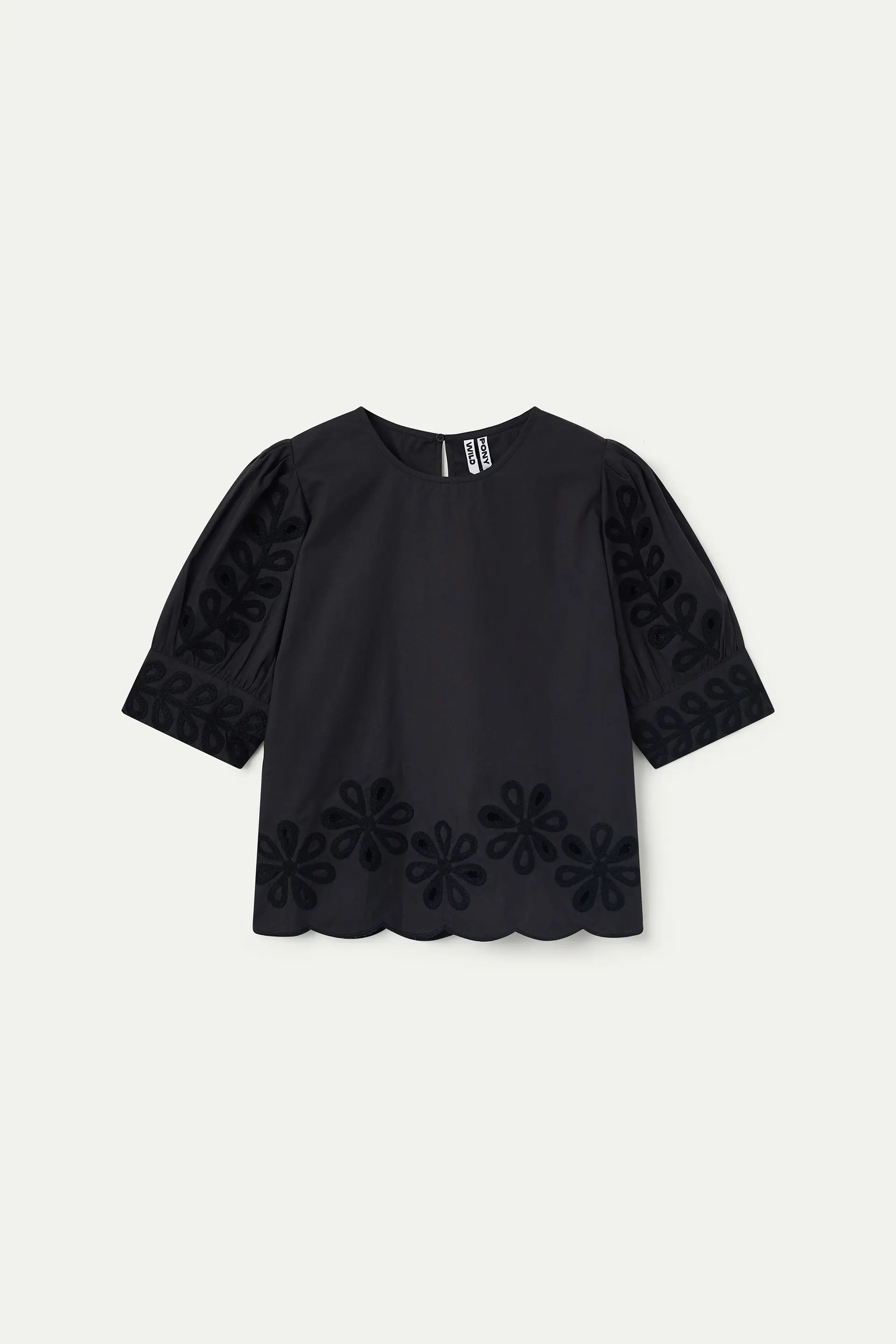 Black top made from 100% cotton. Round neck and 3/4 sleeves. Embroidered details on the sleeves and hem. Button closure at the back. The model is 173 cm tall and wears size S.