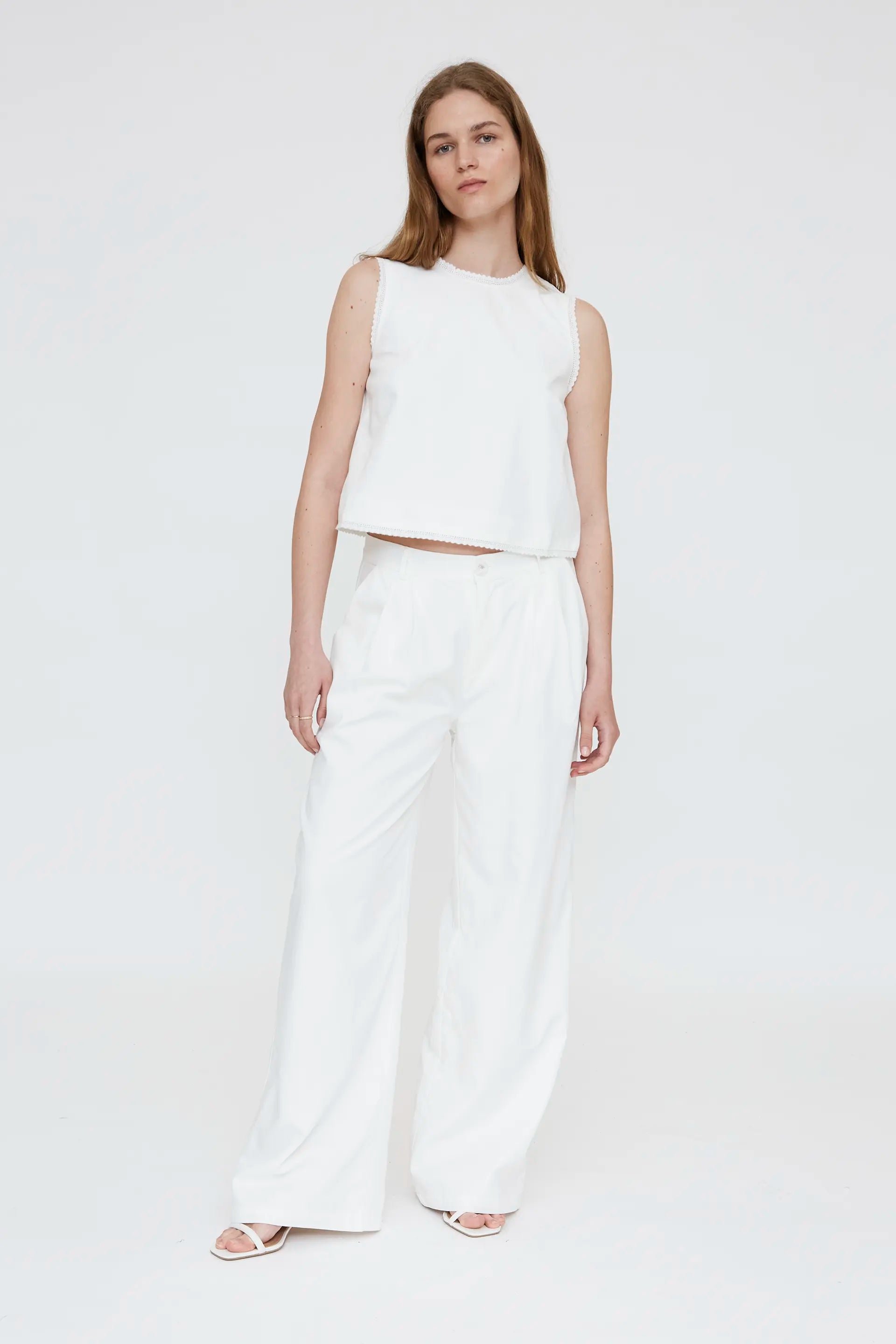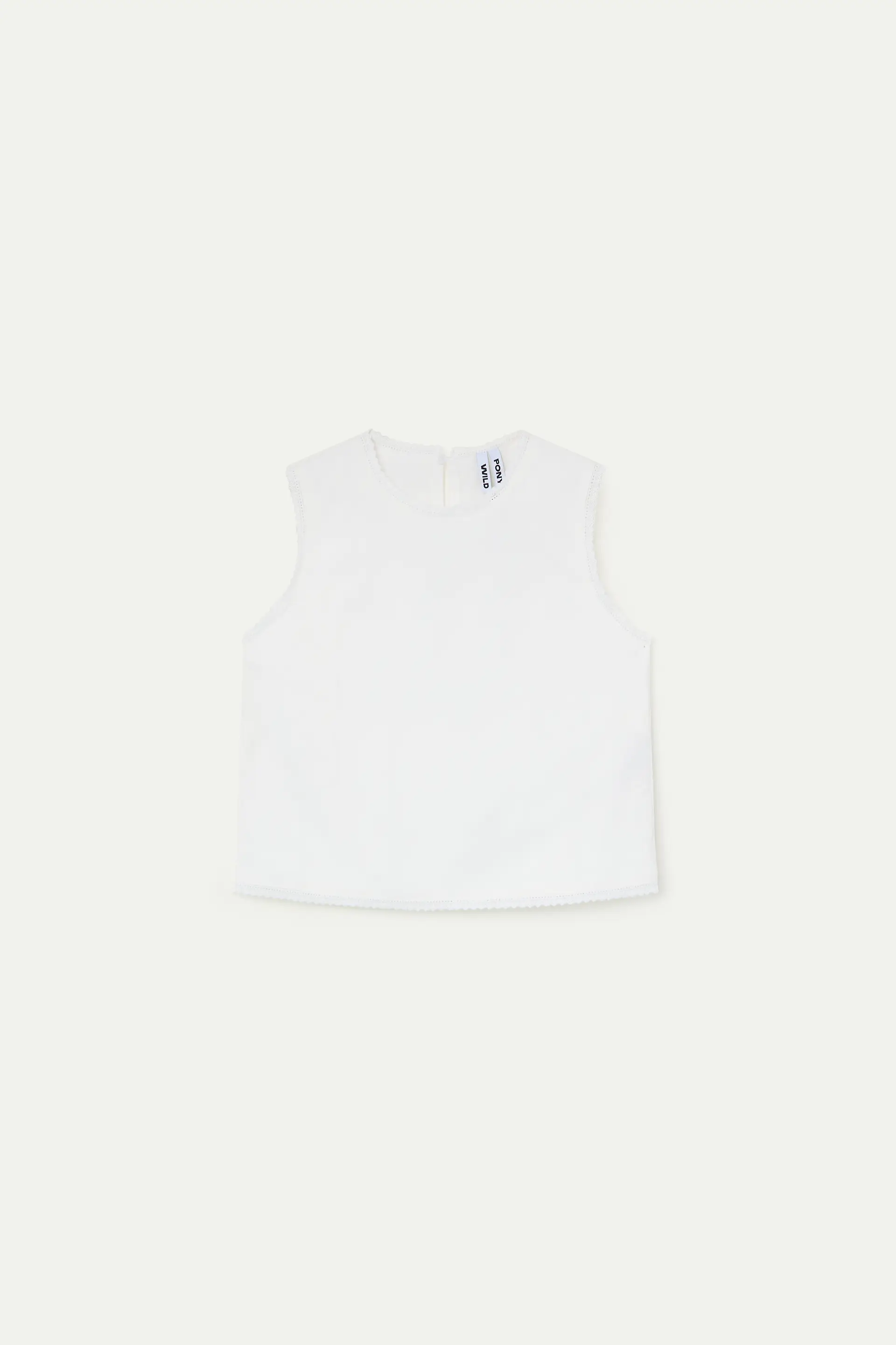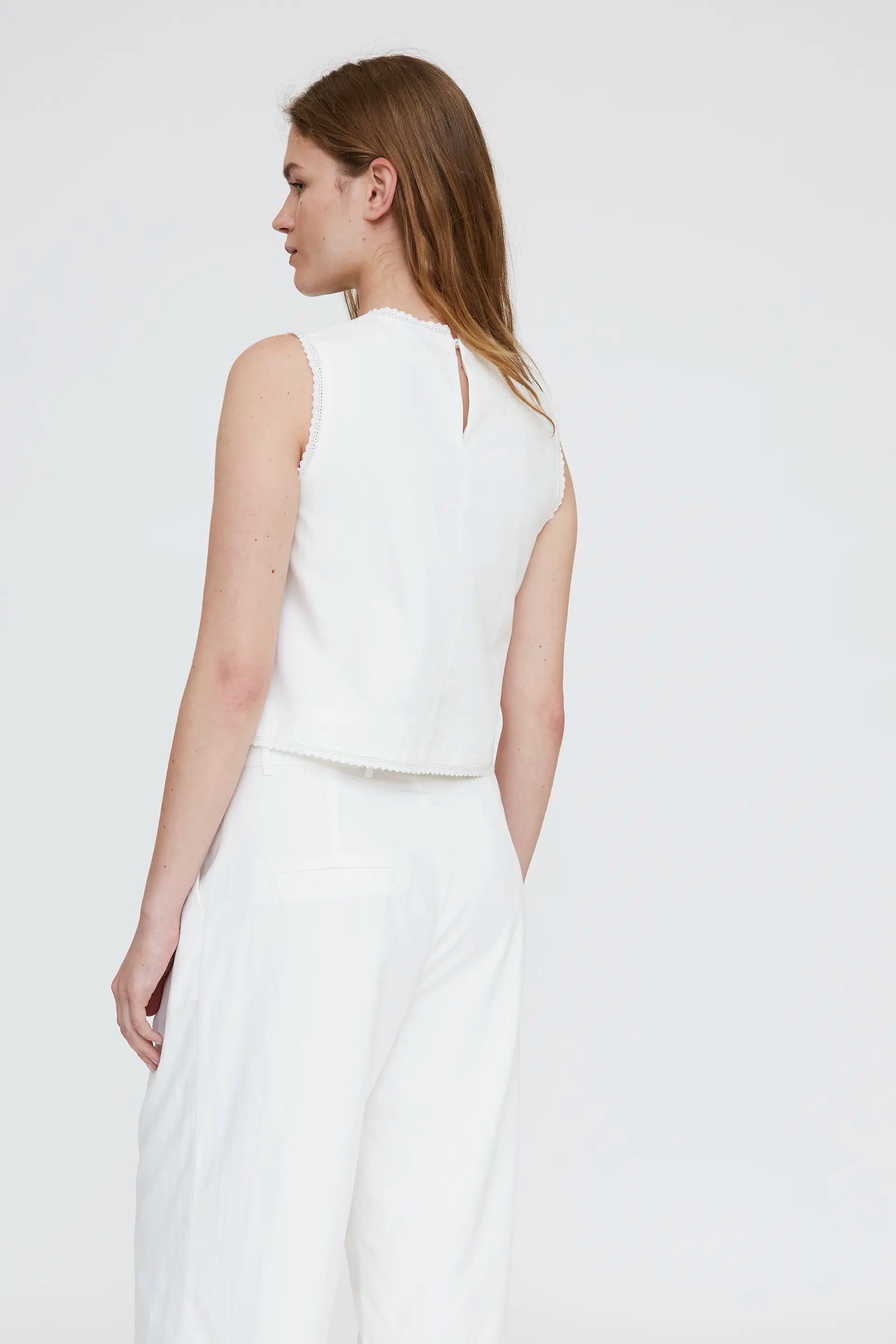 White crepe top. Round neck and sleeveless. Lace trim details. Lined. The model is 174 cm tall and wears size S.