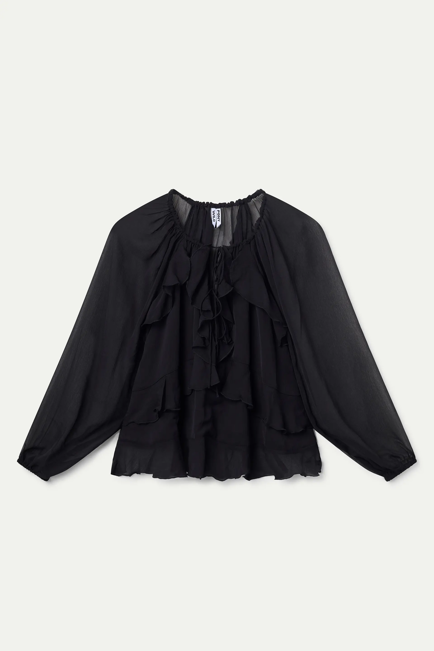 Black chiffon top. Boat neck with a V-neckline and ruffle detailing. Long, sheer sleeves. Lined.