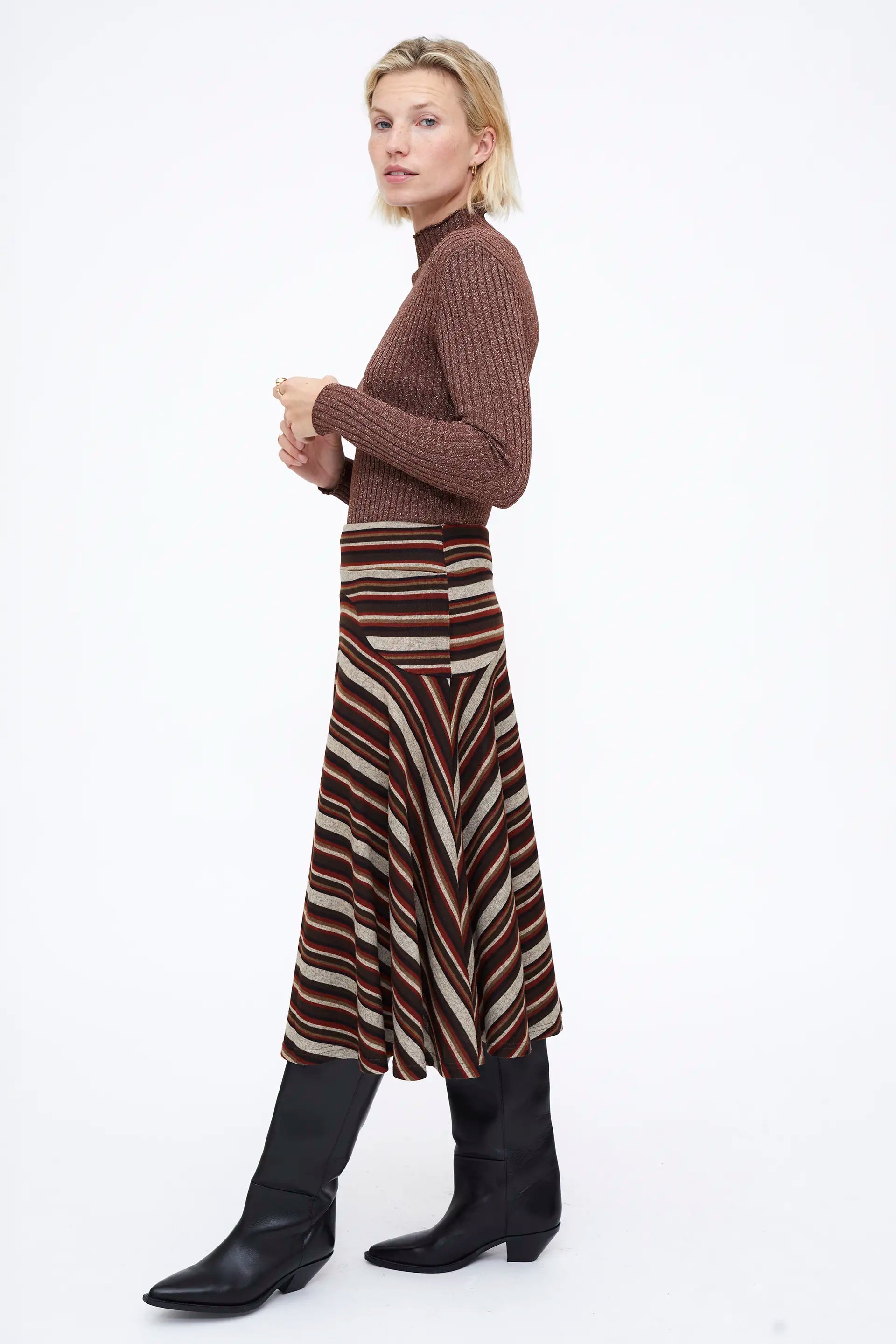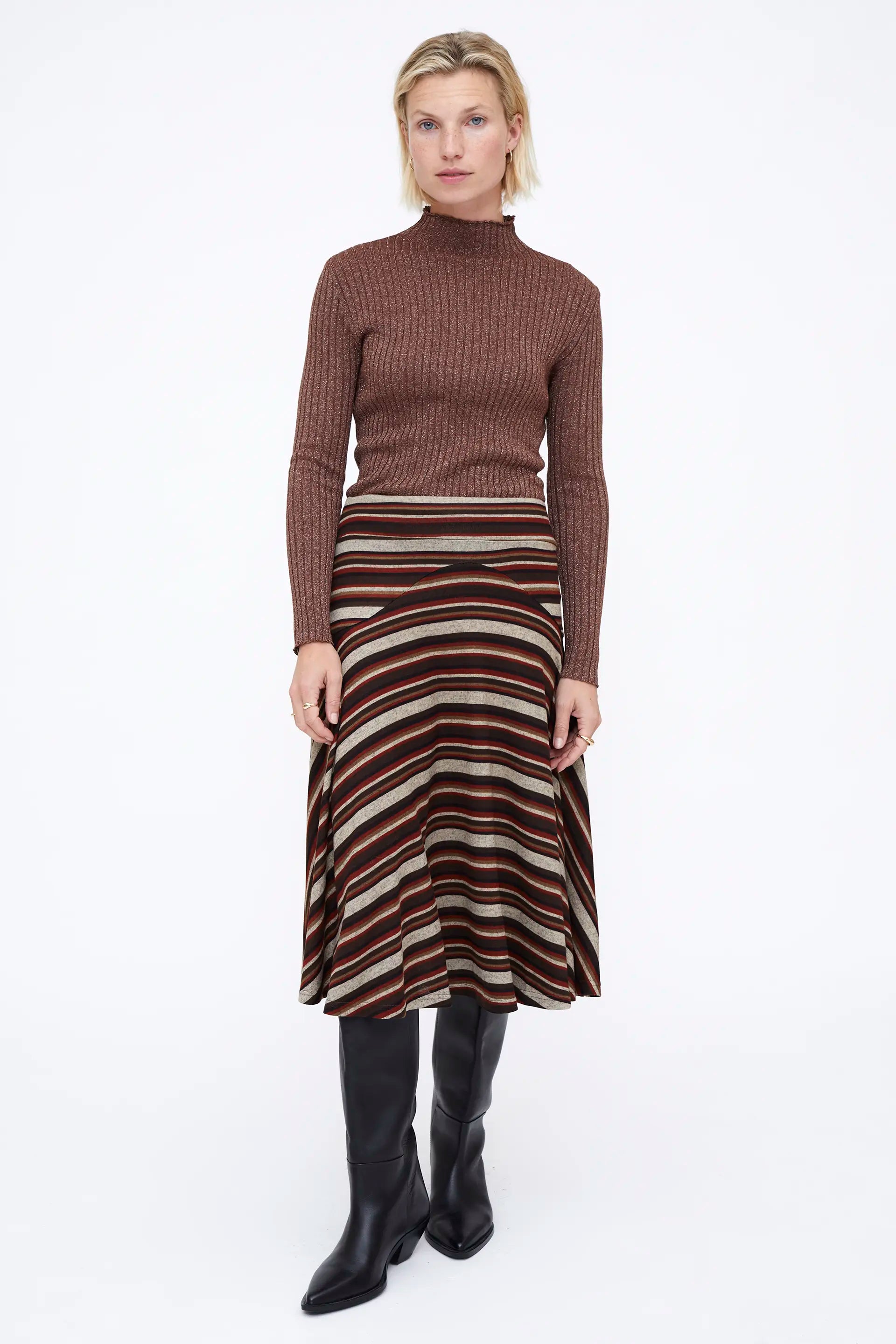 Brown ribbed knit top with a Perkins collar. Featuring a Perkins collar, long sleeves, and lurex ribbed details.