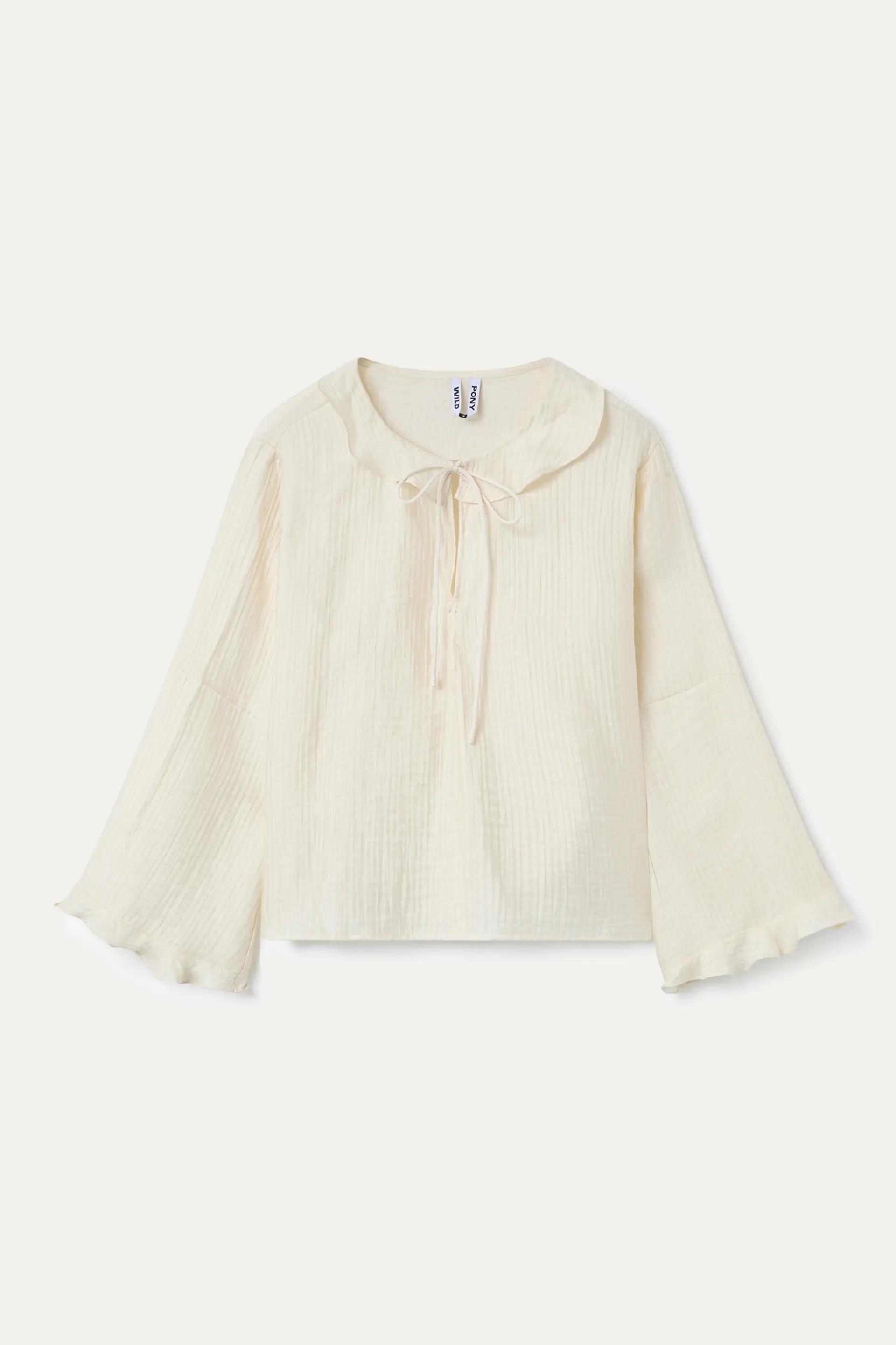 Flowy white top with a round, knotted neckline, buttoned cuffs, and a V-neckline. Long, wide sleeves with light ruffles.