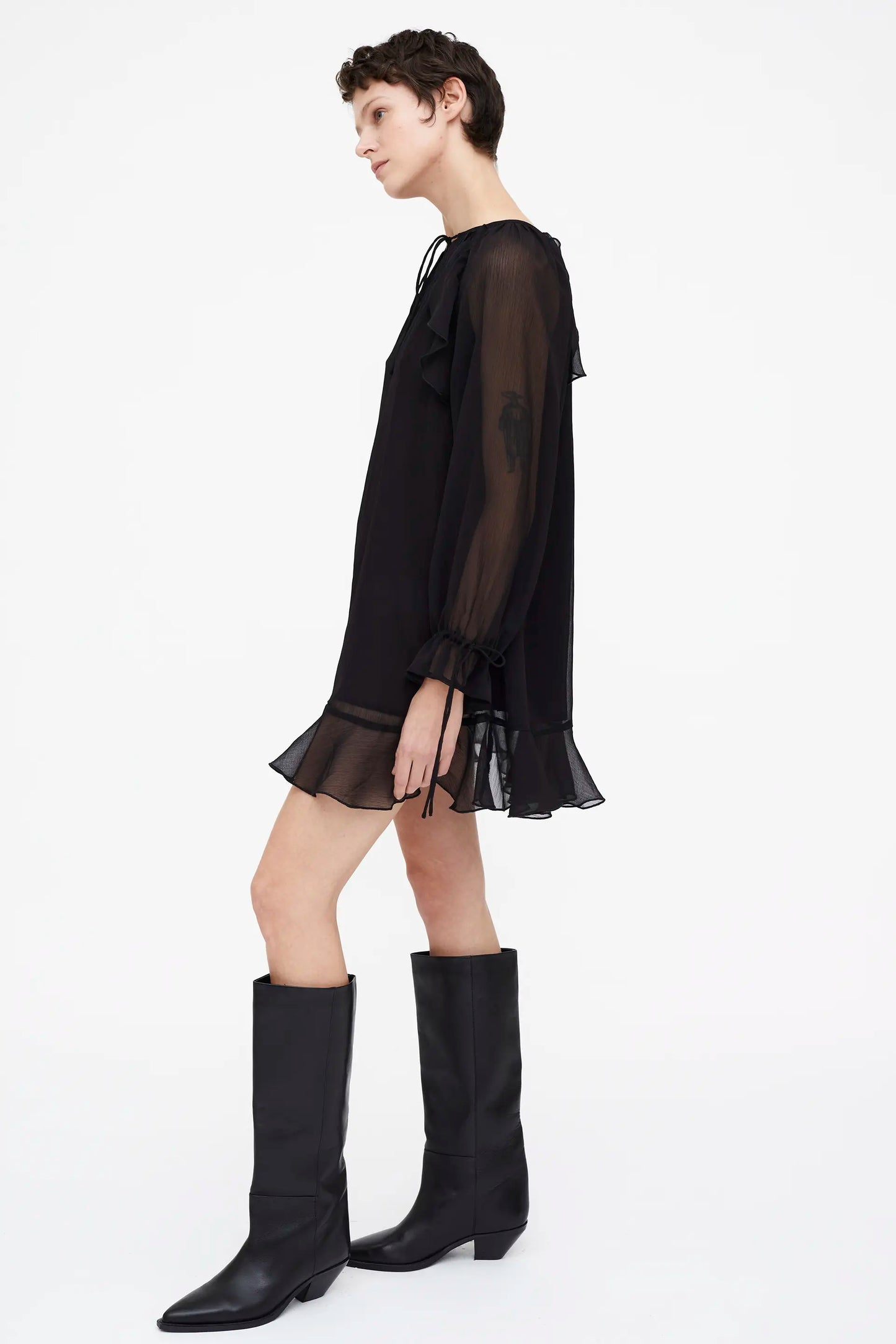 Short black chiffon dress. Boat neck with a knotted V-neckline. Long sleeves with cuffs and knotted details and ruffles. Lined.