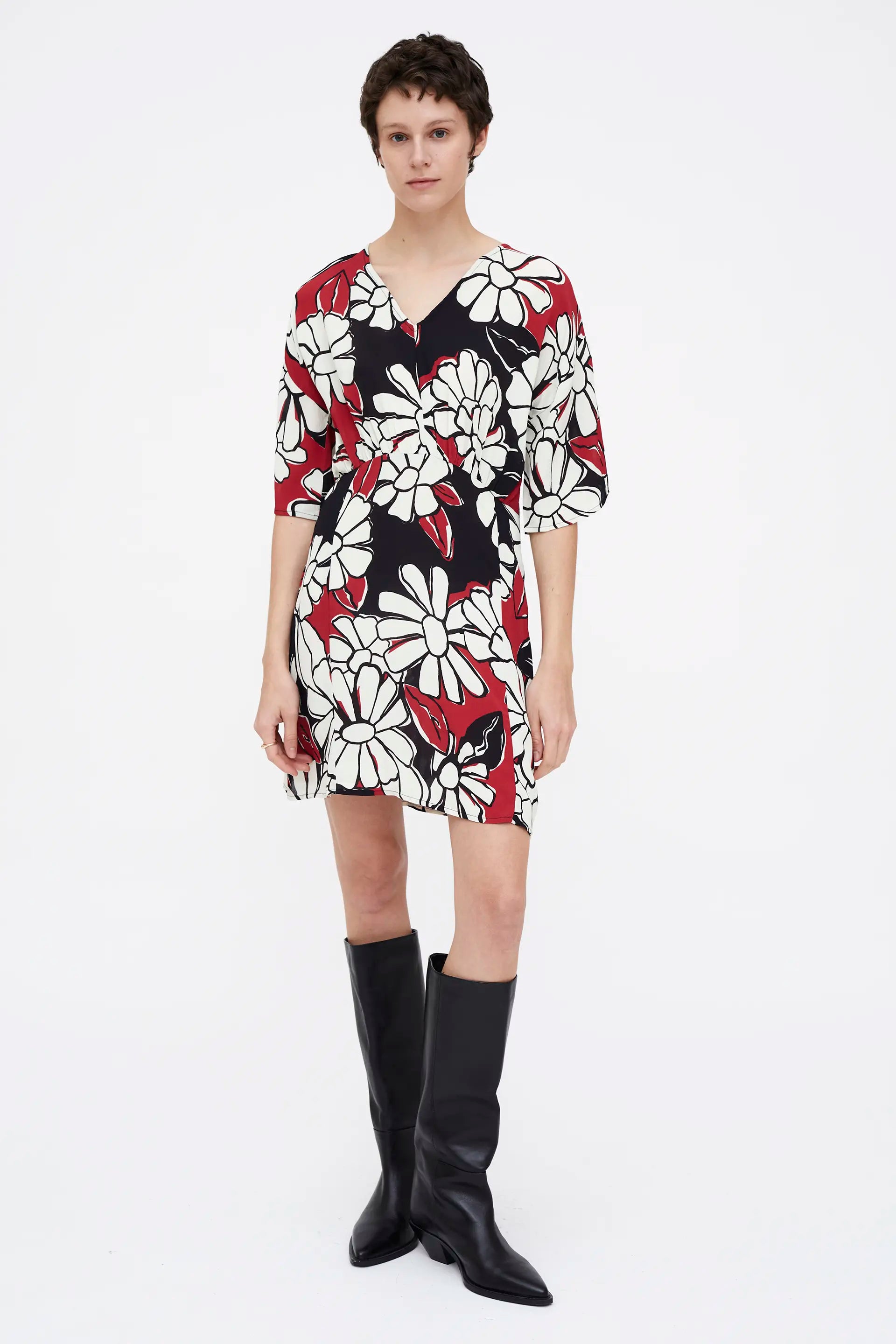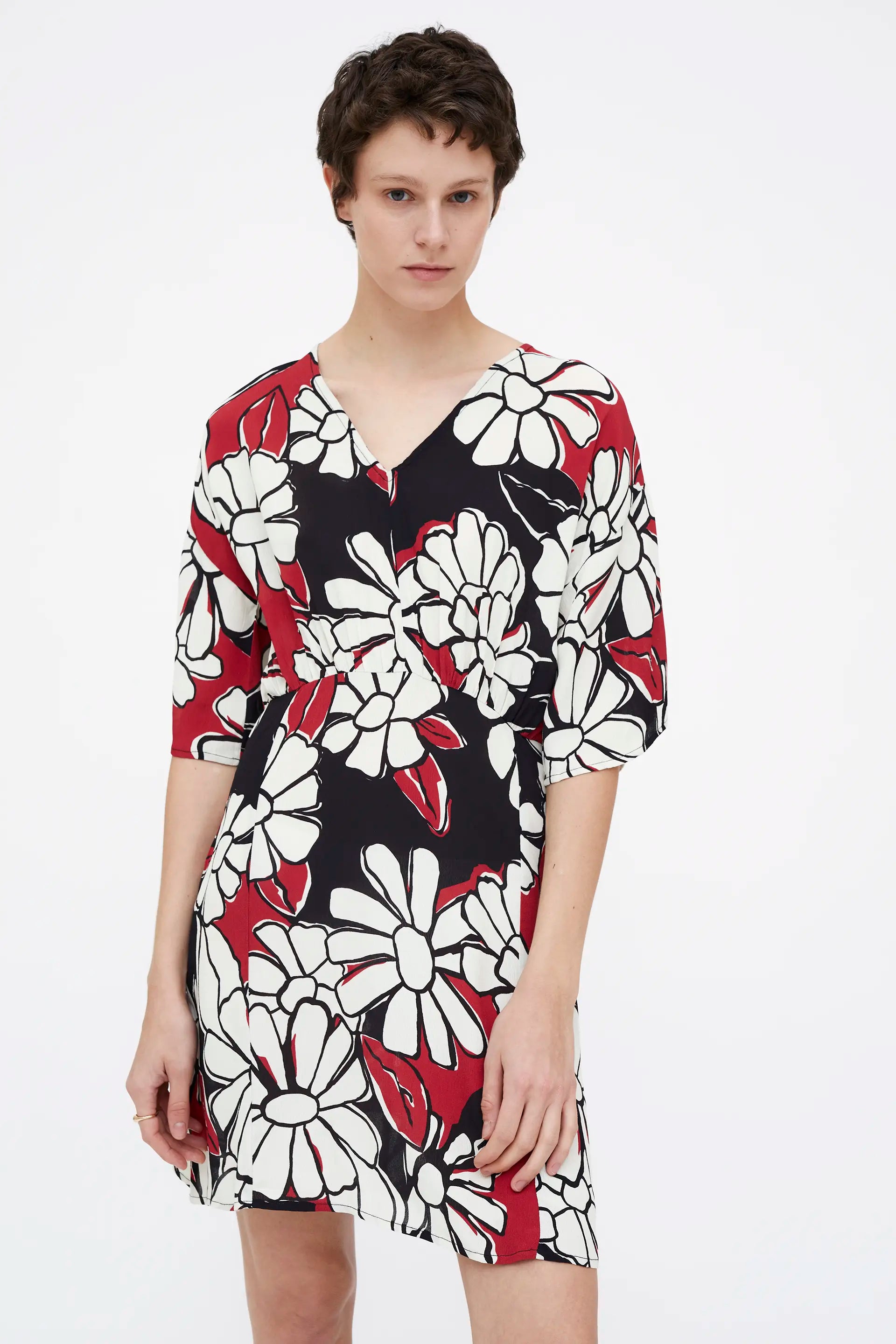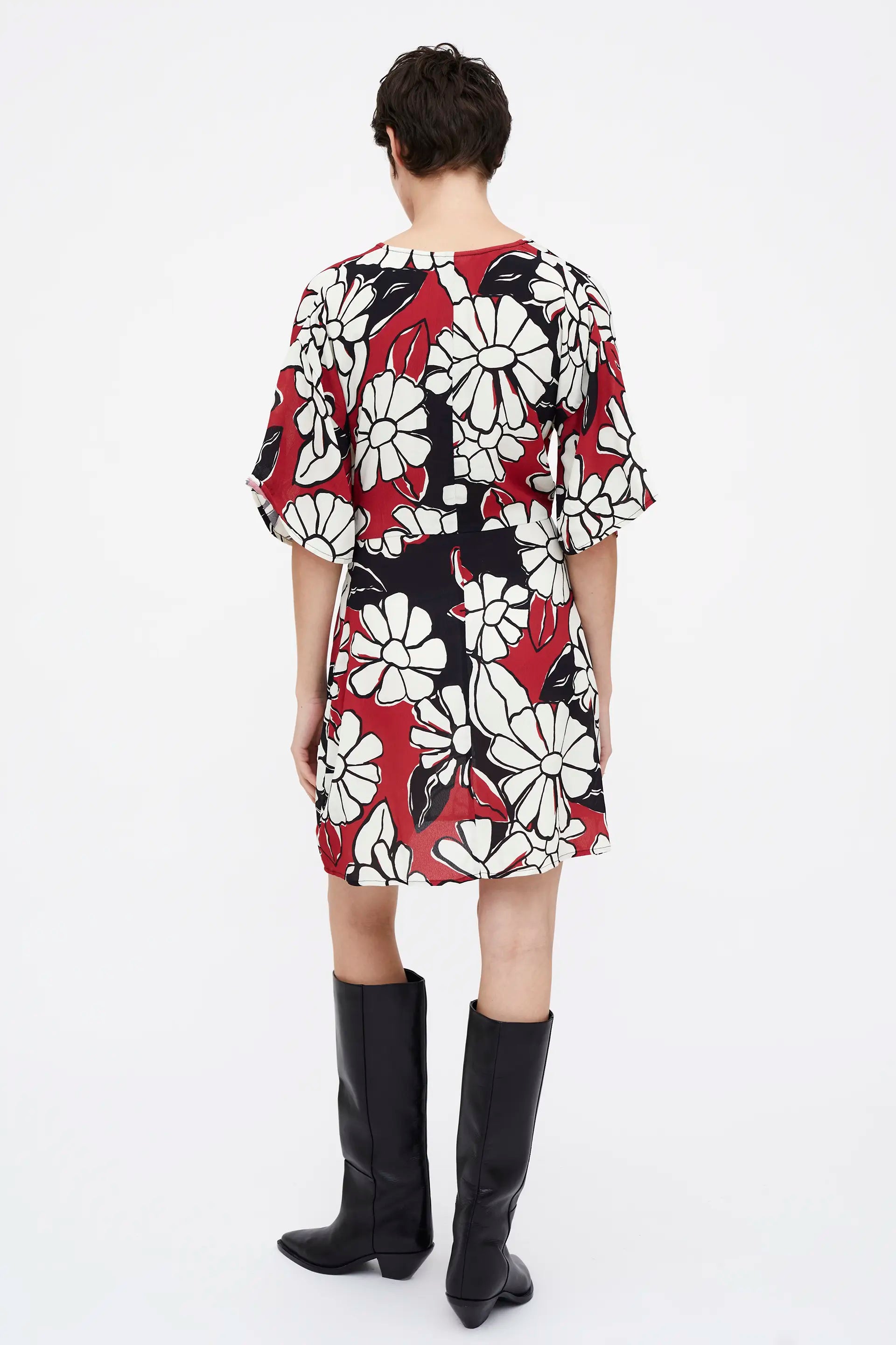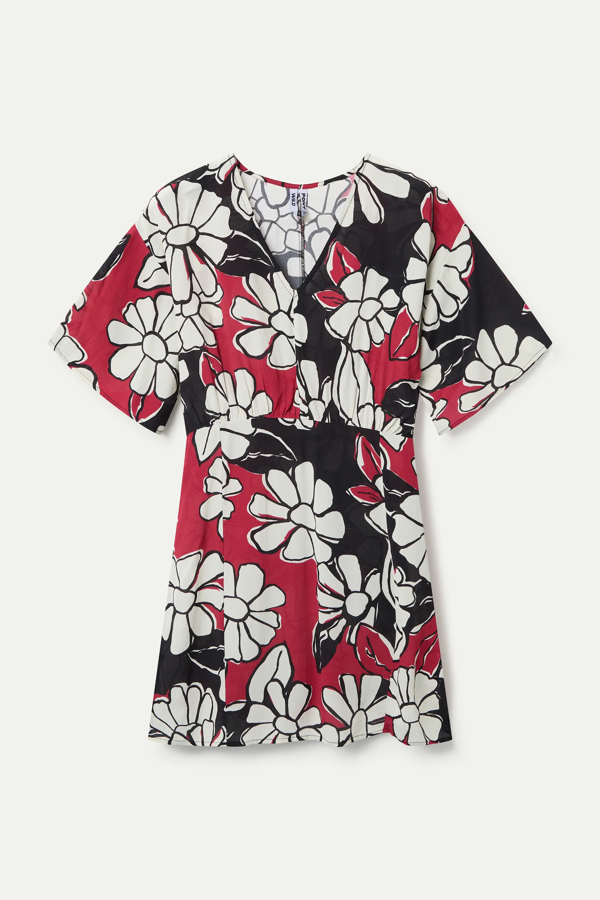 Short dress with a Blooming Sunset print. V-neck and wide short sleeves. Invisible side zipper.