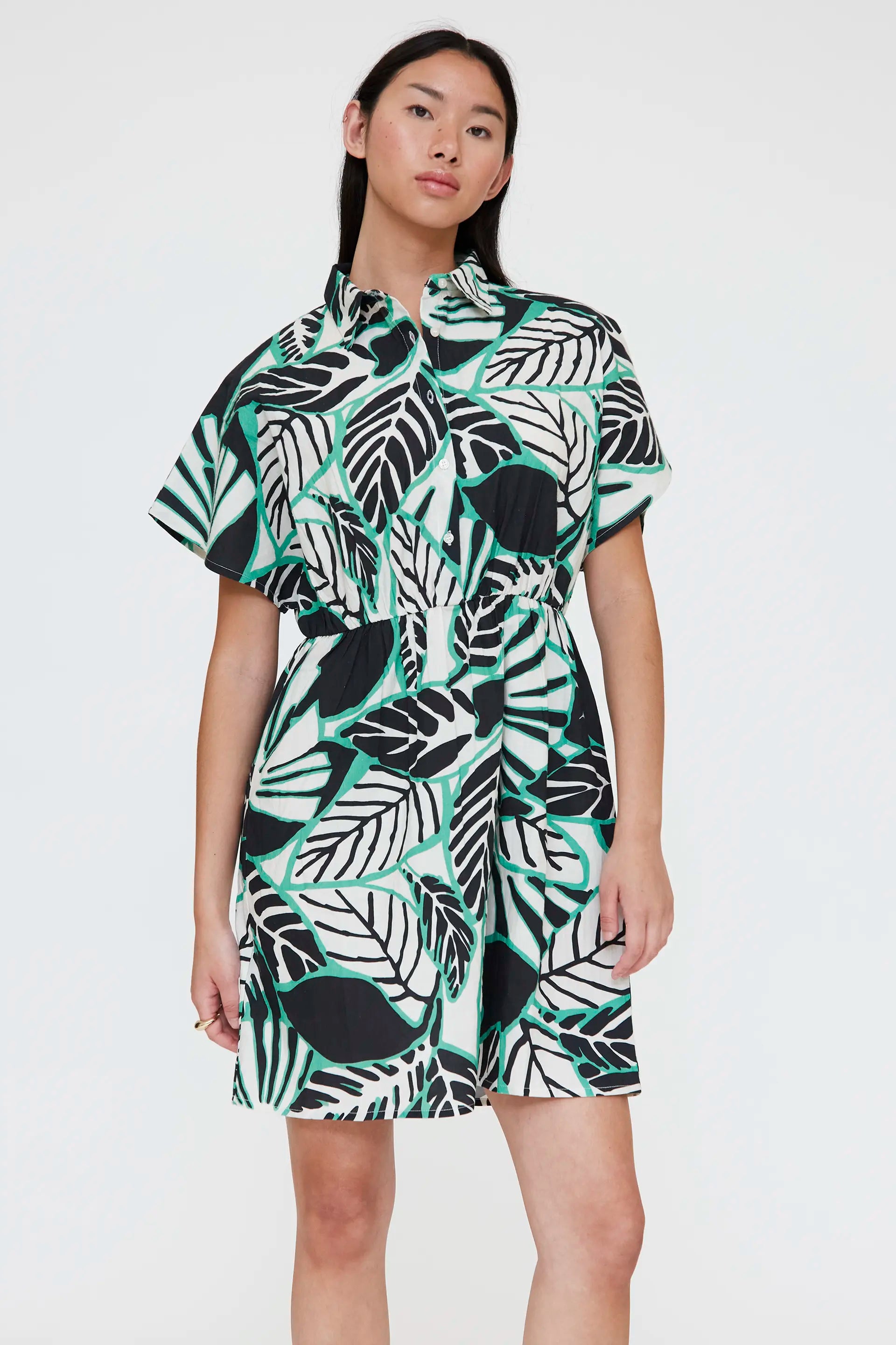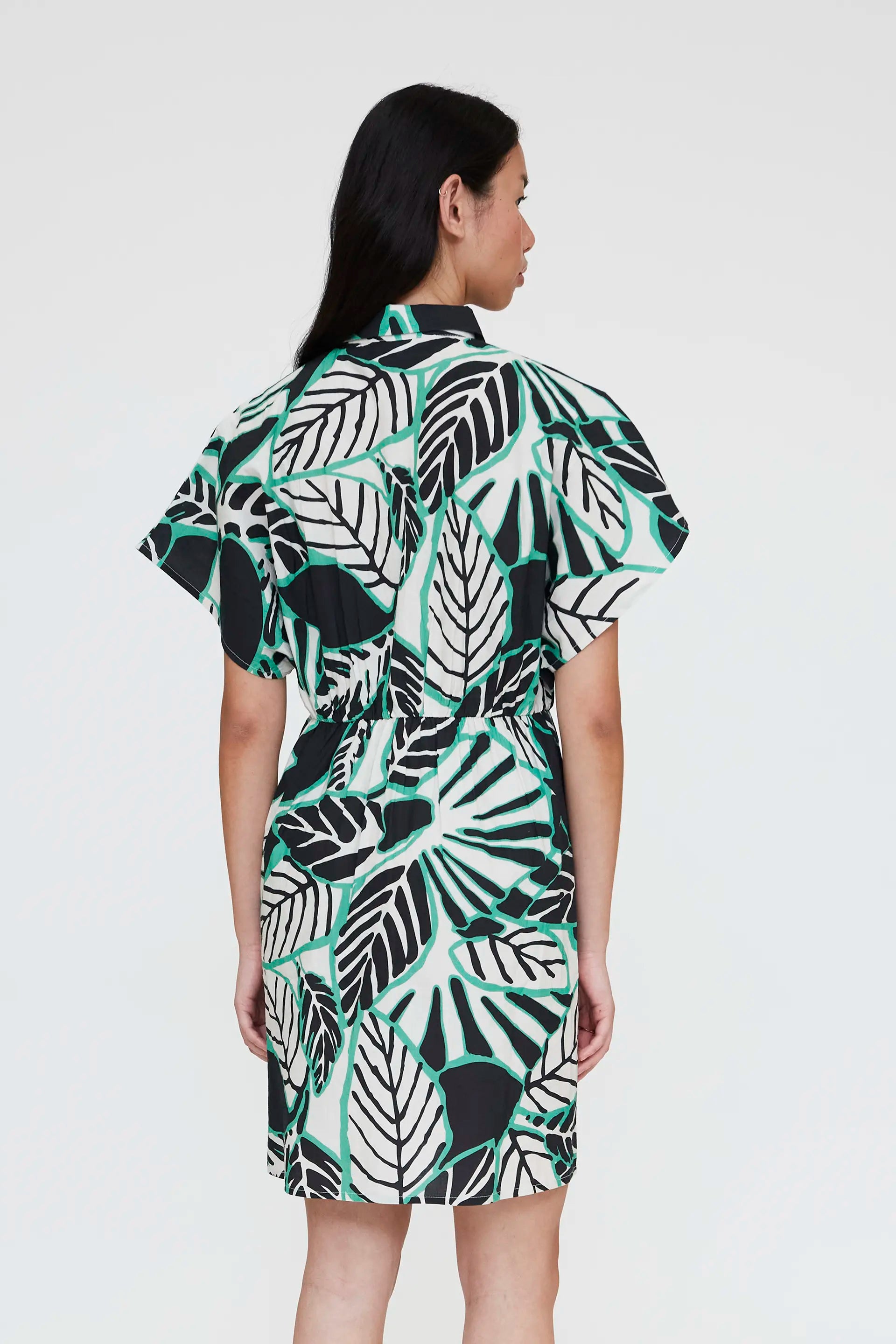 Short dress in 100% cotton with an iguana print. Lapel collar and short sleeves. Slightly dropped shoulder. Front button closure with white buttons. Pleated detail at the waist. The model is 173 cm tall and wears size S.