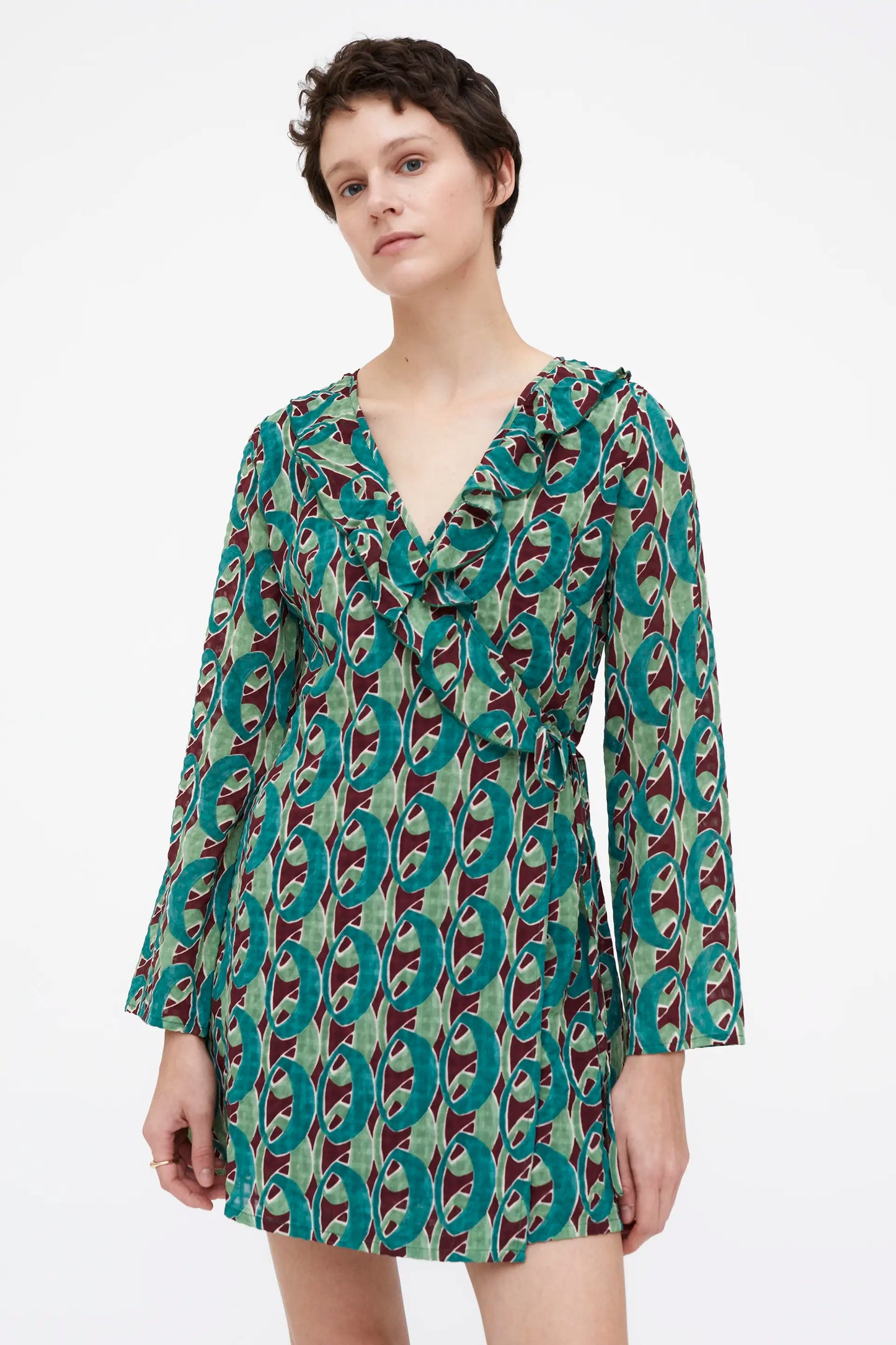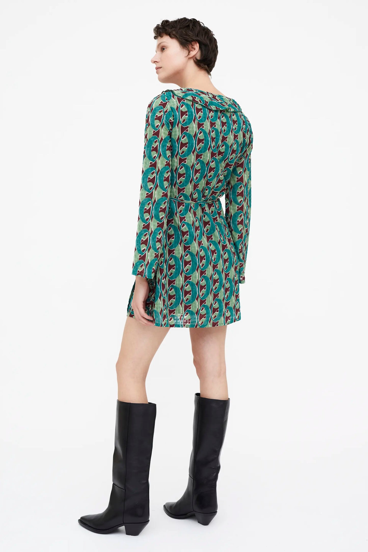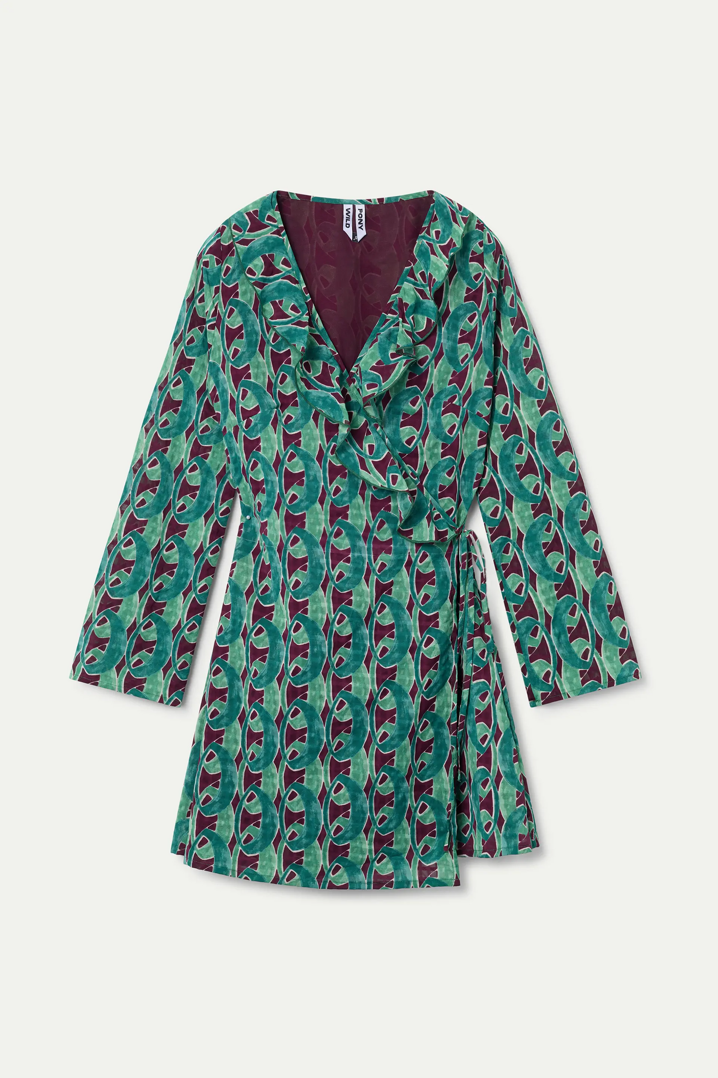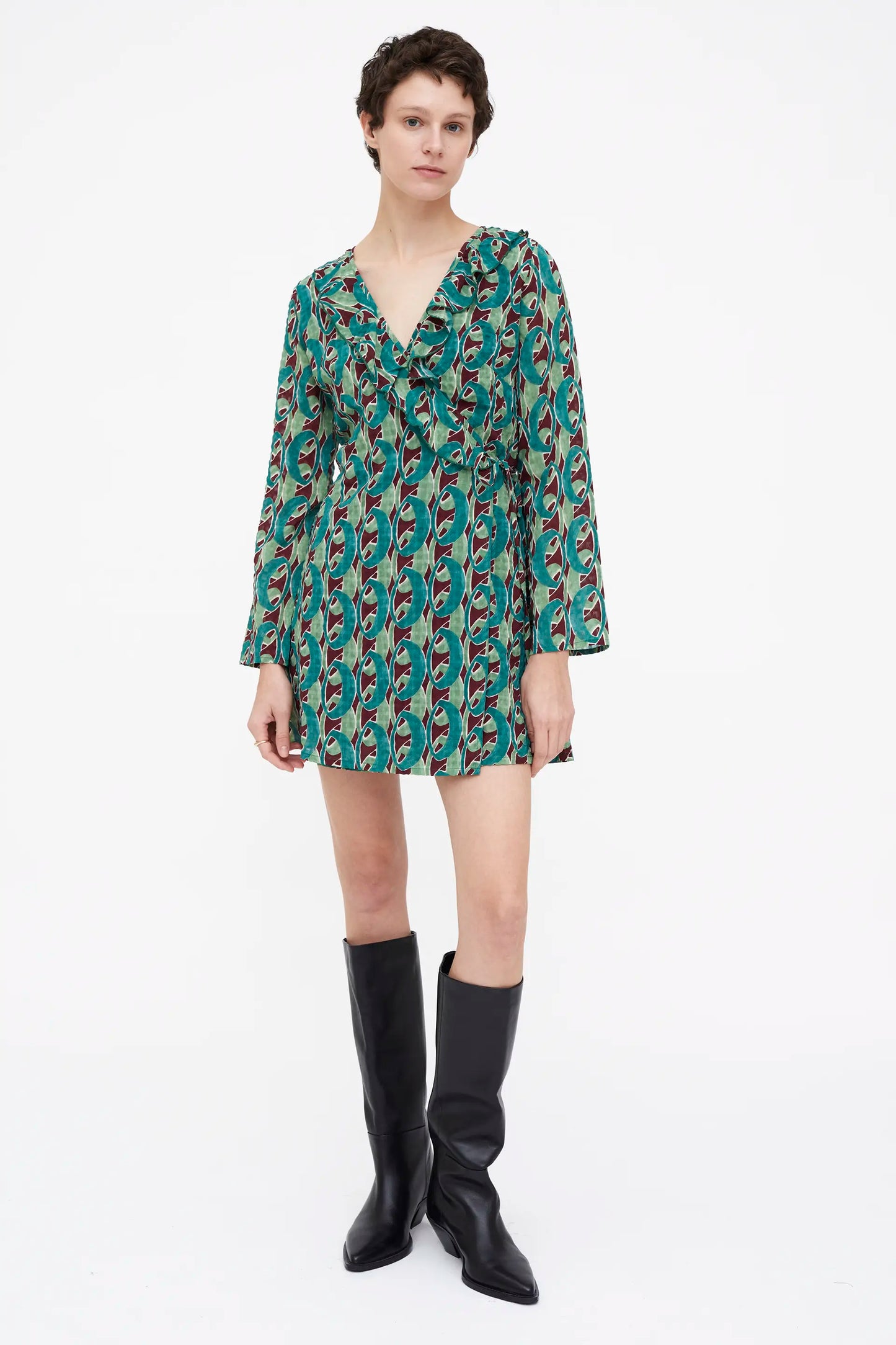 Jade Chain print short dress. Ruffled V-neck with a self-tie bow. Long, wide sleeves. Lined.
