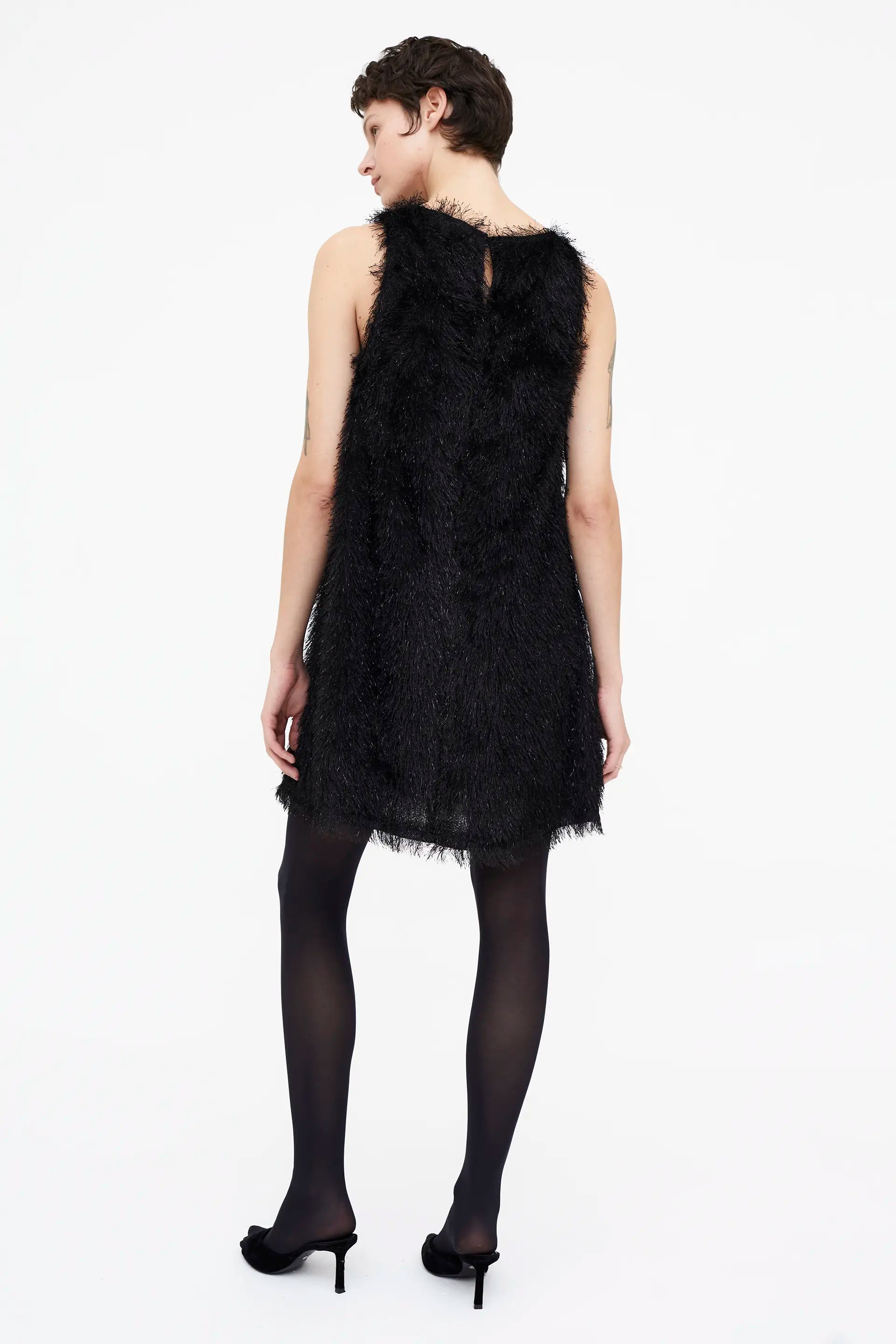 Short black dress with lurex threads. Sleeveless boat neckline. Button closure at the back.