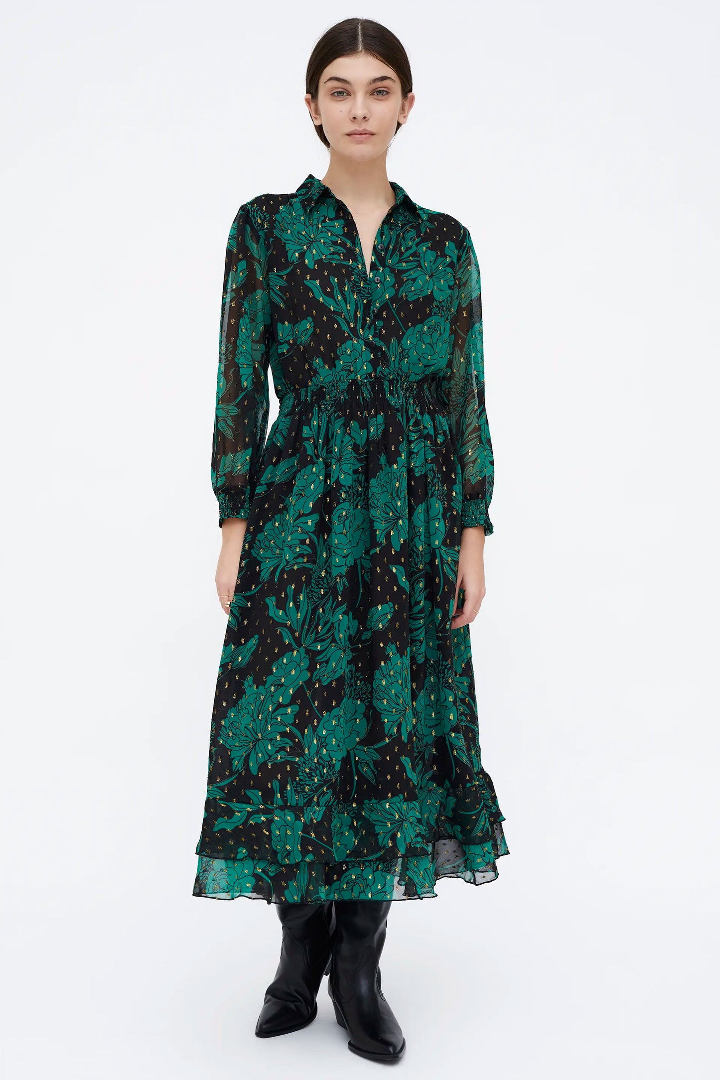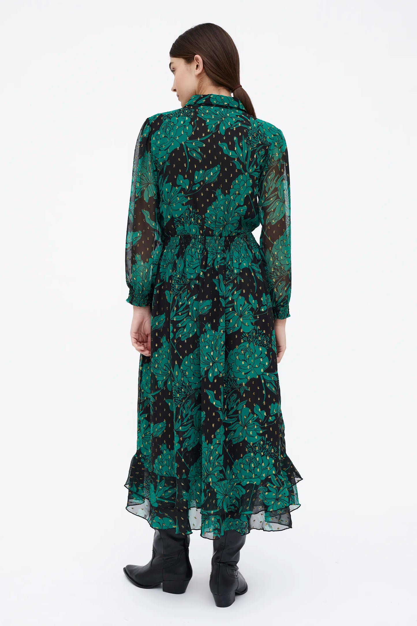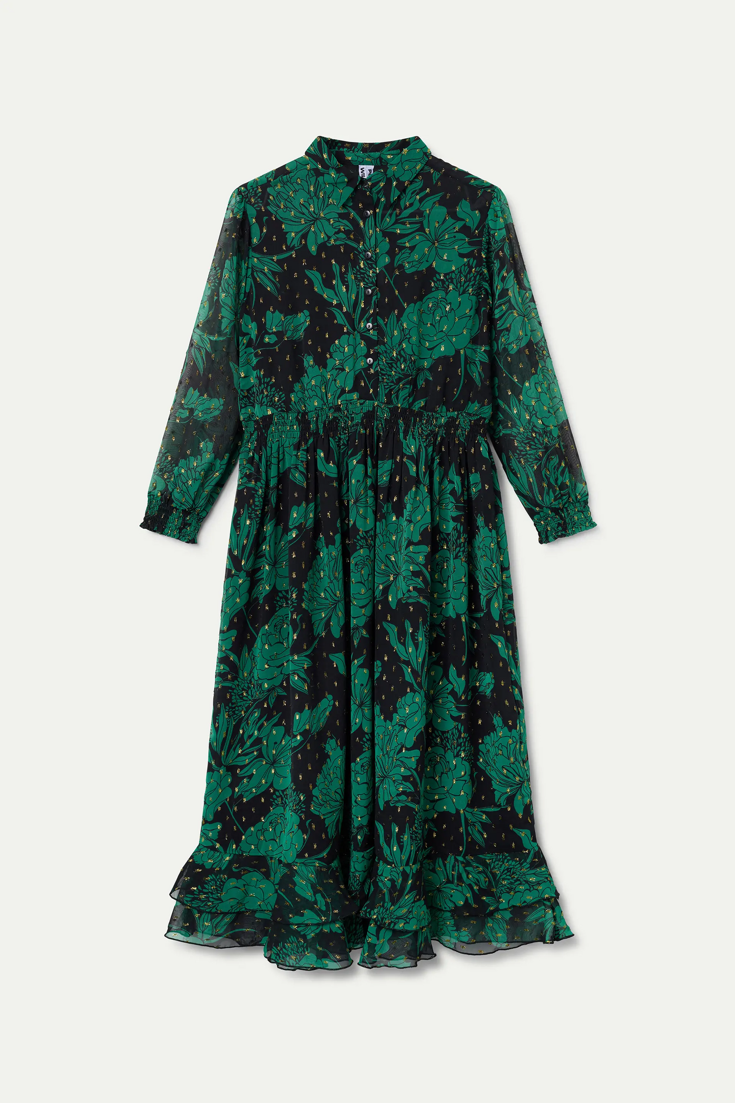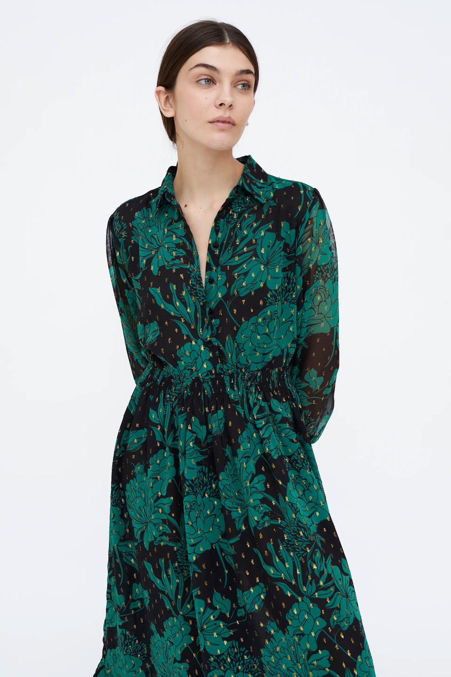 Long dress with Wild Flower print. Lapel collar and long sleeves. Slightly crinkled fabric with a fluid drape. Lined. With gathered waist. Lined.