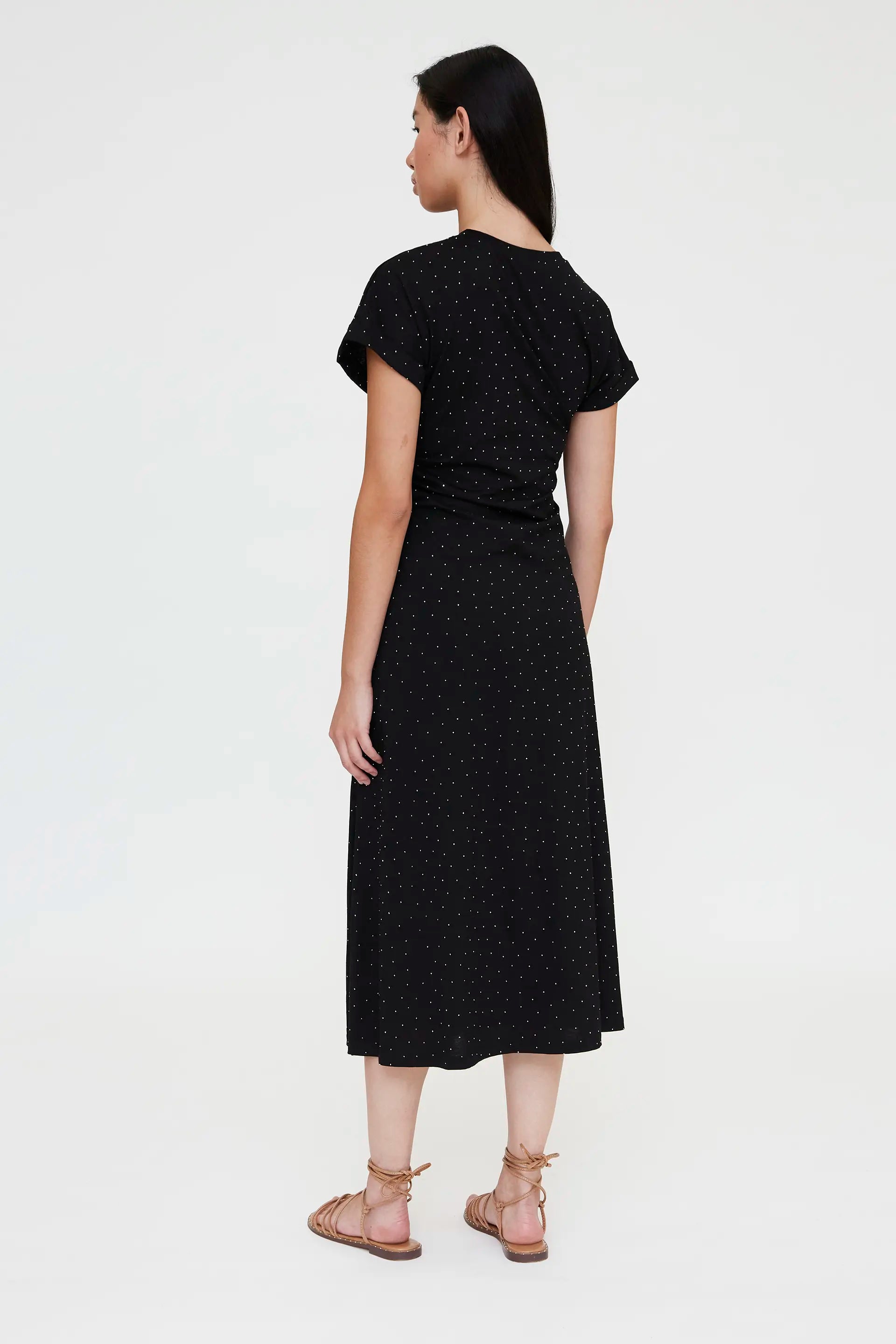 Black midi dress in 100% cotton. Round neck and short sleeves with turn-ups. Appliqué details and a side slit. The model is 173 cm tall and wears size S.