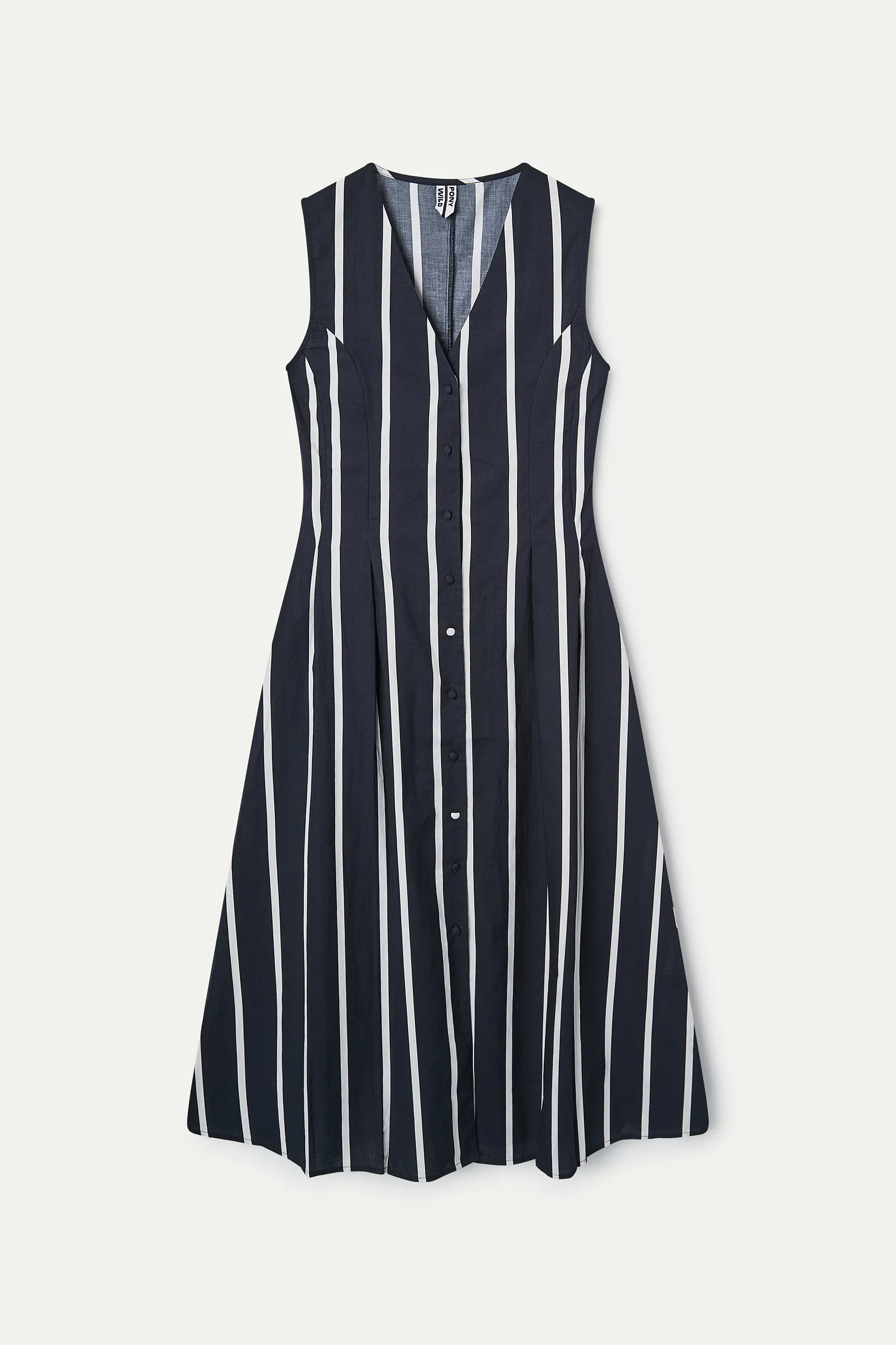 Midi dress in 100% cotton with a Grimaud Black print. Features a V-neck and is sleeveless. Front button closure with covered buttons. The model is 173 cm tall and wears size S.