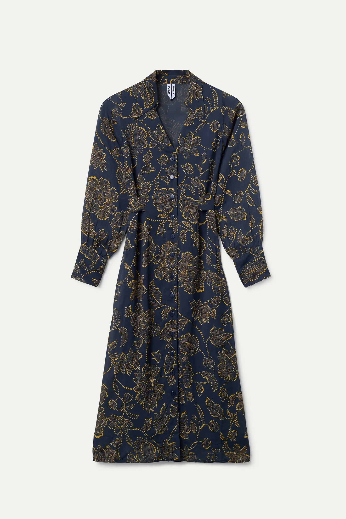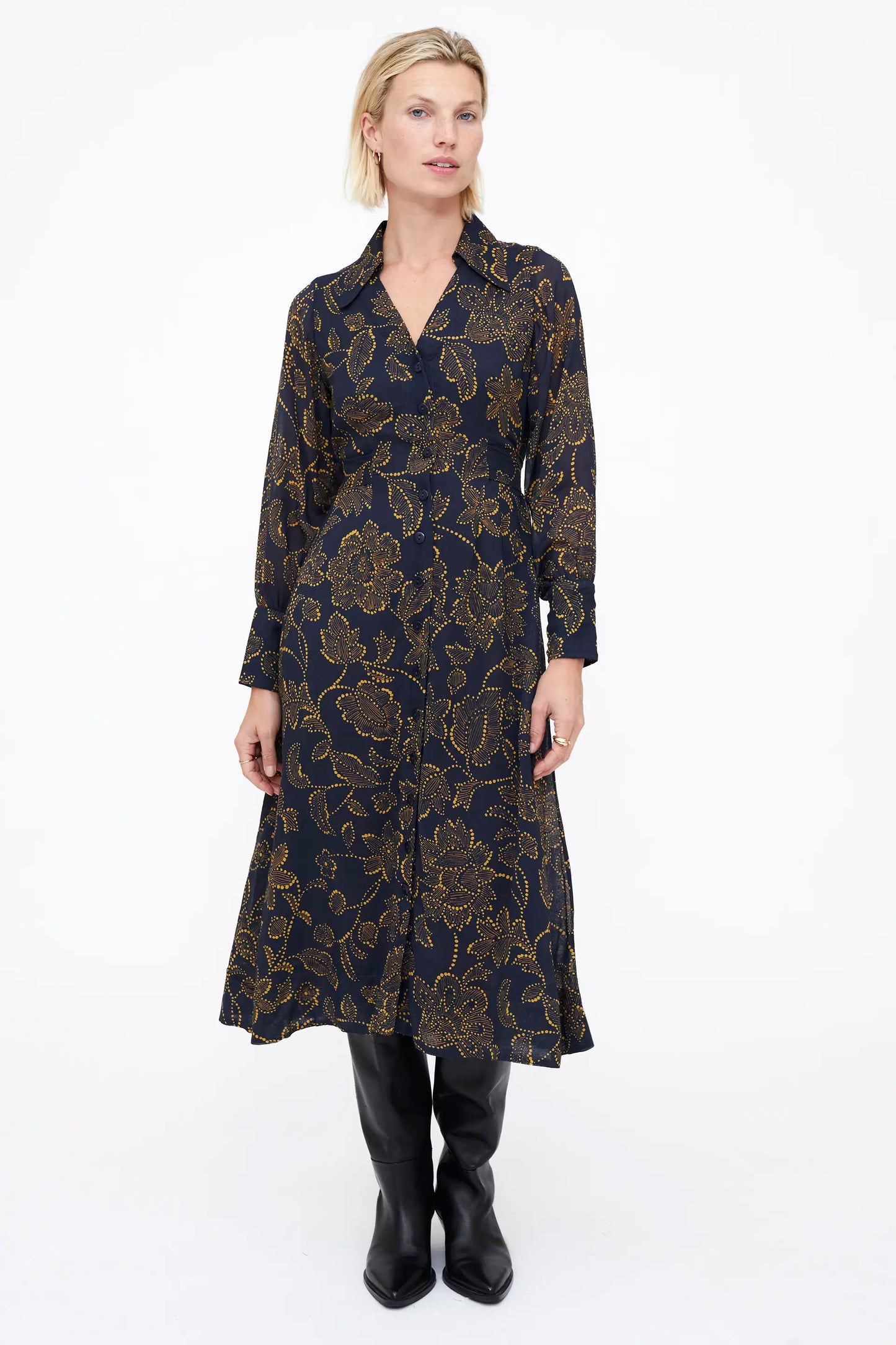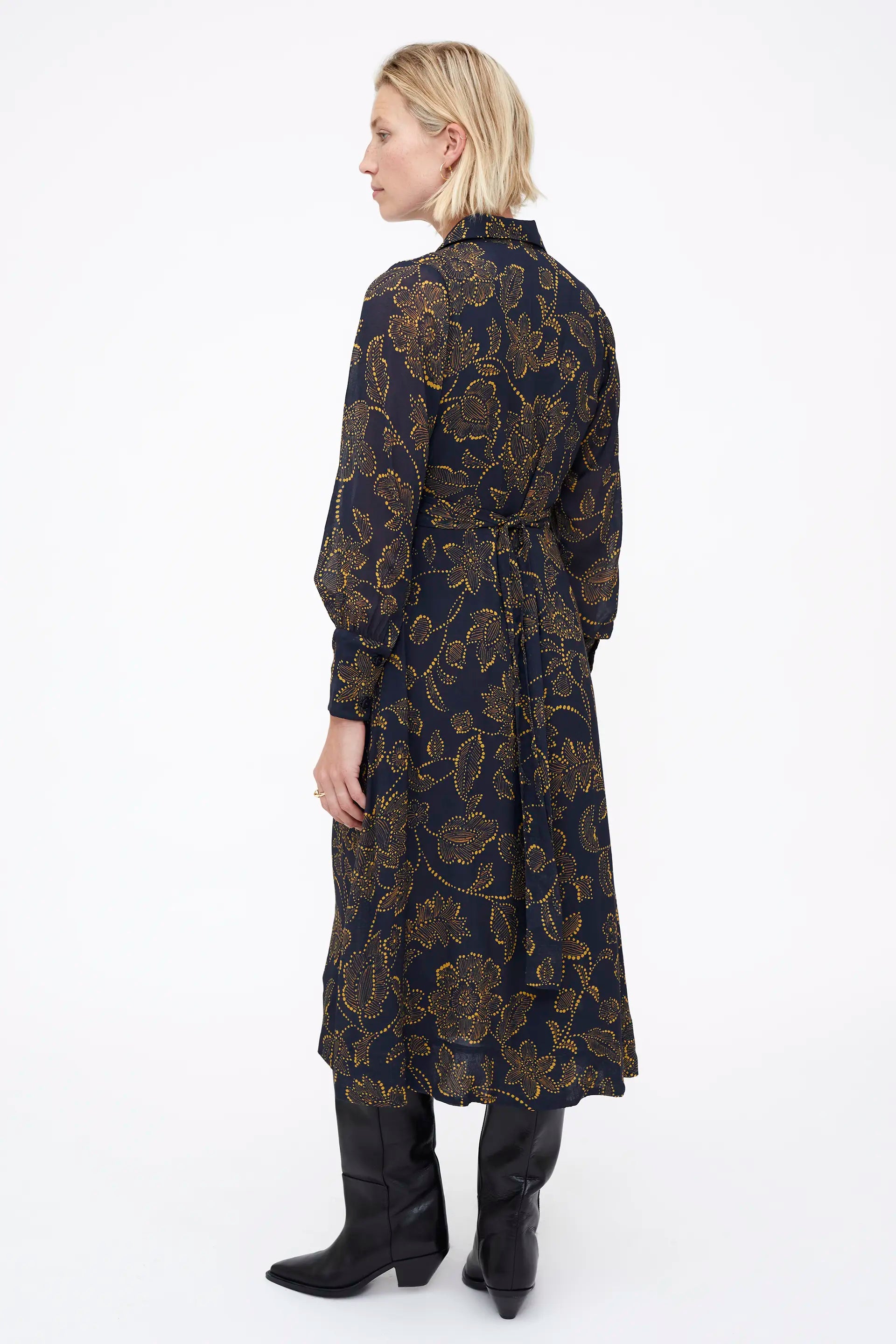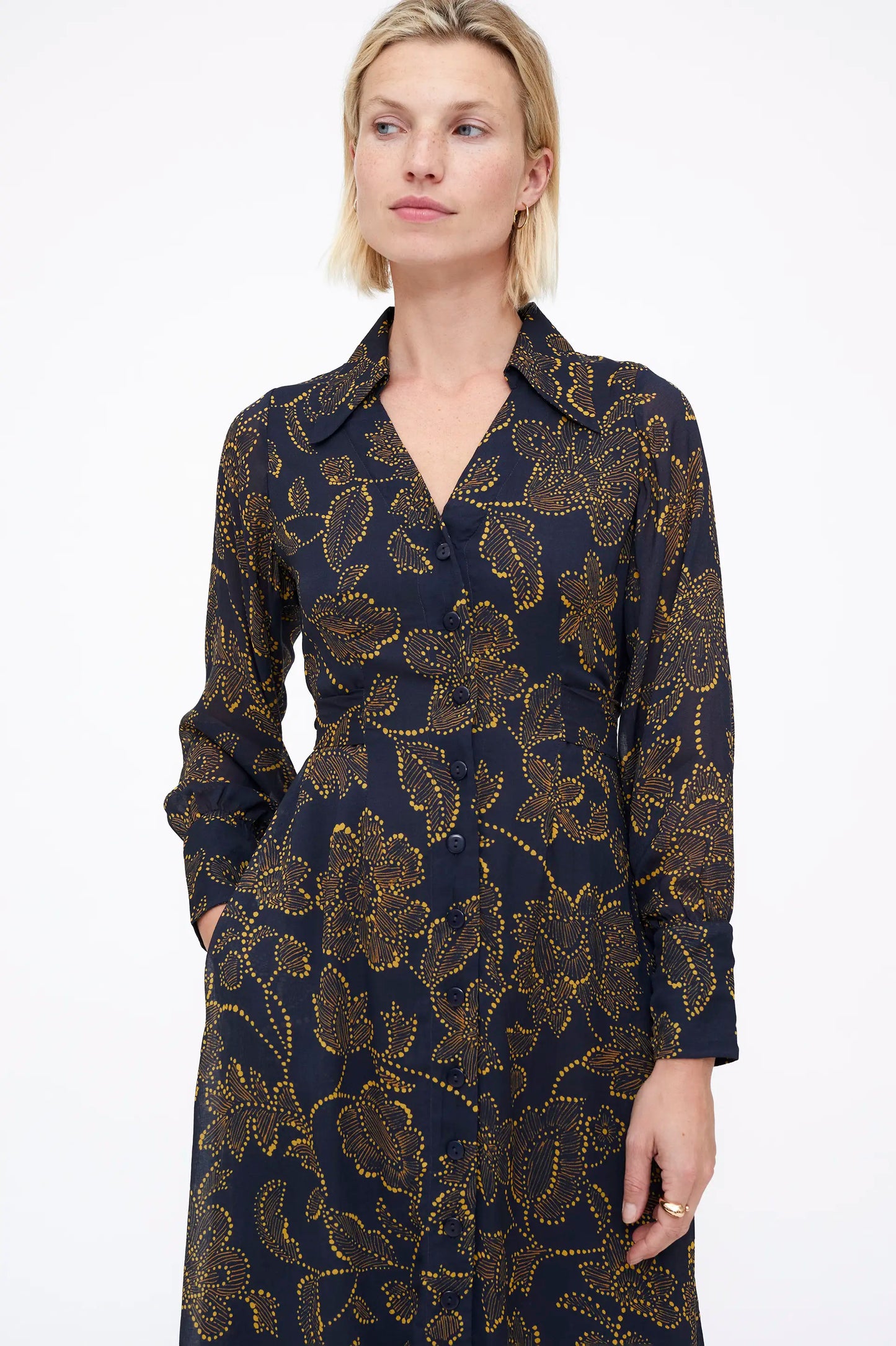 Mustard Flower print midi dress. Lapel collar and V-neck. Long sleeves with buttoned cuffs. Front button closure with a tie. Lined.