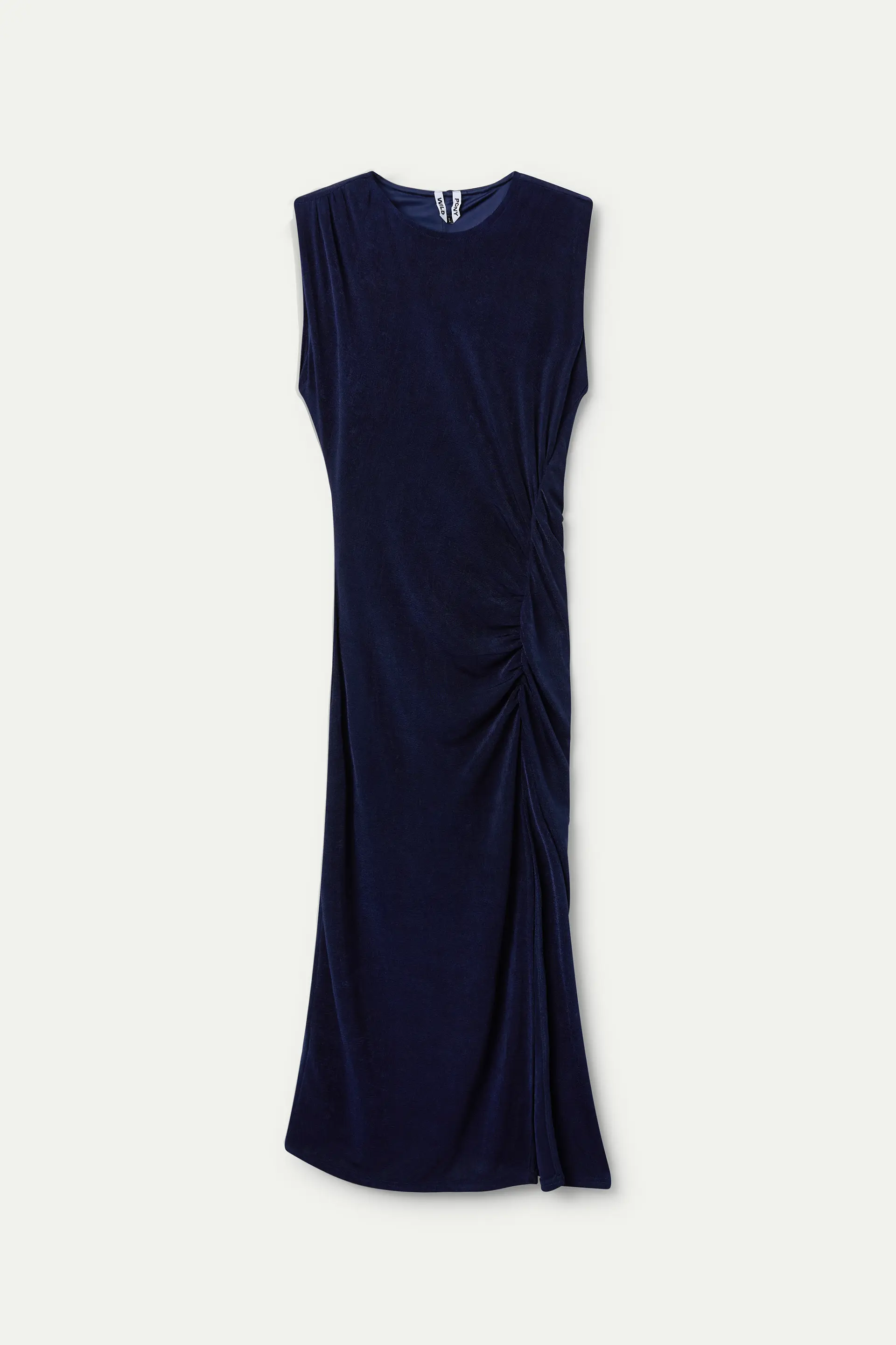 Navy blue ruched midi dress with side ruching. Sleeveless design with a slight slit on the side.