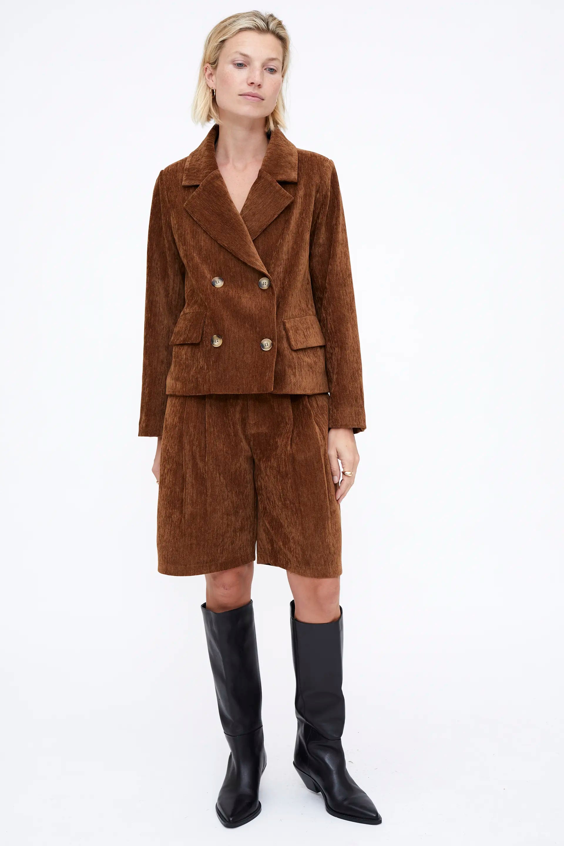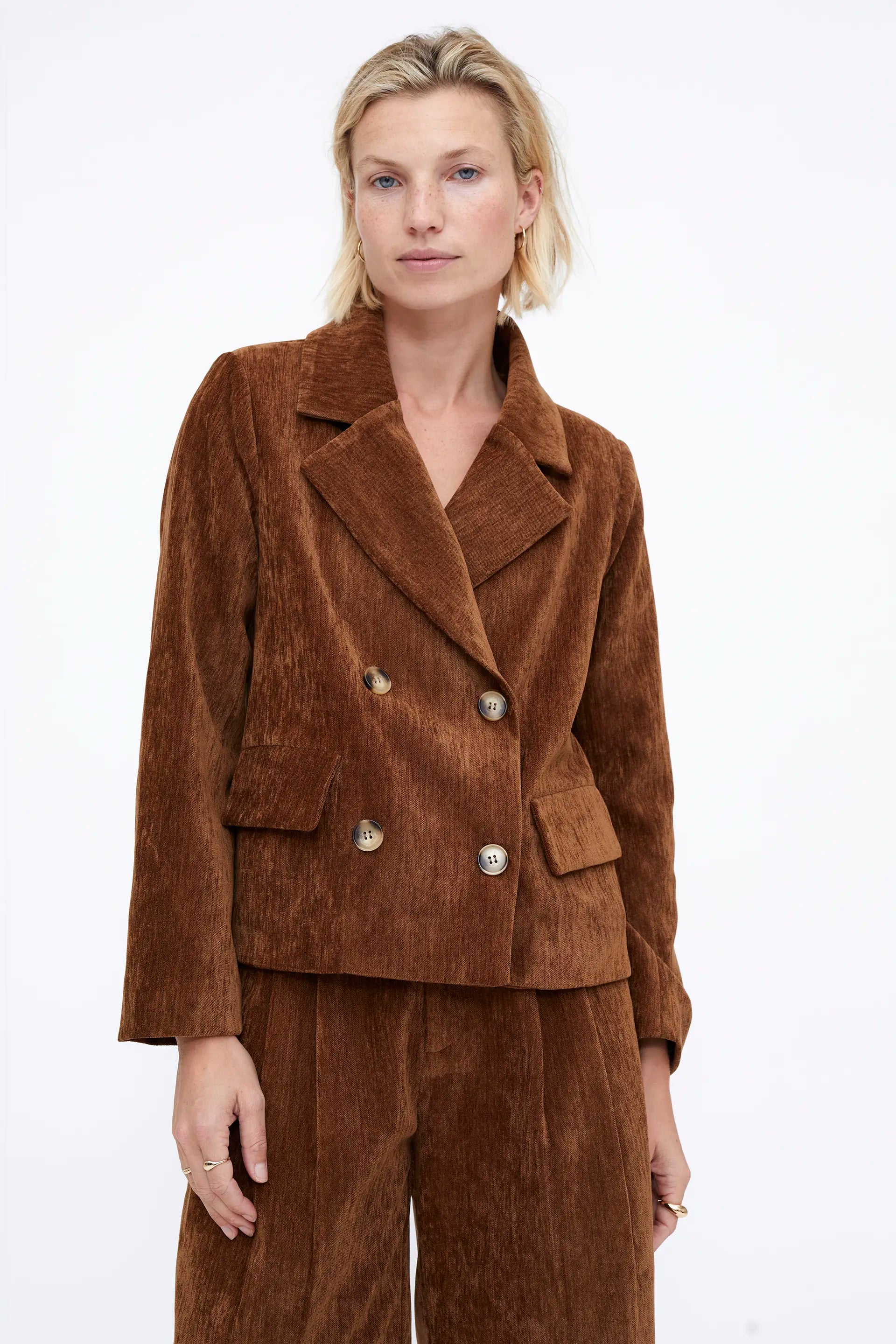 Blazer con efecto aterciopelado de color marrón. Con cuello solapa y manga larga. Cierre frontal con botones. Bolsillos de solapa frontales.
