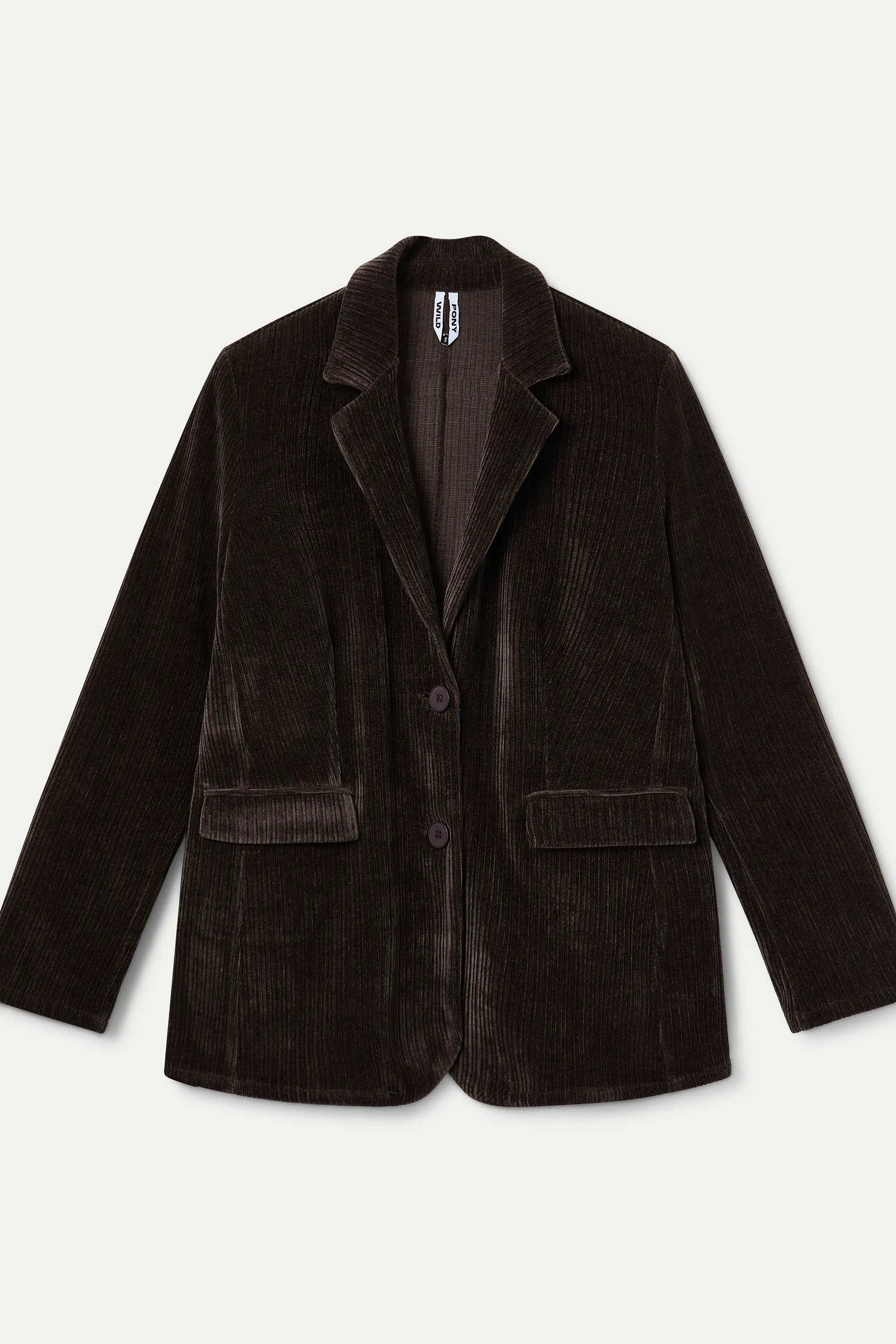 Blazer pana de terciopelo color marrón. Con cuello solapa y manga larga. Cierre frontal con botones. Bolsillo de solapa frontales.