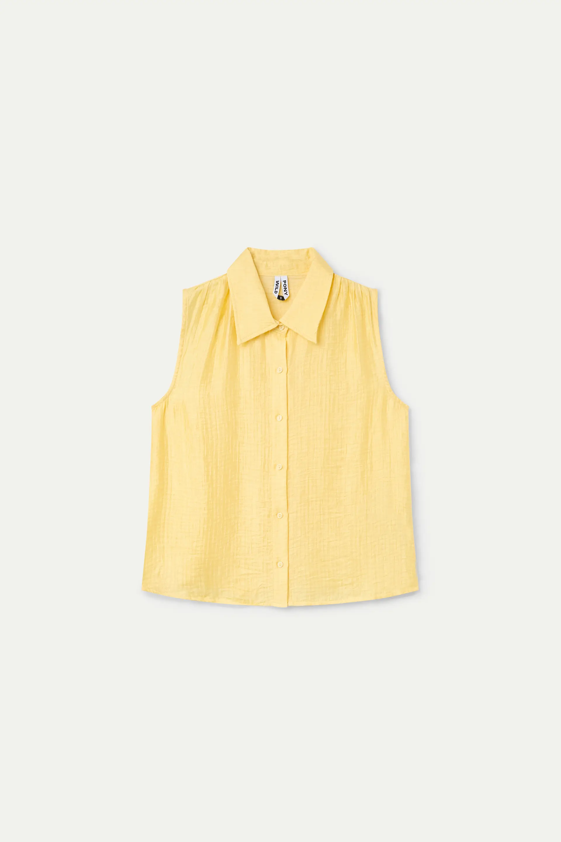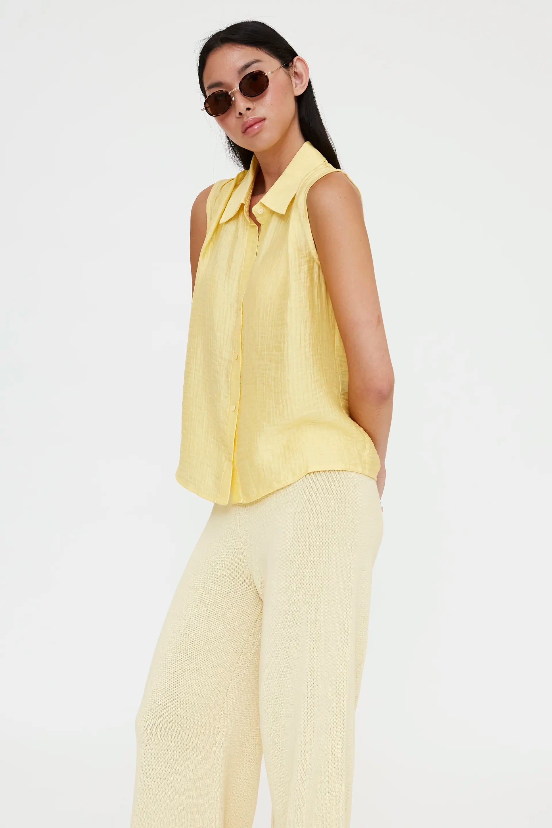 Camisa de color amarillo. Con cuello solapa y sin mangas. Cierre frontal con botones. La modelo mide 173 cm y lleva la talla S.