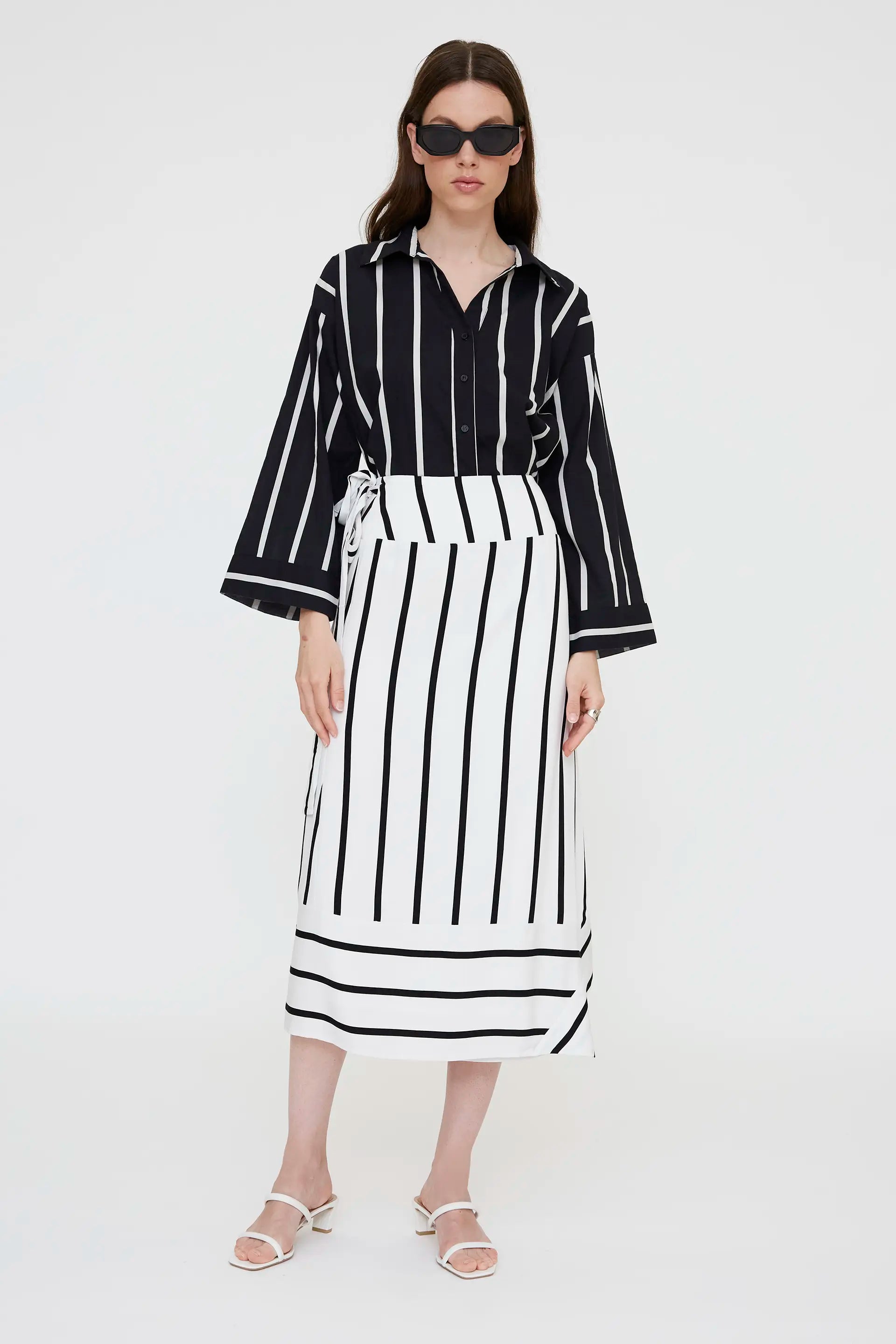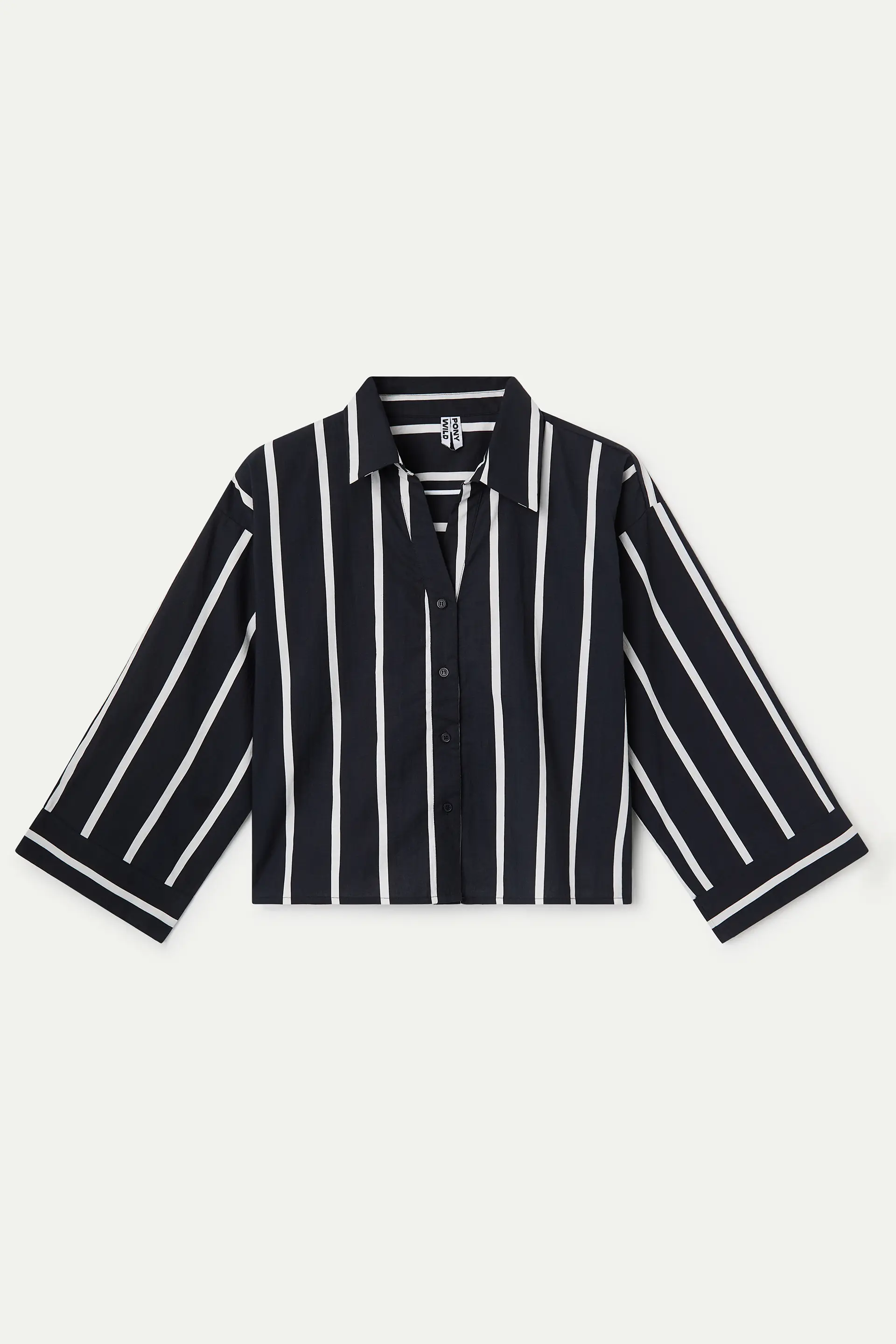 Camisa fluida de tejido 100% algodón con estampado Grimaud Black. Cuello solapa y escote pico. Manga larga amplia. Hombros ligeramente caído. Cierre frontal con botones. La modelo mide 178 cm y lleva la talla S.