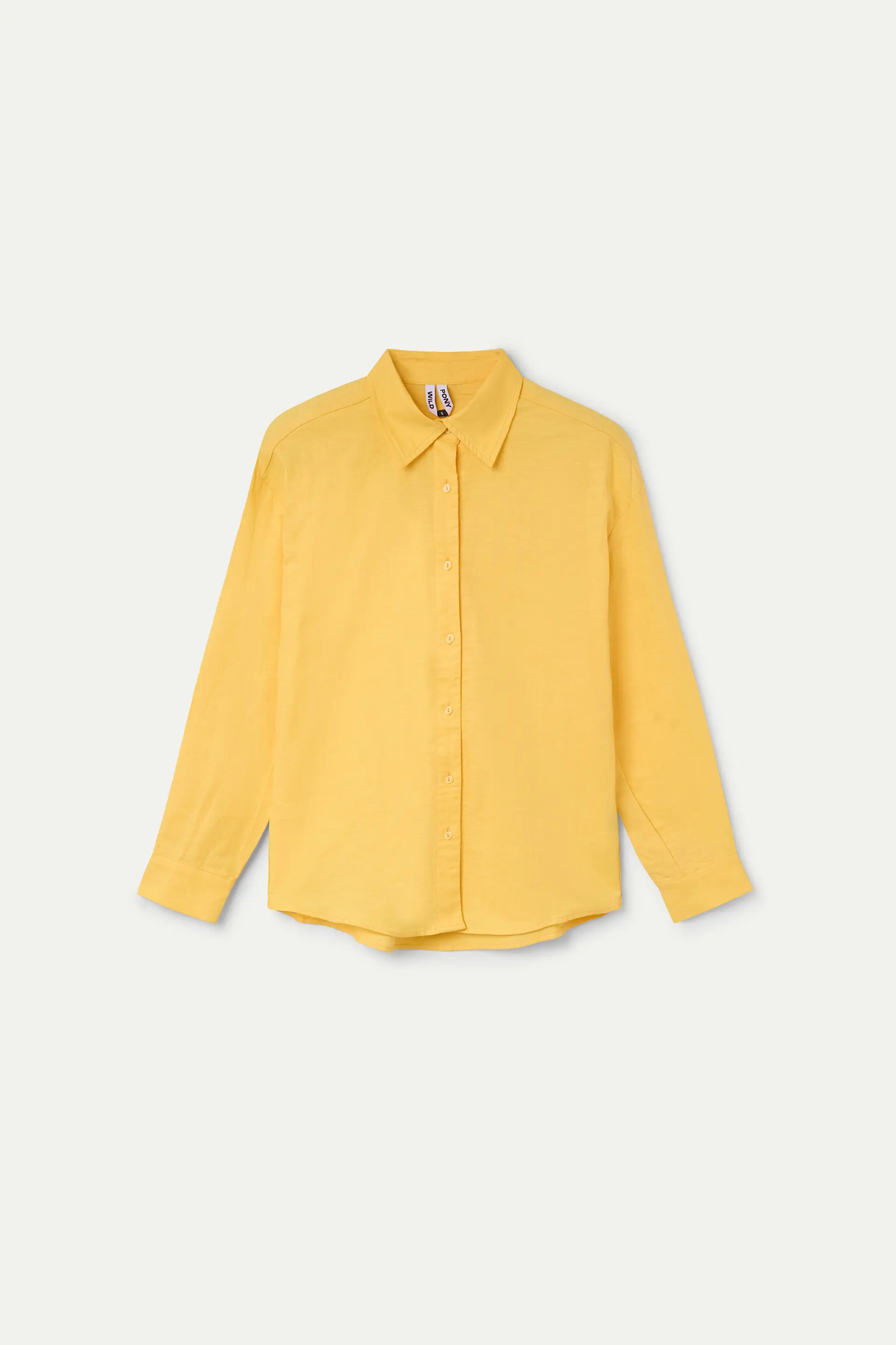 Camisa con mezcla de tejido lino y algodón de color amarillo. Cuello con solapa y manga larga terminada en puño con botón. Cierre frontal con botones. La modelo mide 178 cm y lleva la talla S.
