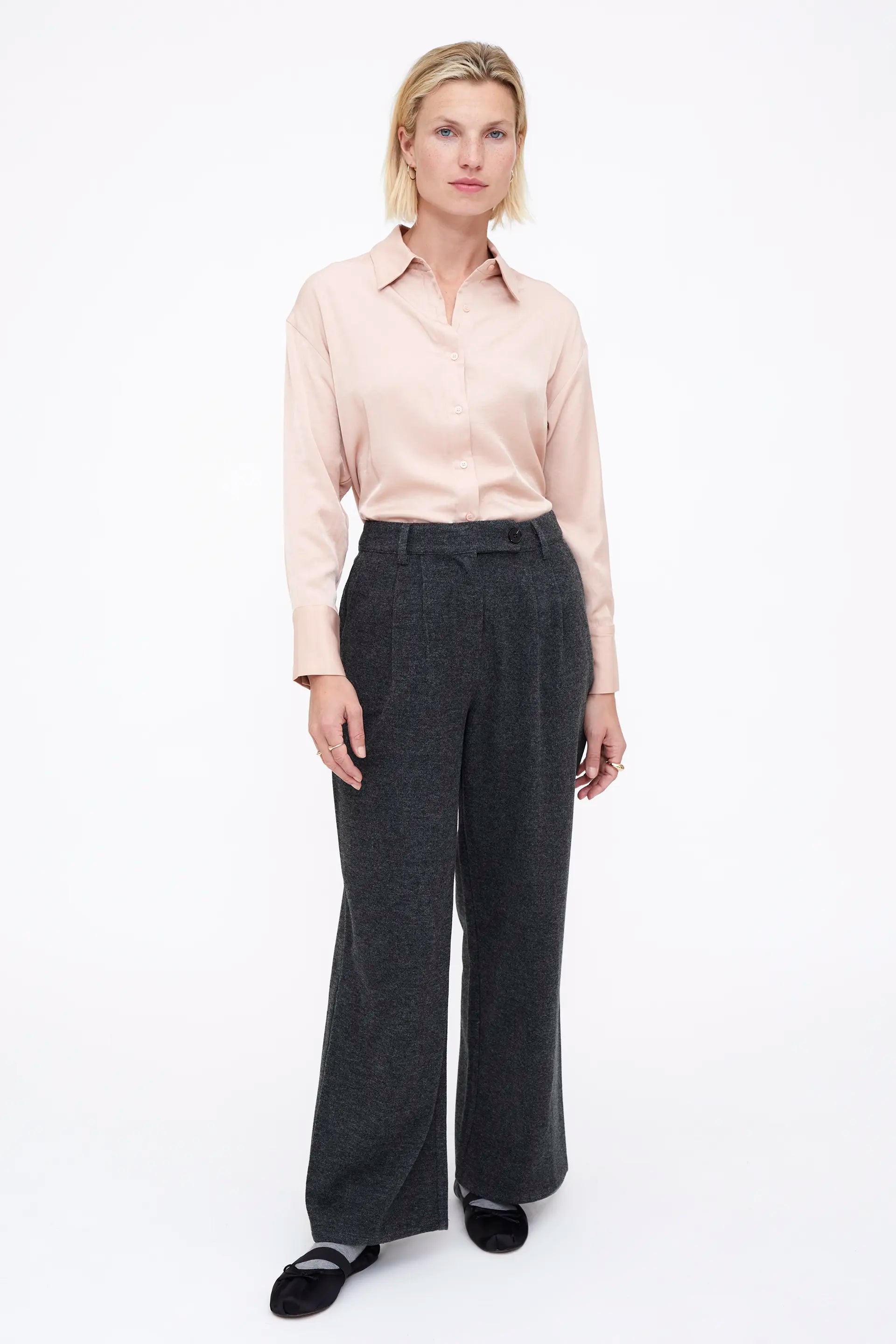 Camisa de color rosa crepé satinado. Con cuello solapa y manga larga terminada en puño doble botón. Cierre frontal con botones.