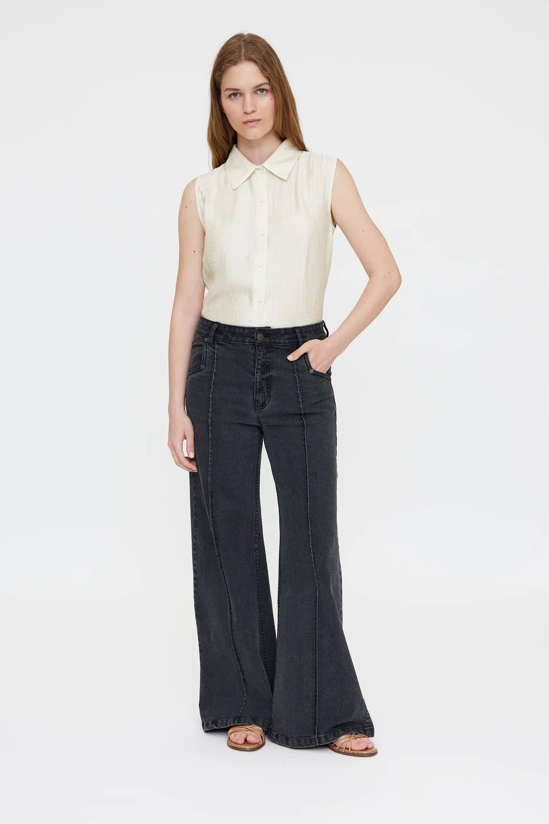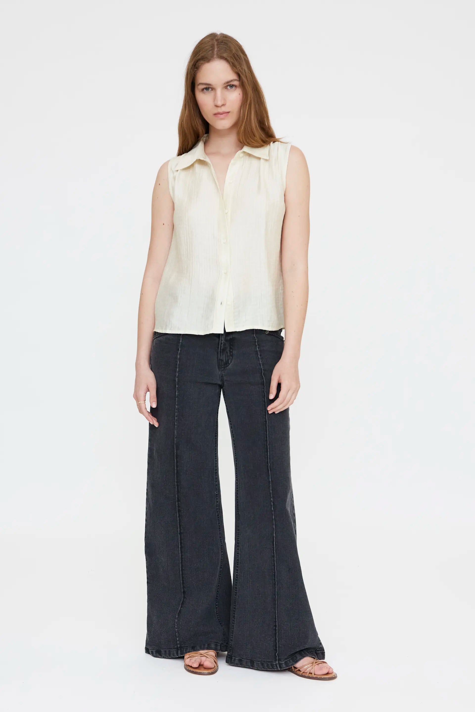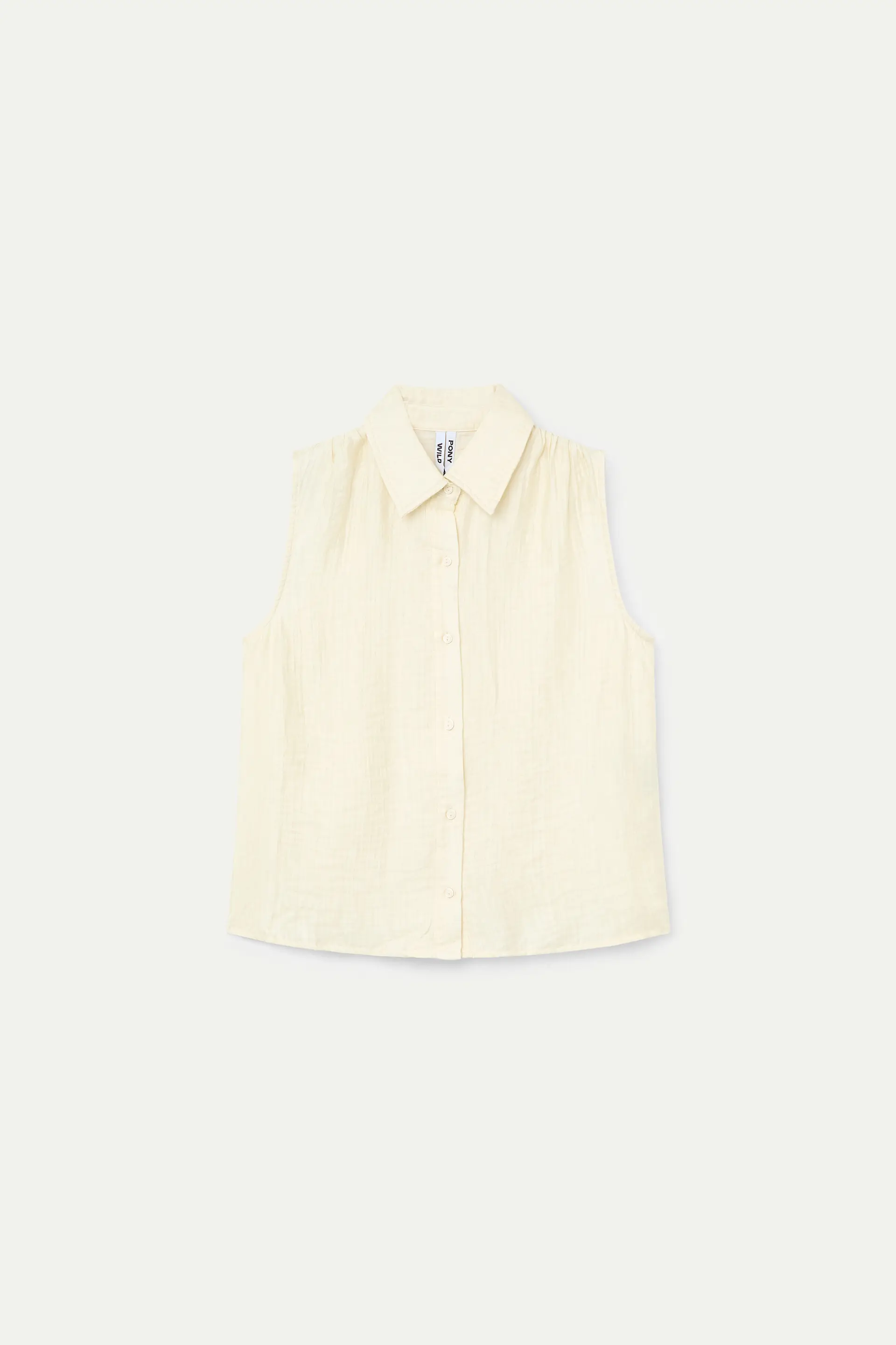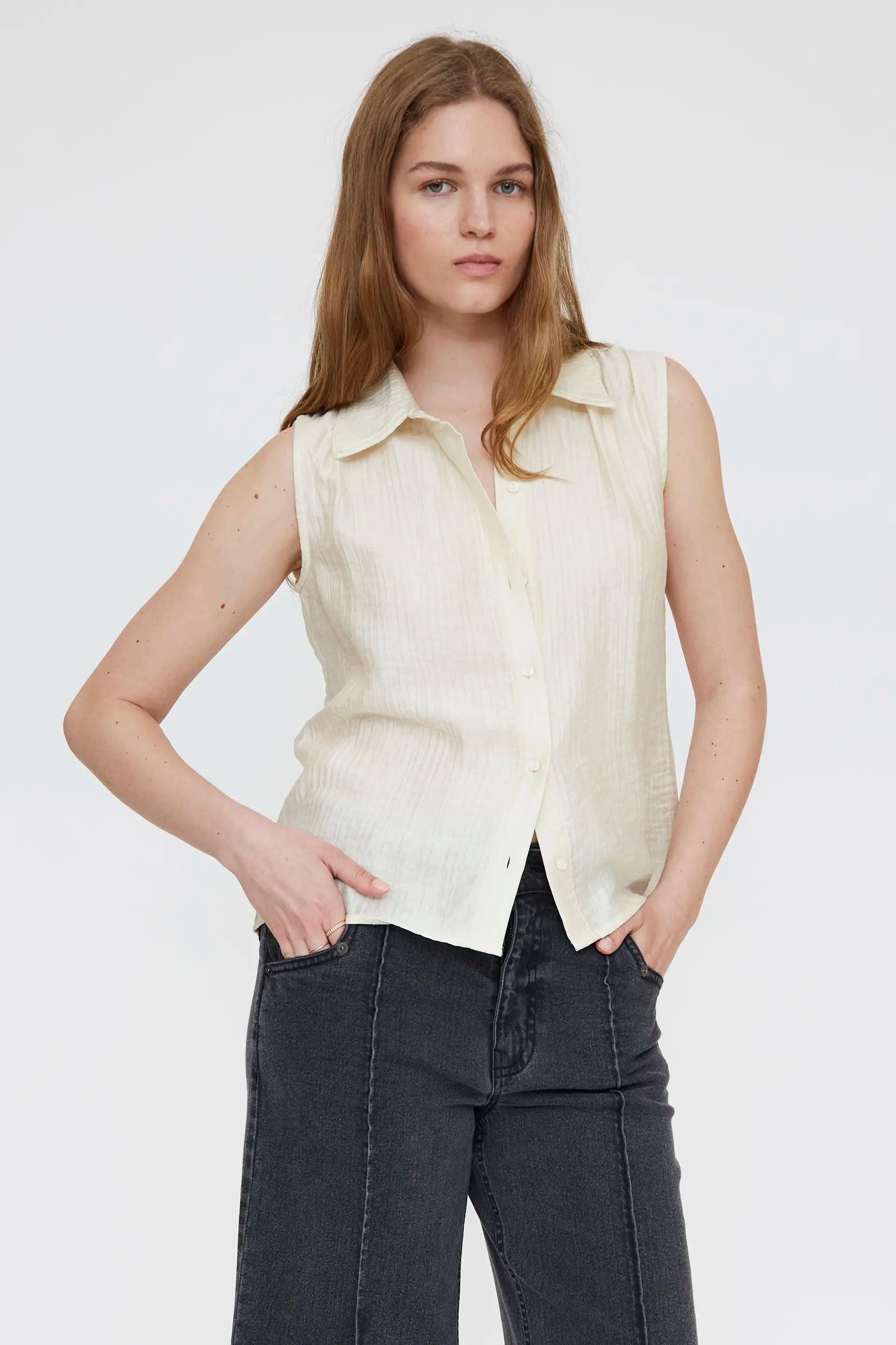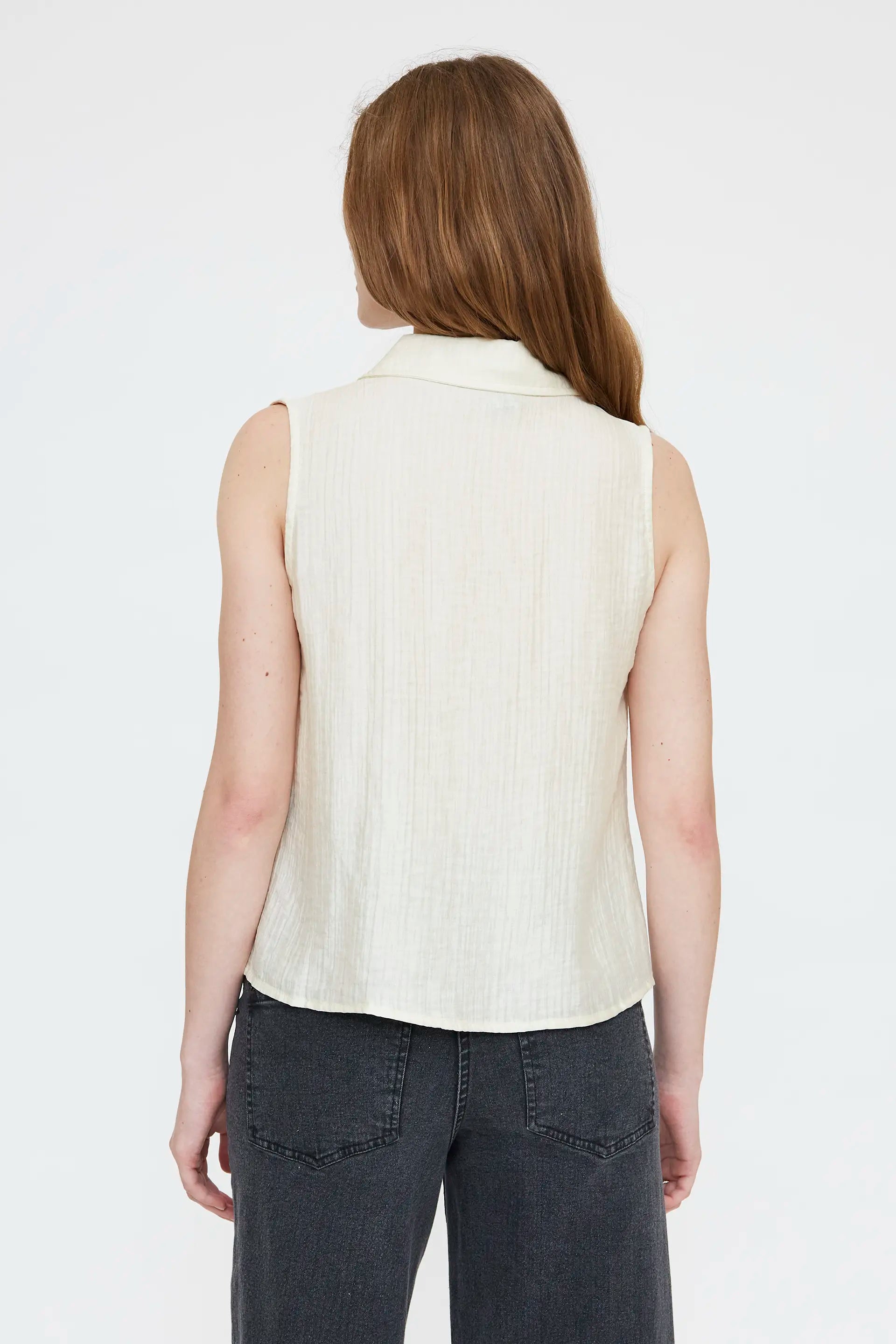 Camisa texturizada de color blanco roto. Con cuello solapa y sin mangas. Cierre frontal con botones. La modelo mide 174 cm y lleva la talla S.