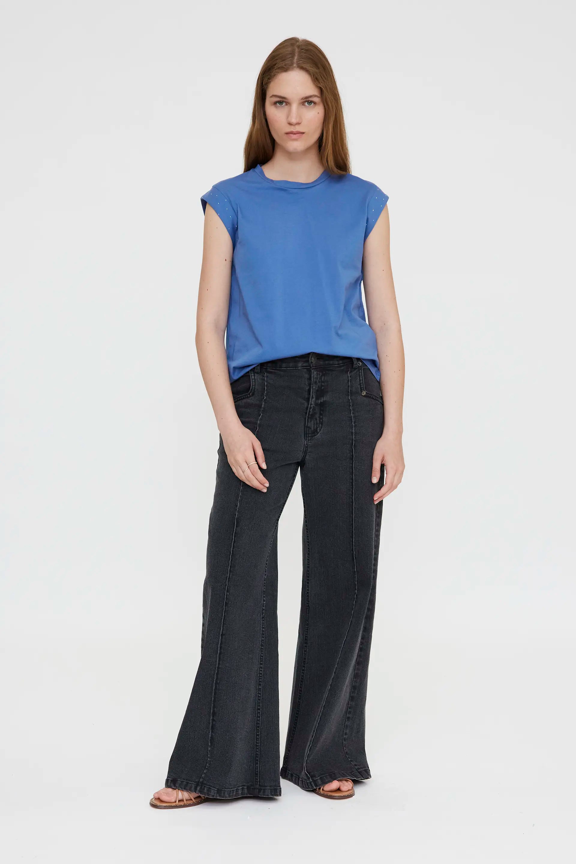 Camiseta con tejido 100% algodón de color azul. Con cuello redondo y manga corta. Detalle de aplicaciones en manga. La modelo mide 174 cm y lleva la talla S.