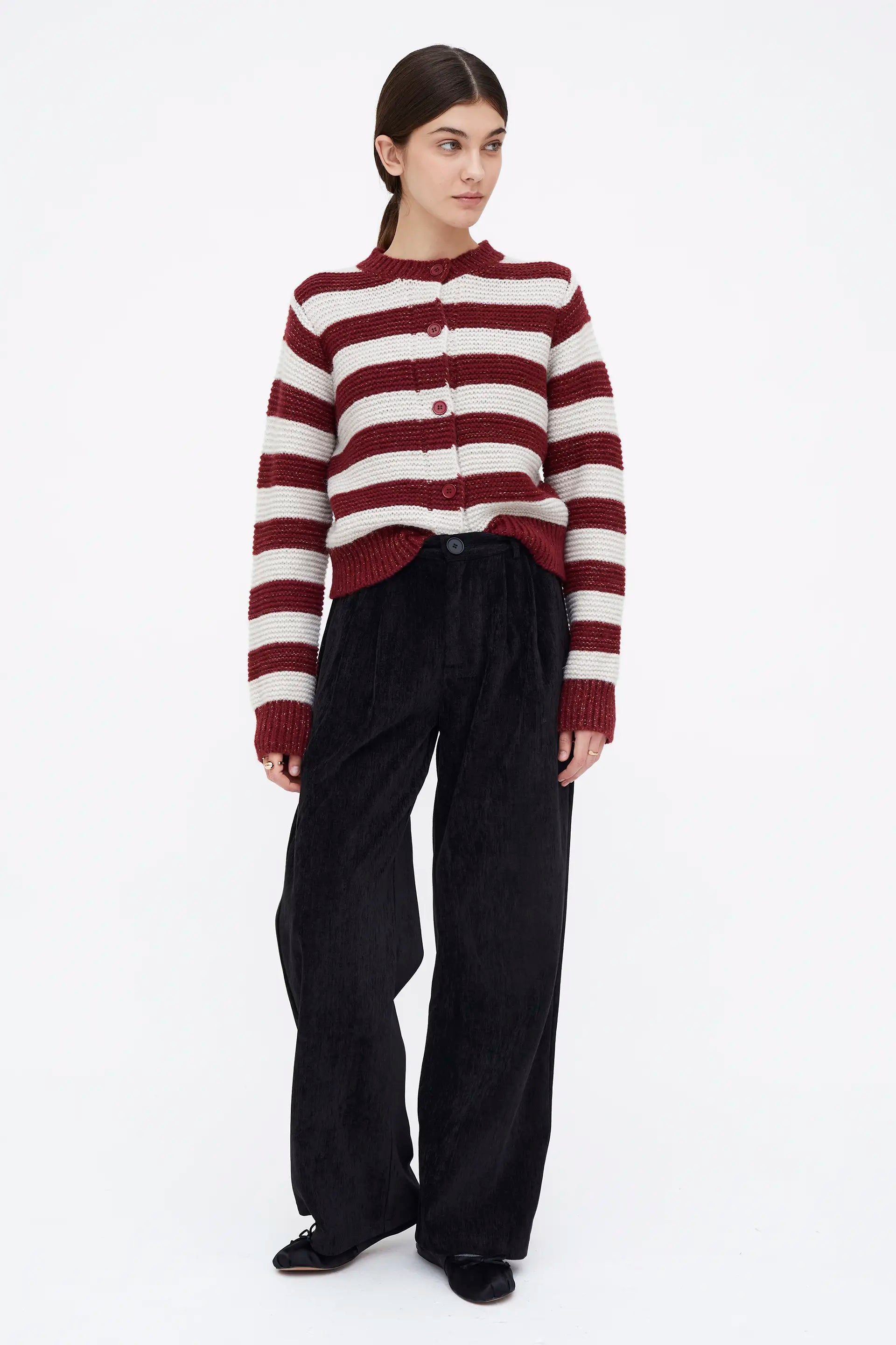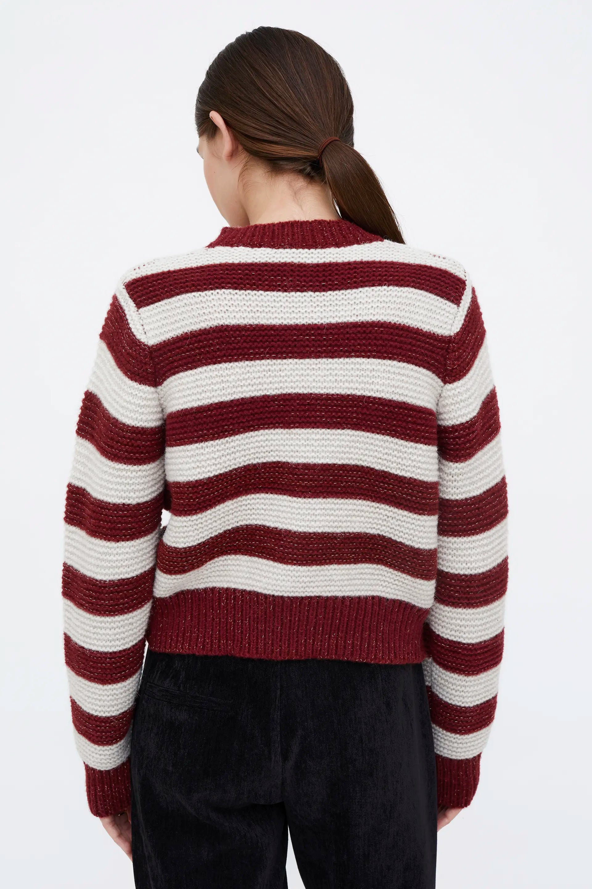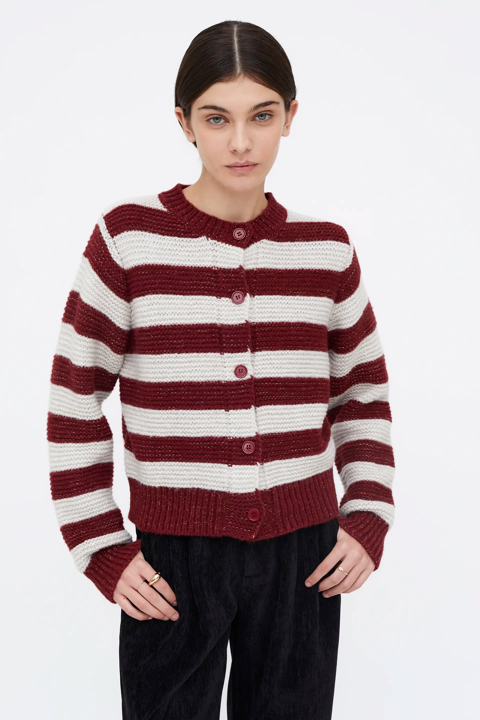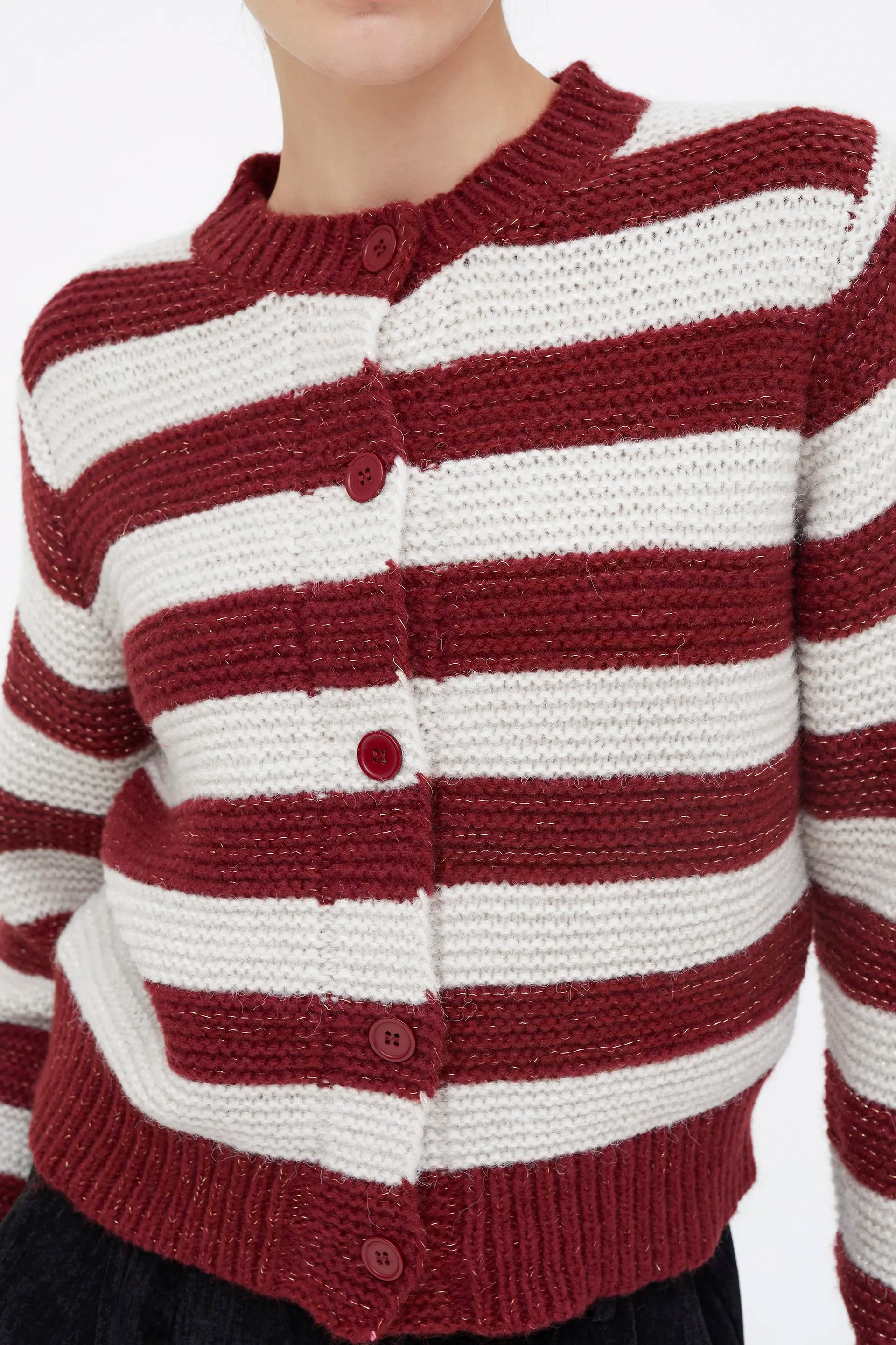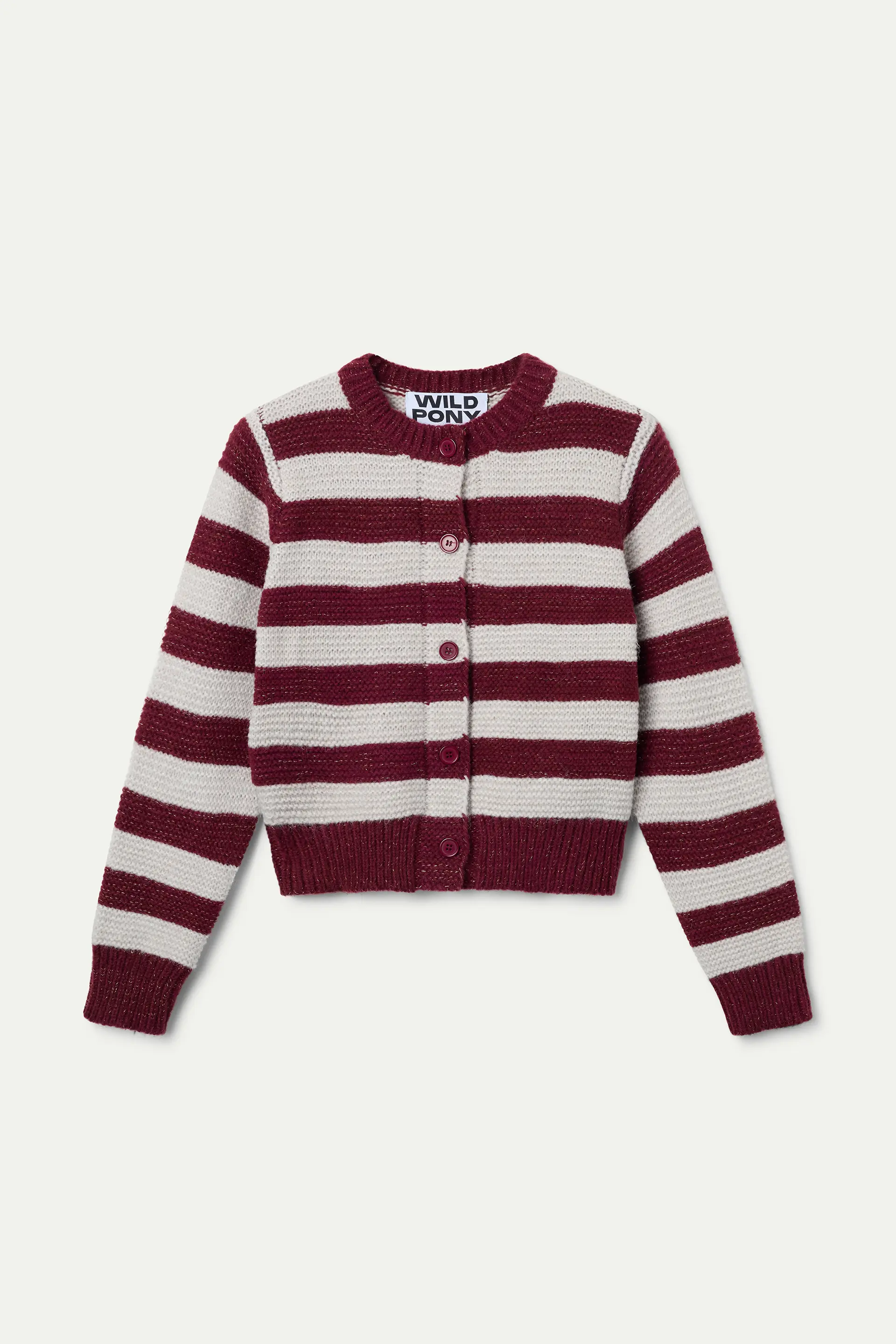 Cárdigan de punto con estampado de rayas blanco y marrón. Con cuello redondo, botones frontales y detalle fruncido en manga.