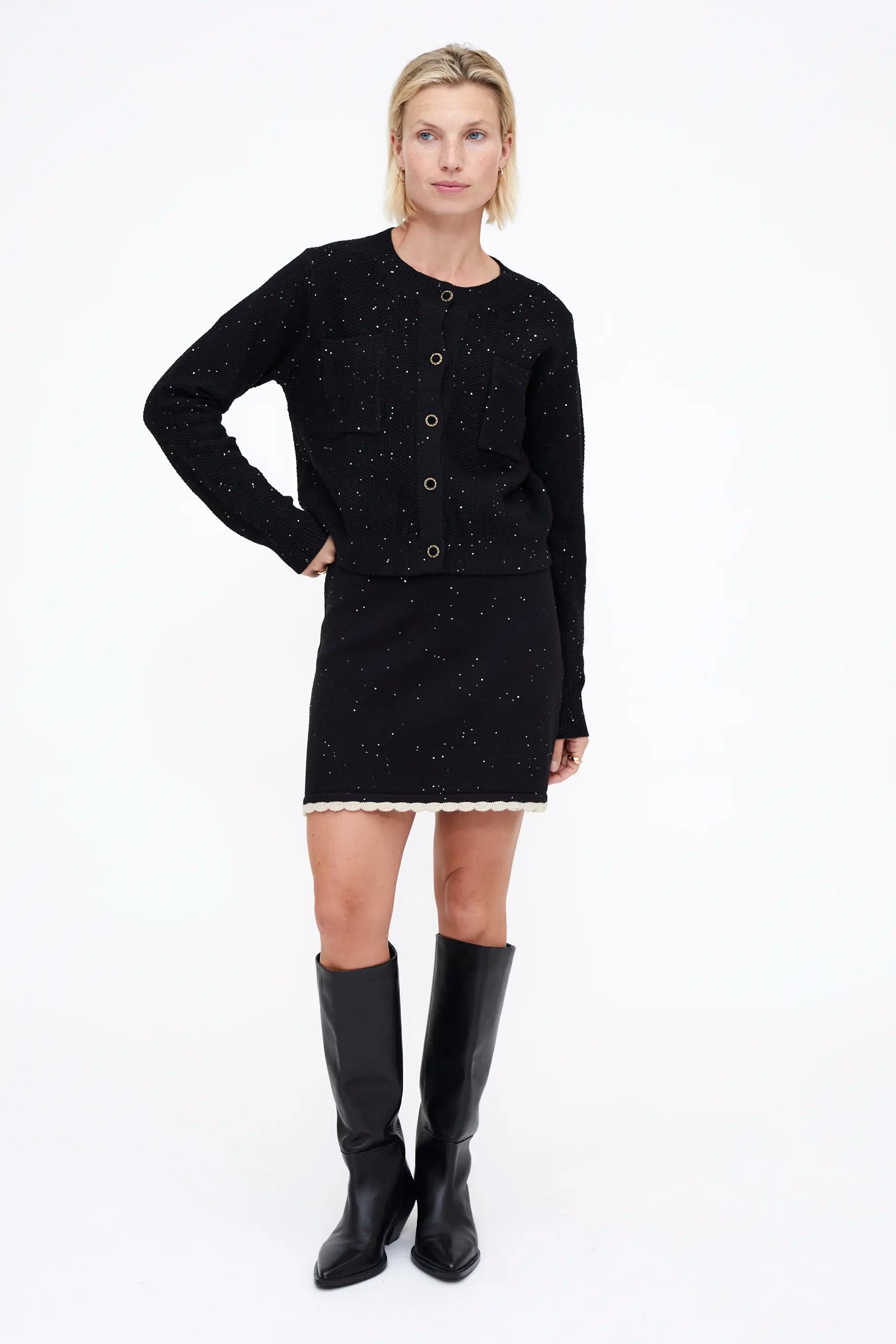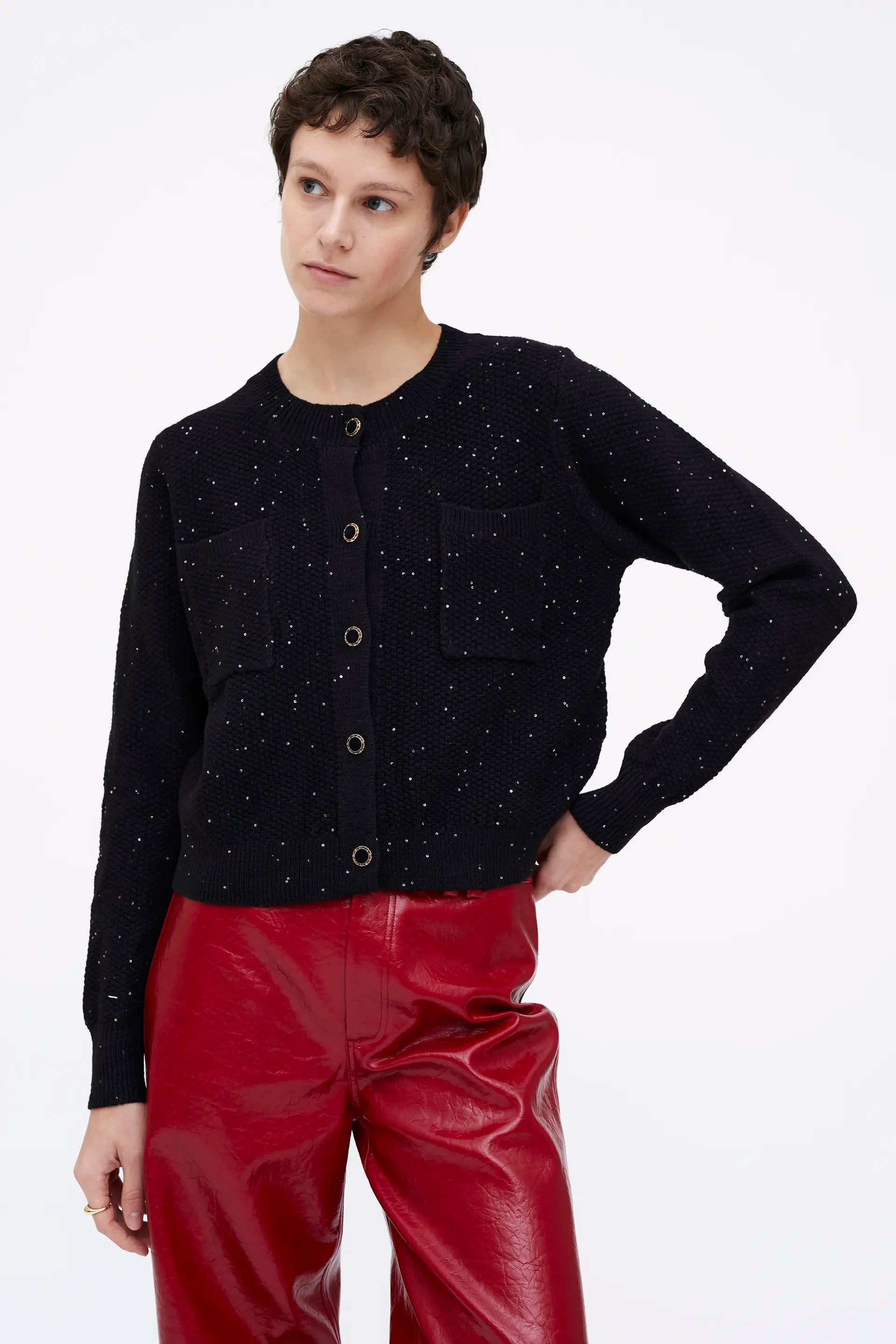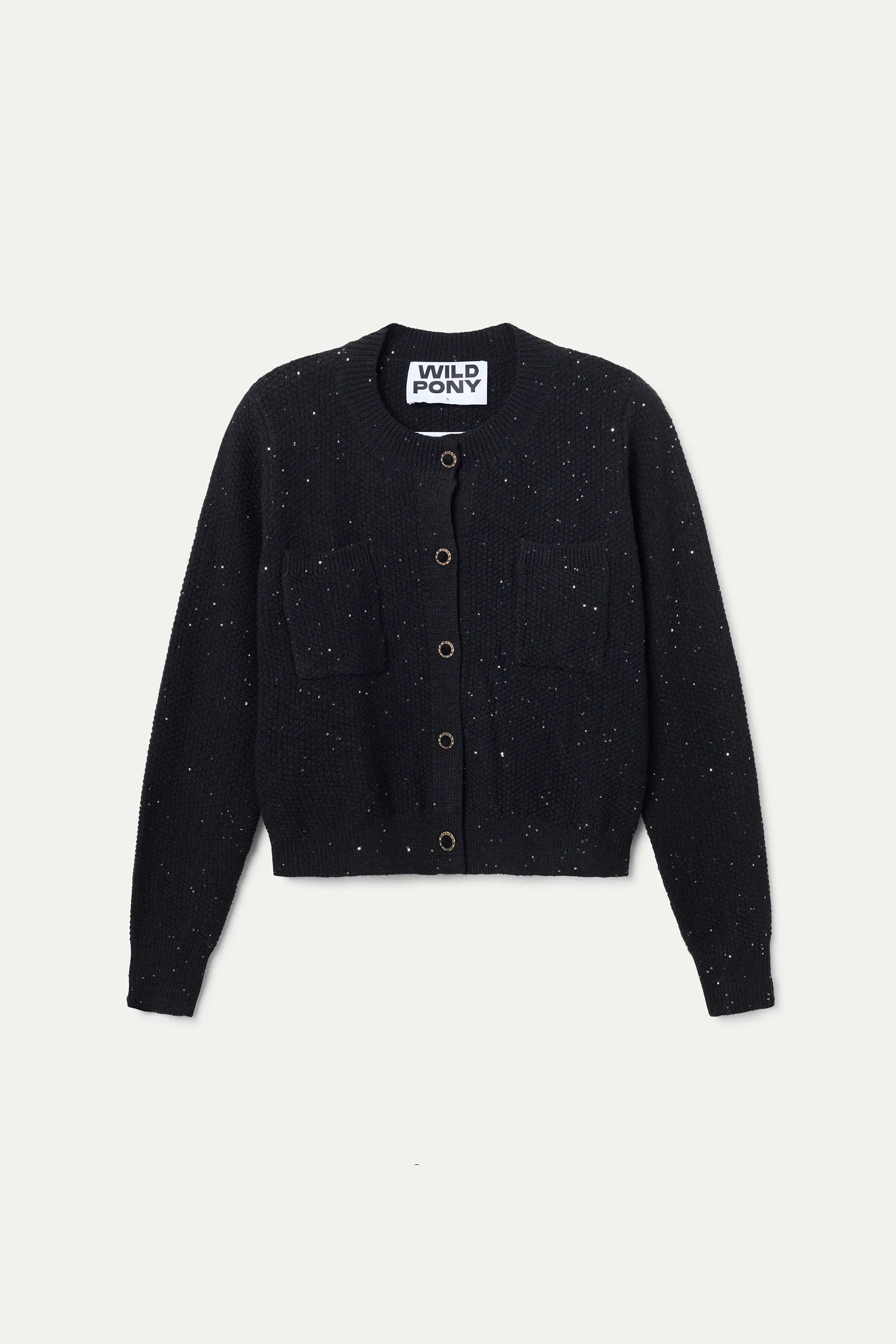 Cárdigan punto brillante negro. Cuello redondo y manga larga. Detalle de botón joya y lentejuelas.