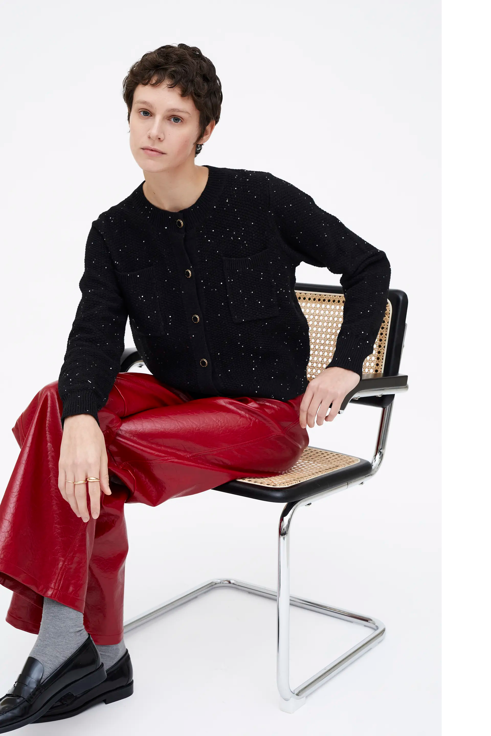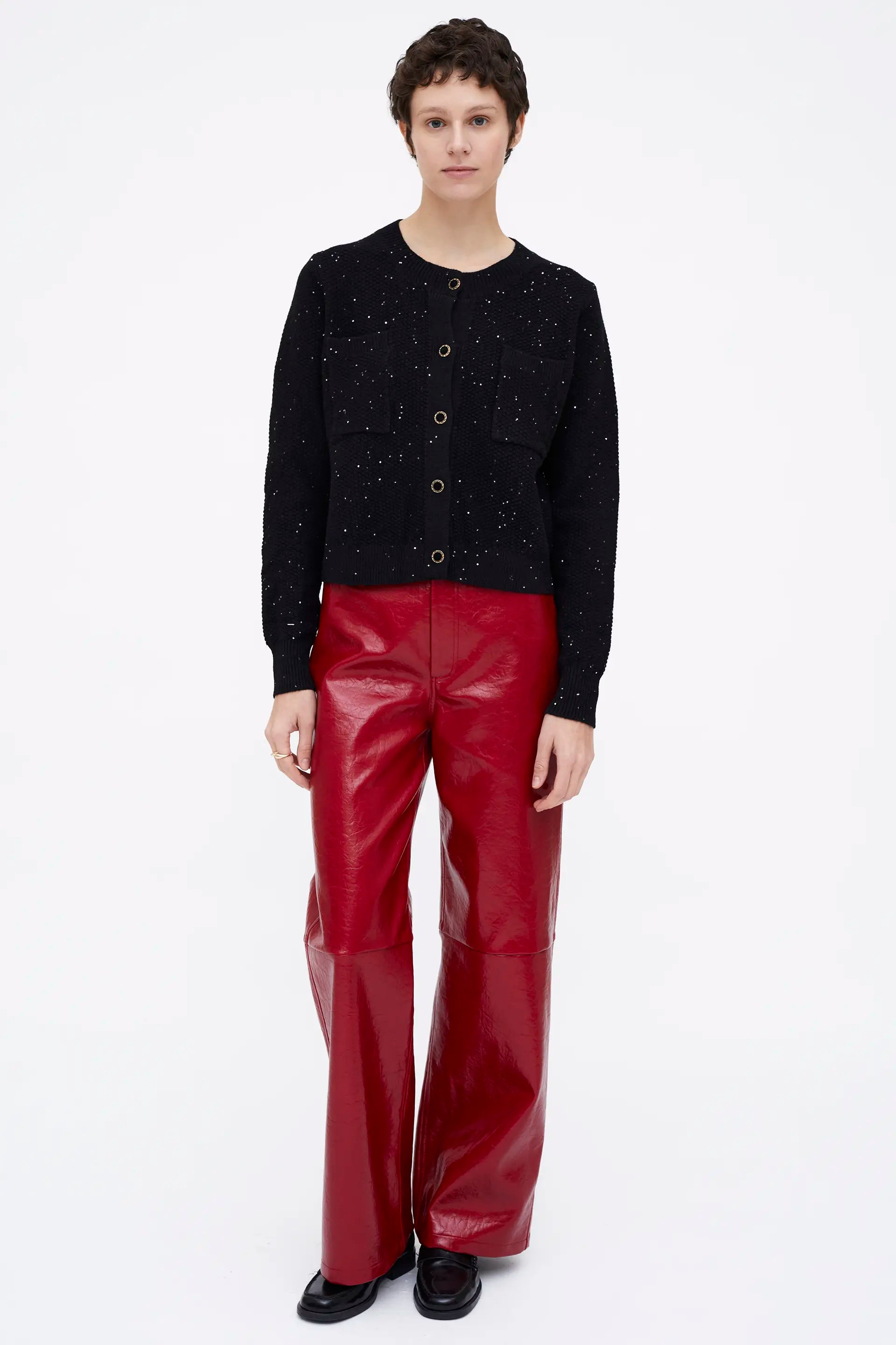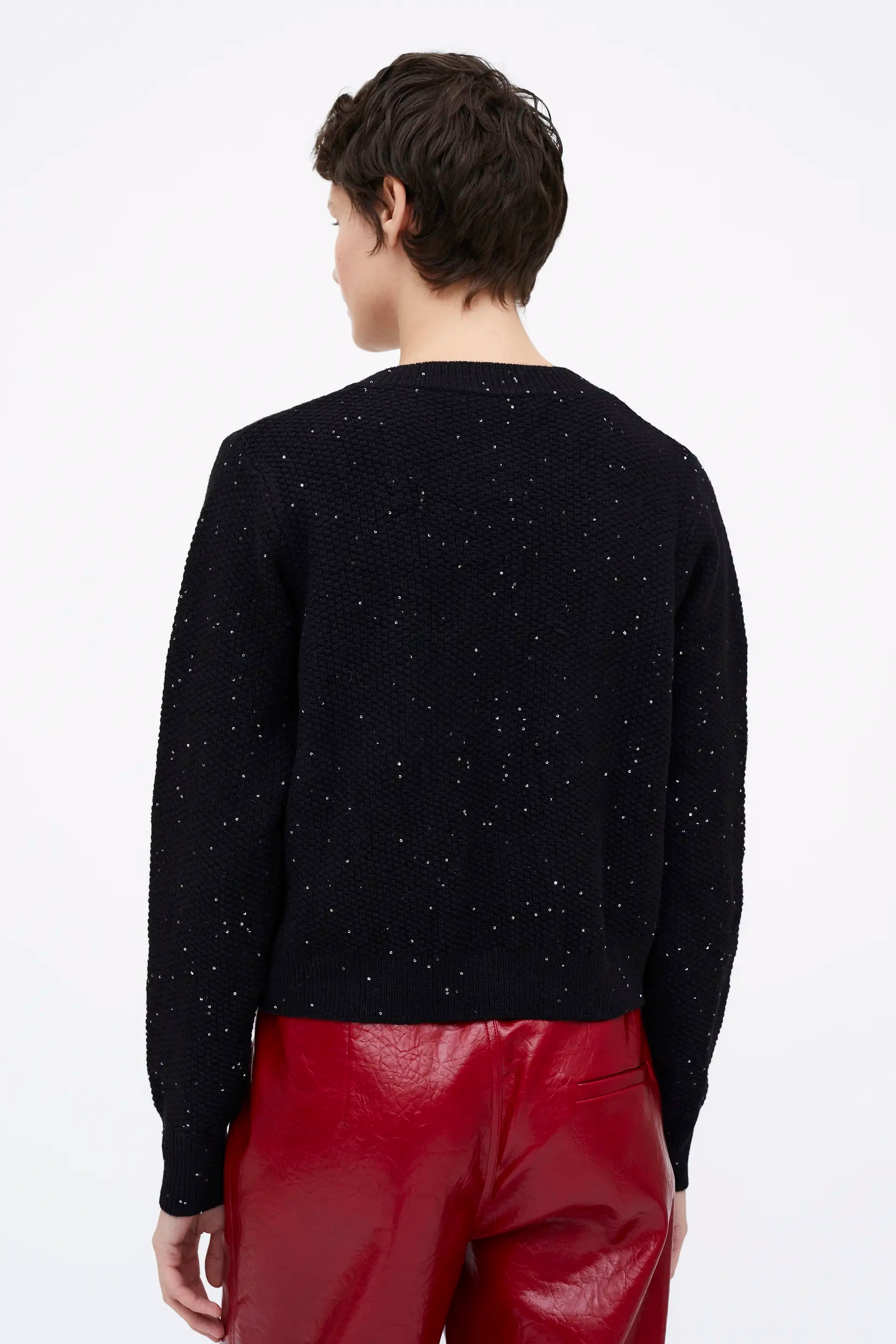 Cárdigan punto brillante negro. Cuello redondo y manga larga. Detalle de botón joya y lentejuelas.