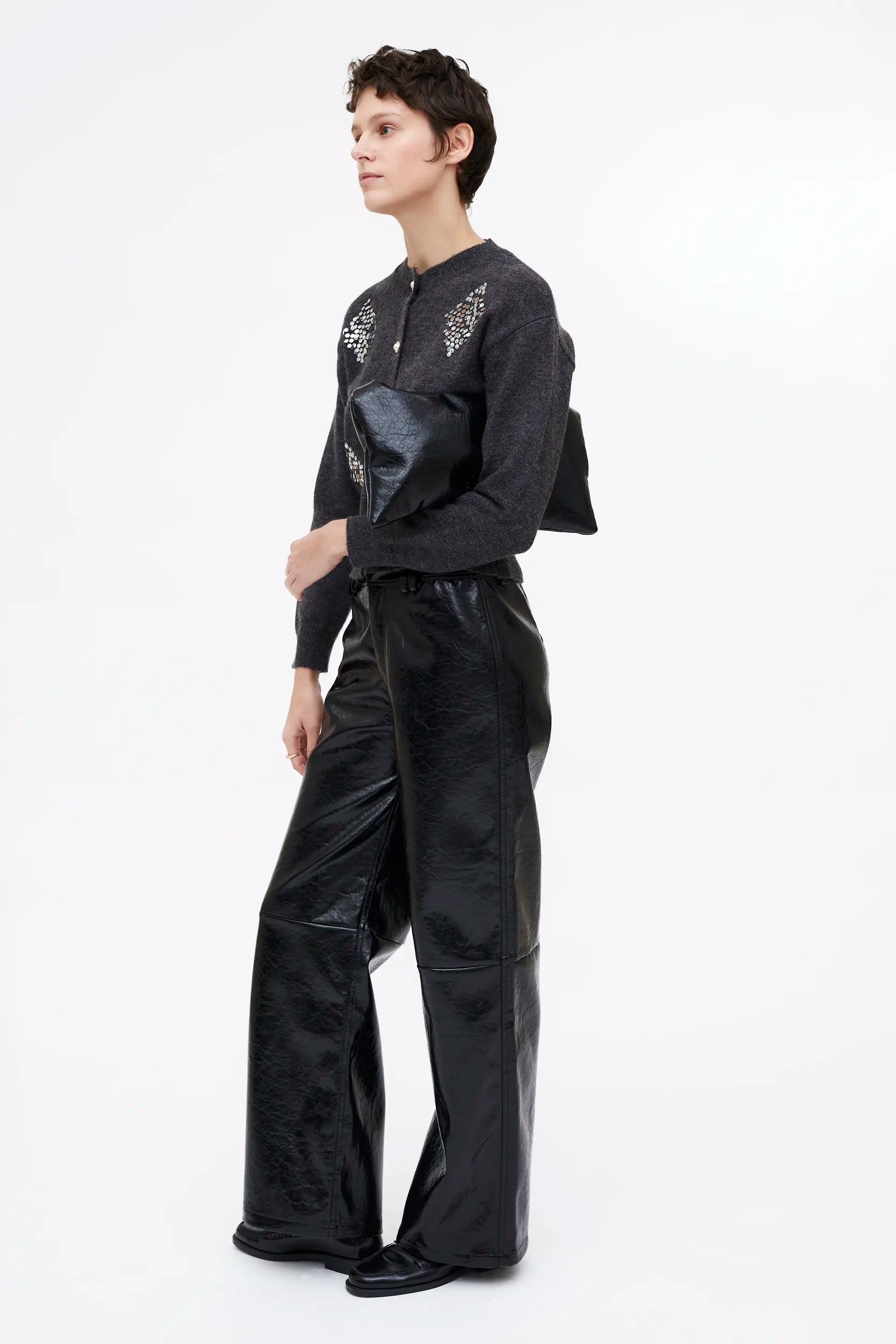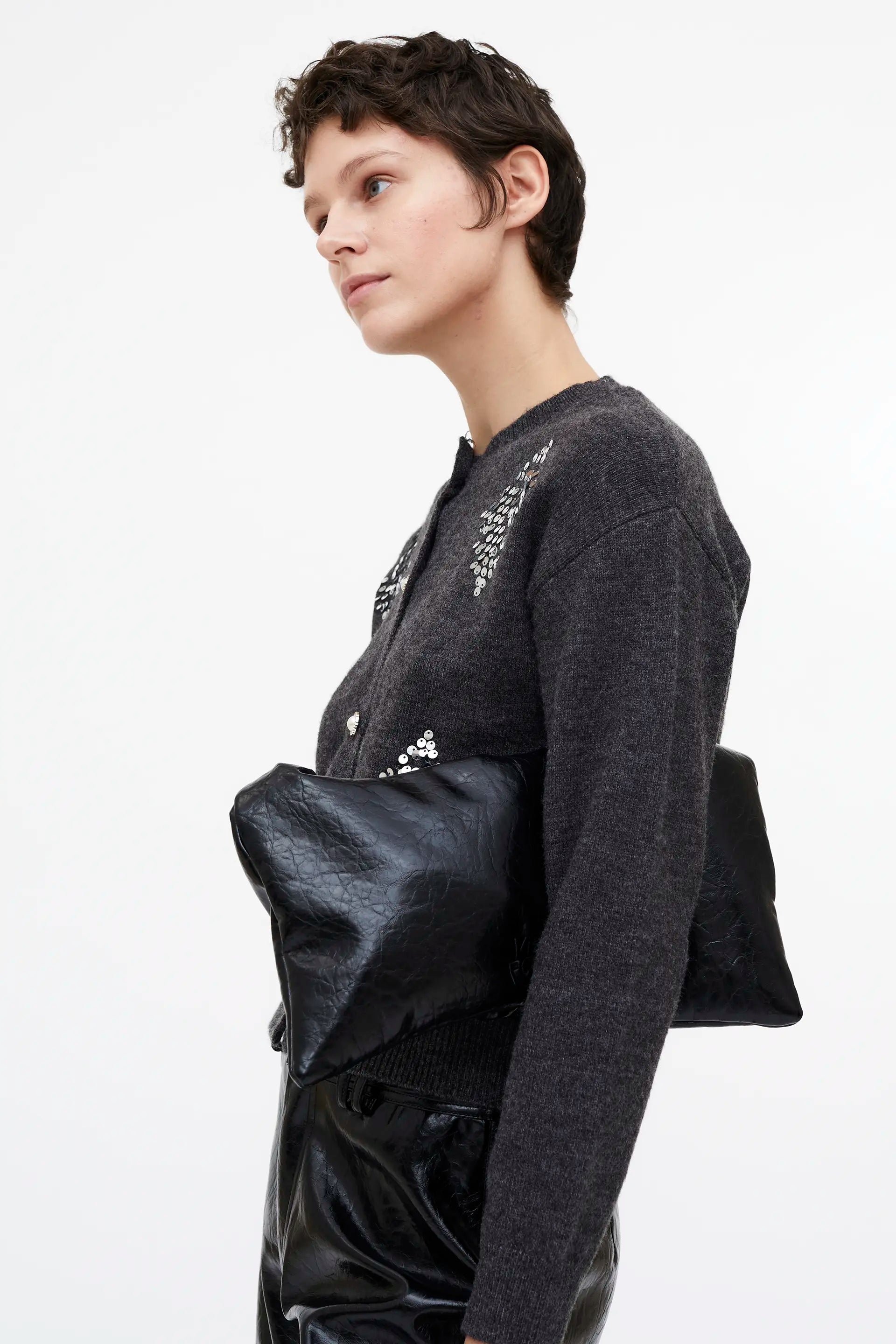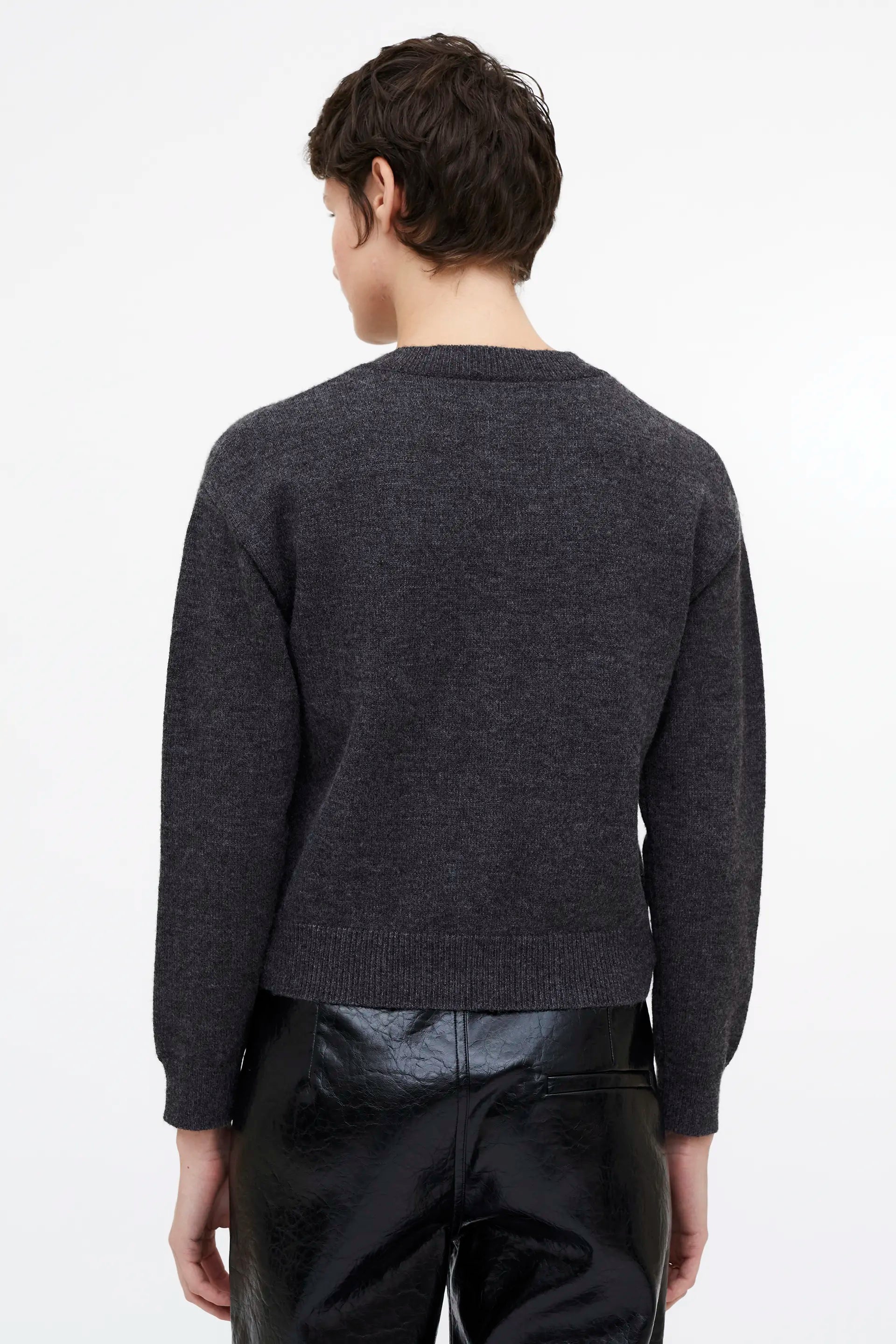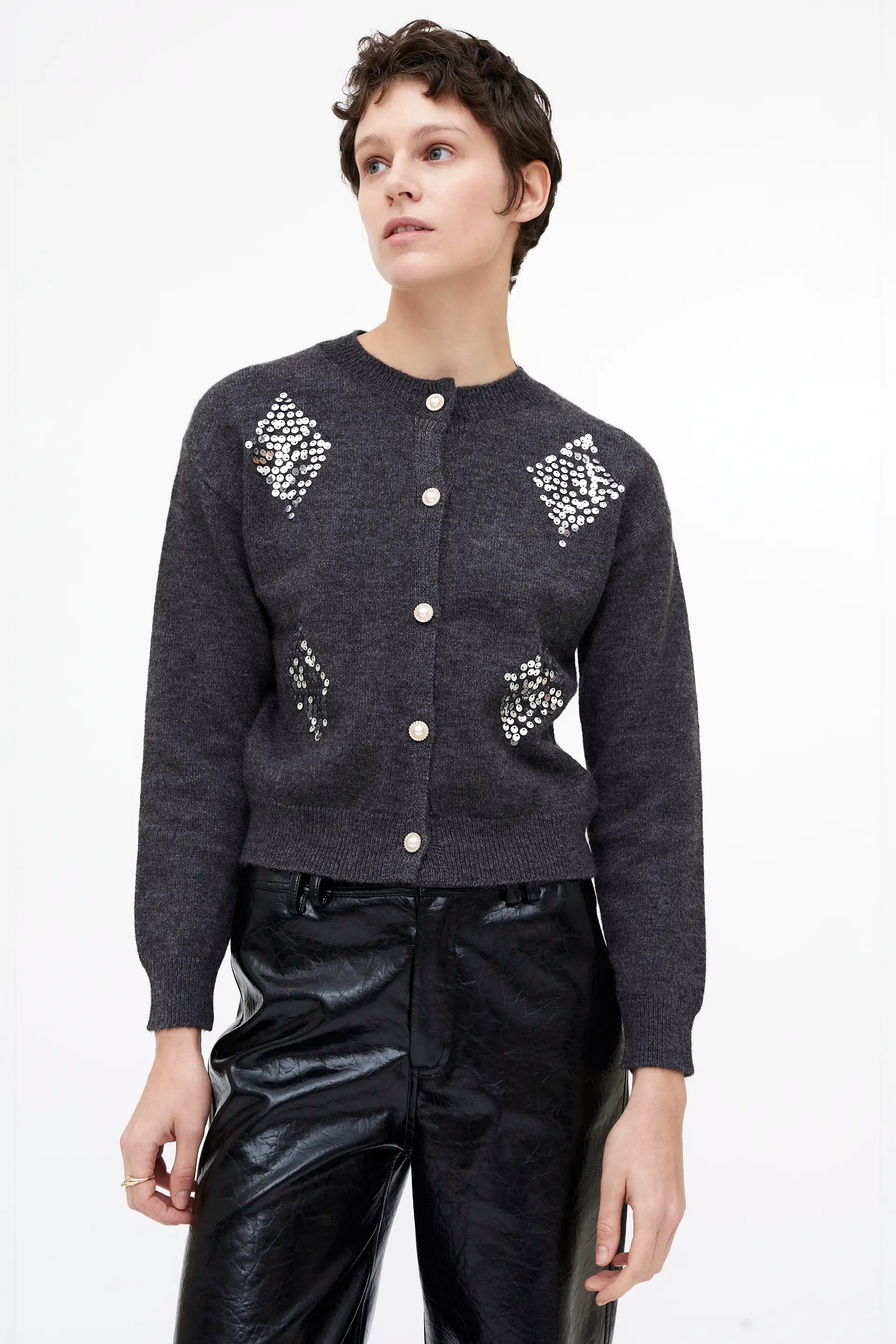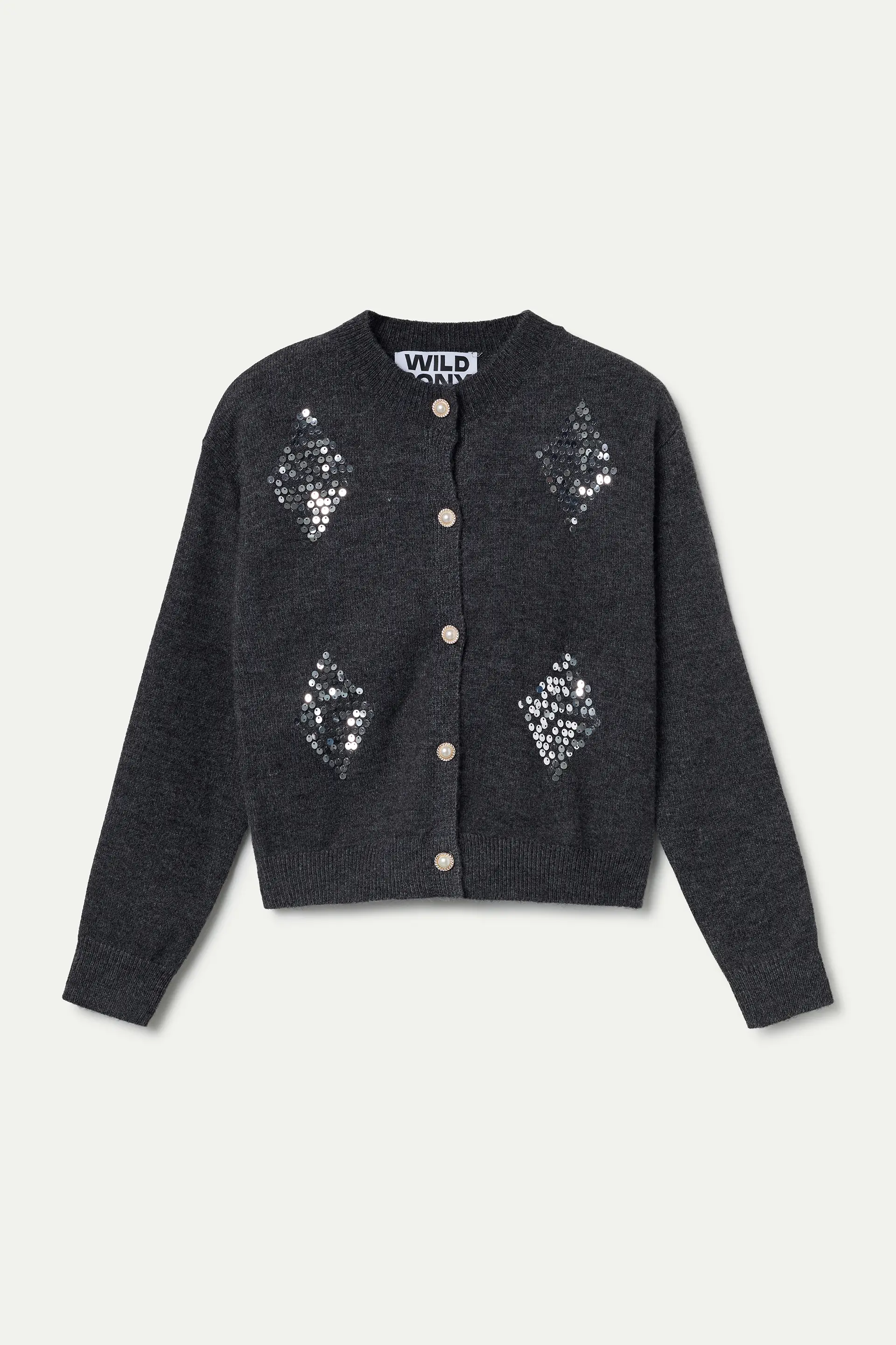 Cárdigan punto de color gris con detalles en lentejuelas. Cuello redondo y manga larga. Cierre con botones de joyas en dorado y blanco.