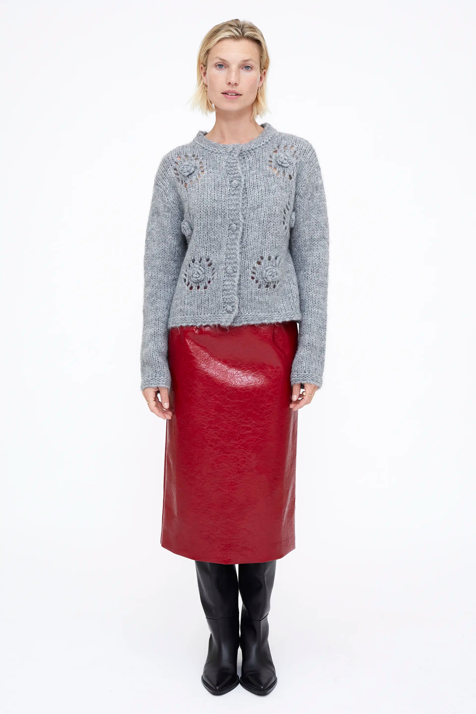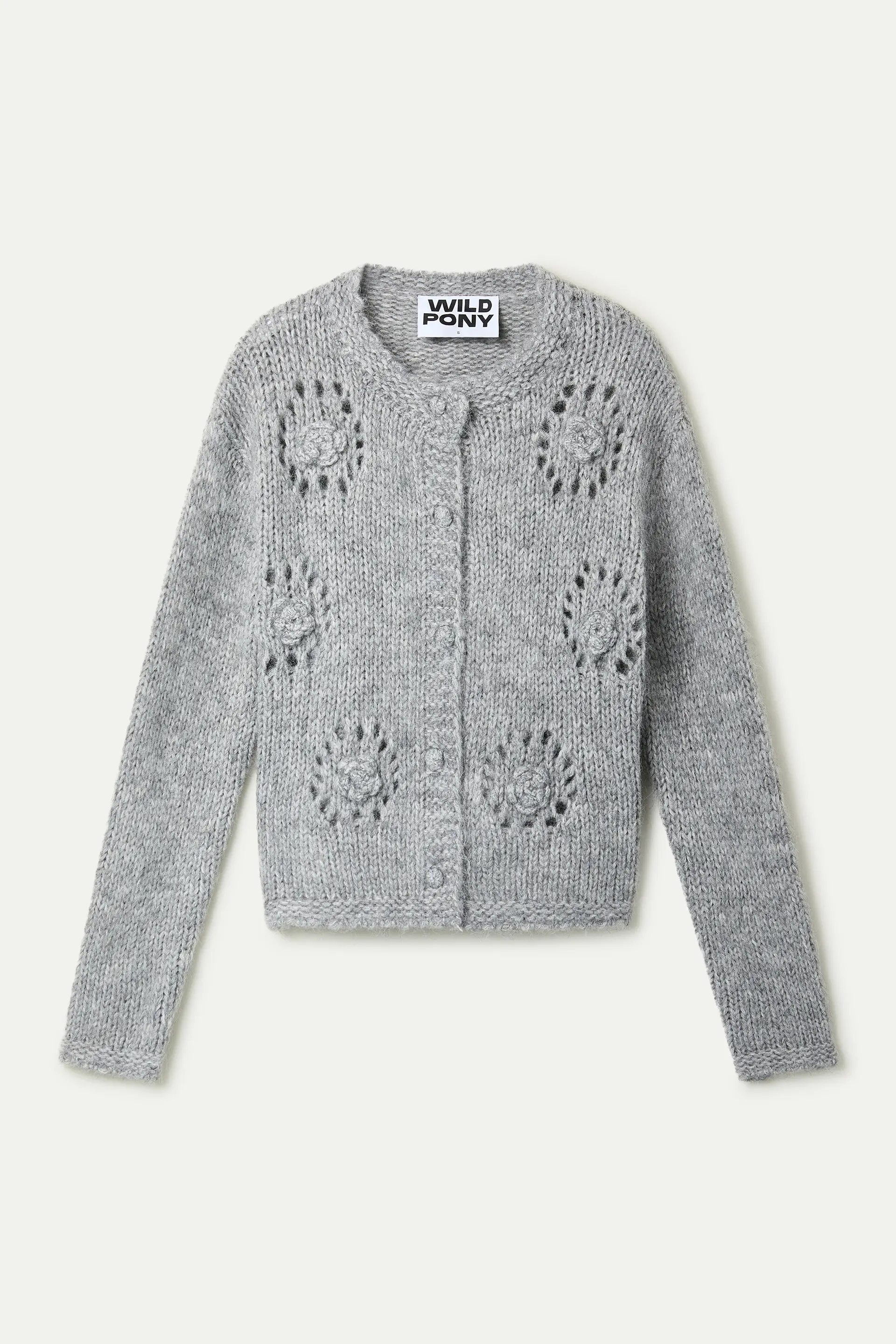 Cárdigan punto de color gris con flores crochet. Cuello redondo y manga larga. Cierre con botones.