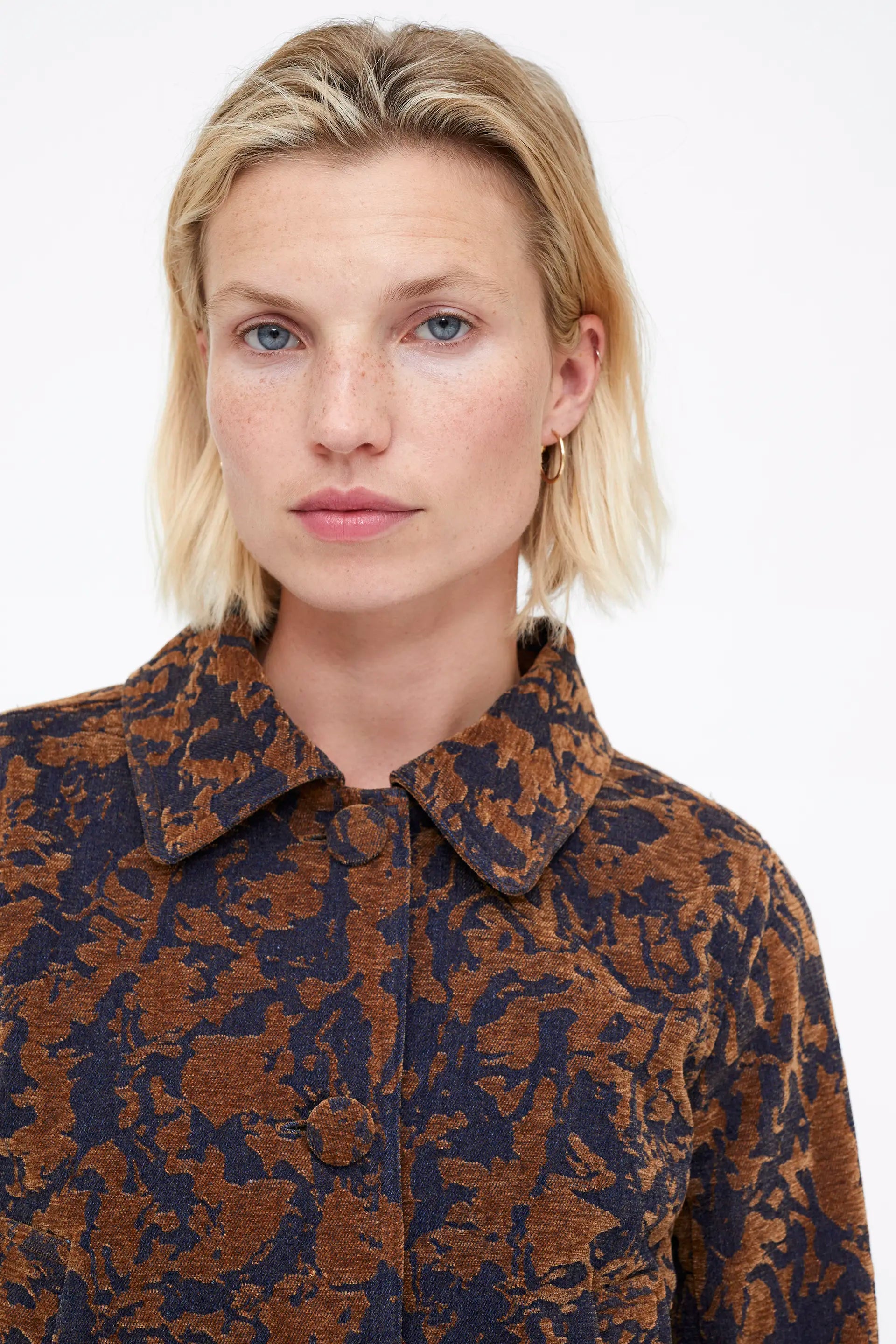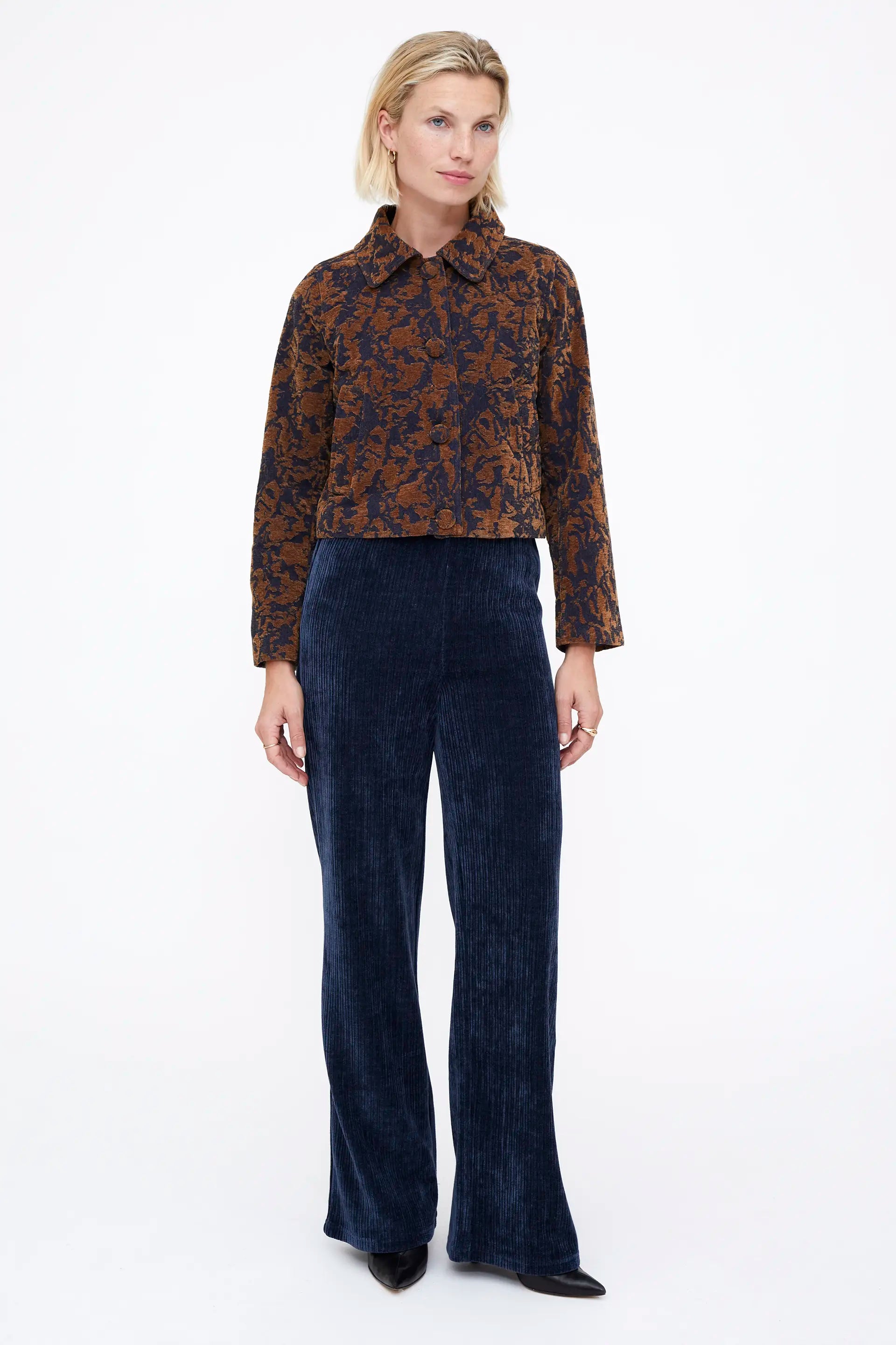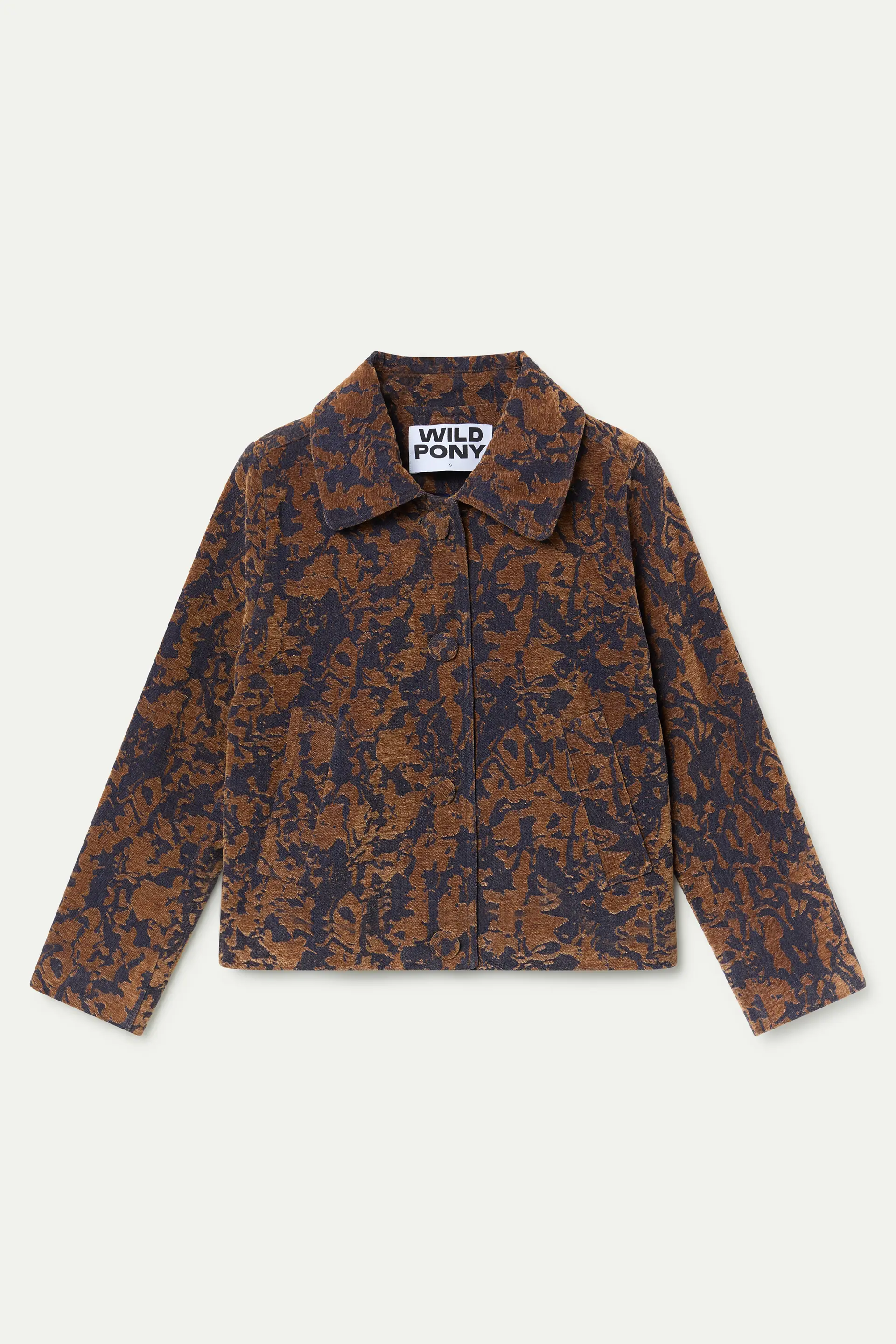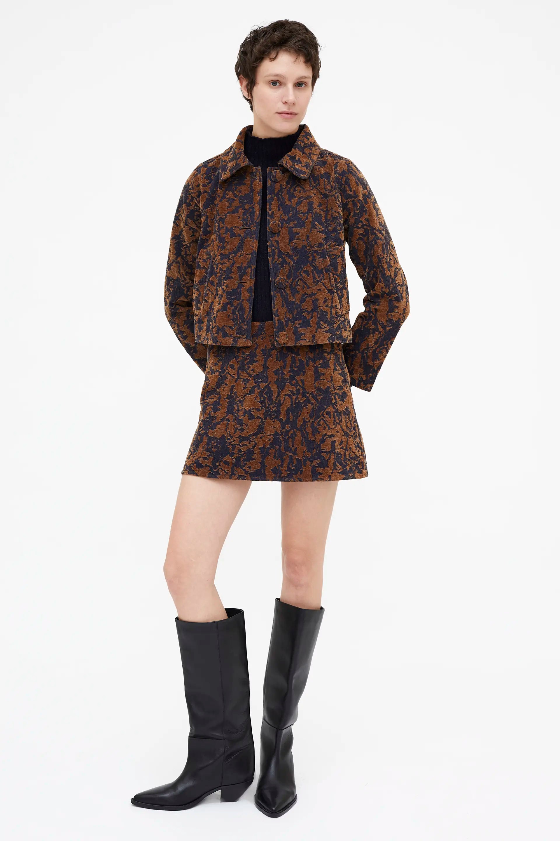 Chaqueta Jacquard color Navy blue y marrón. Con cuello solapa y manga larga. Cierre frontal con botones forrados. Bolsillos laterales.
