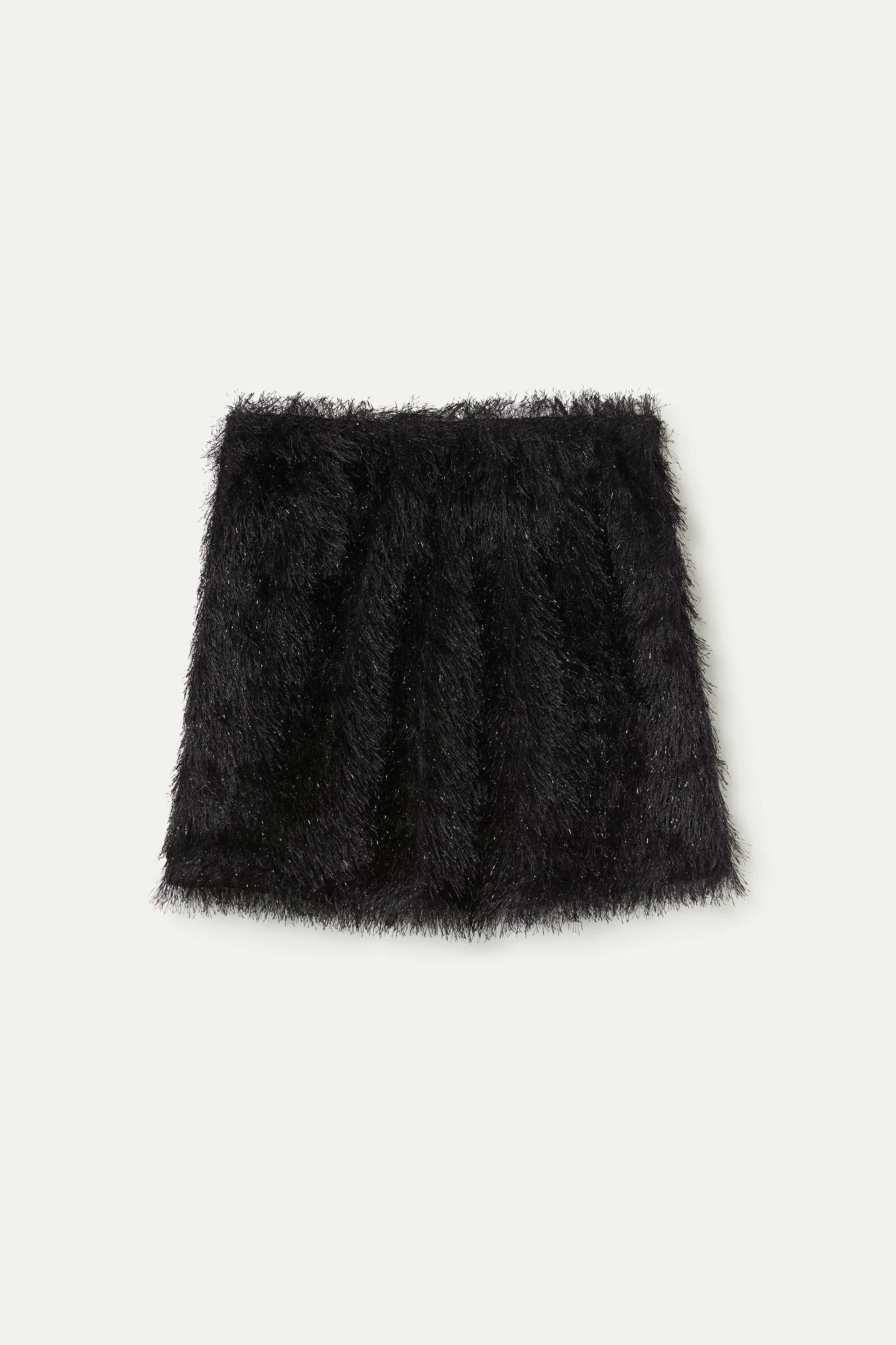 Falda corta de color negro con hilos Lurex. Con cintura fija de tiro alto. Goma interna en cintura.
