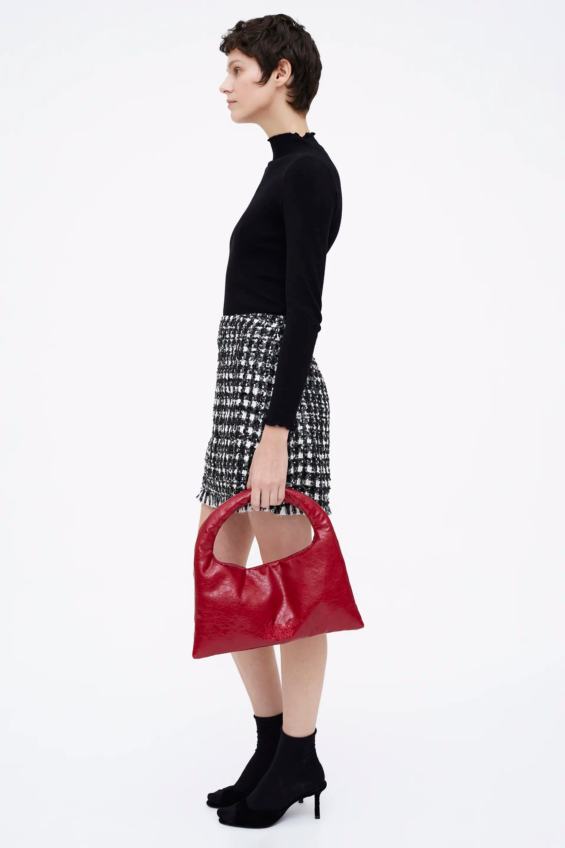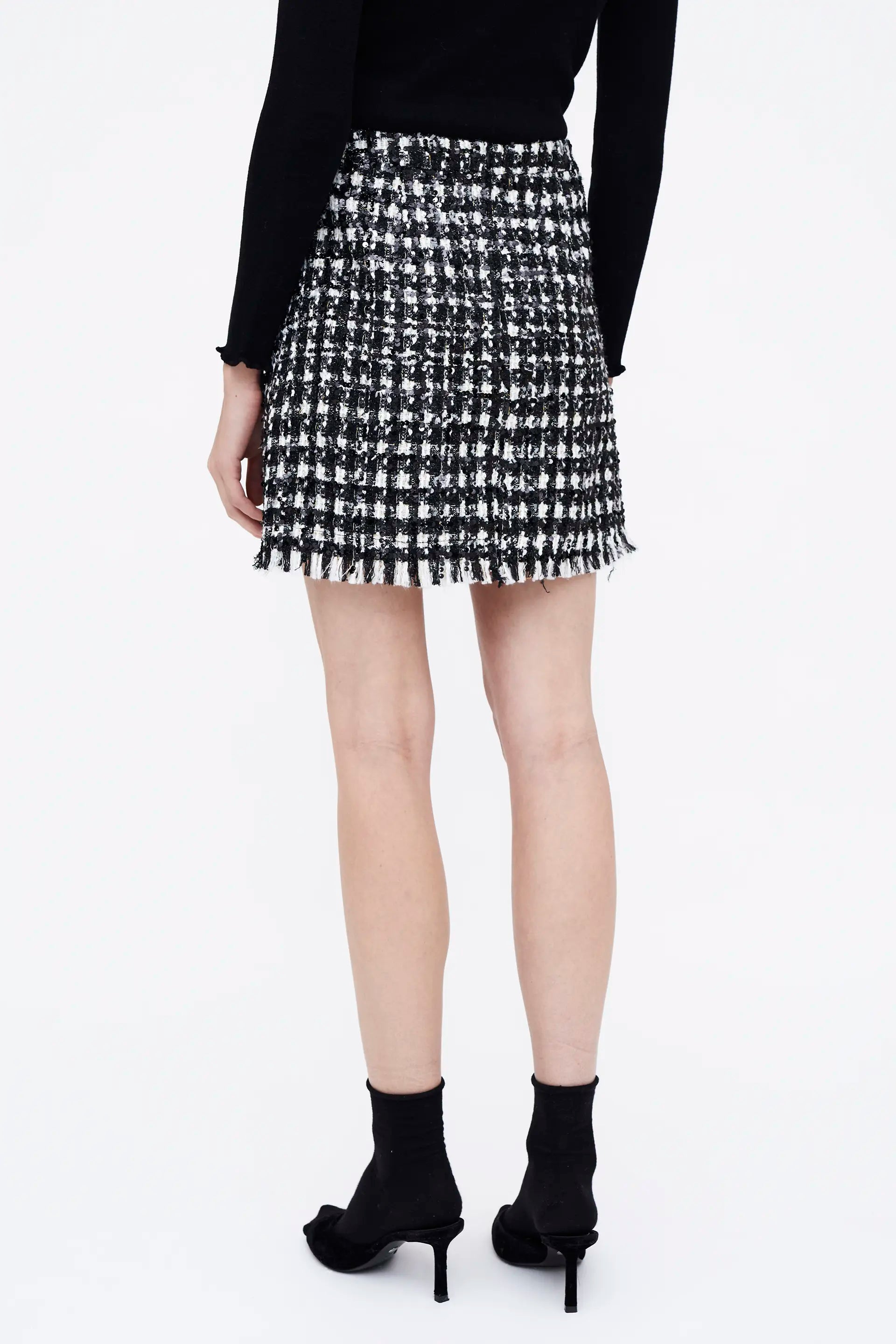 Falda corta en tejido tweed con adornos en lentejuela color blanco y negro. Cintura fija de tiro medio. Detalles de flecos en terminaciones. Cierre con cremallera invisible lateral.