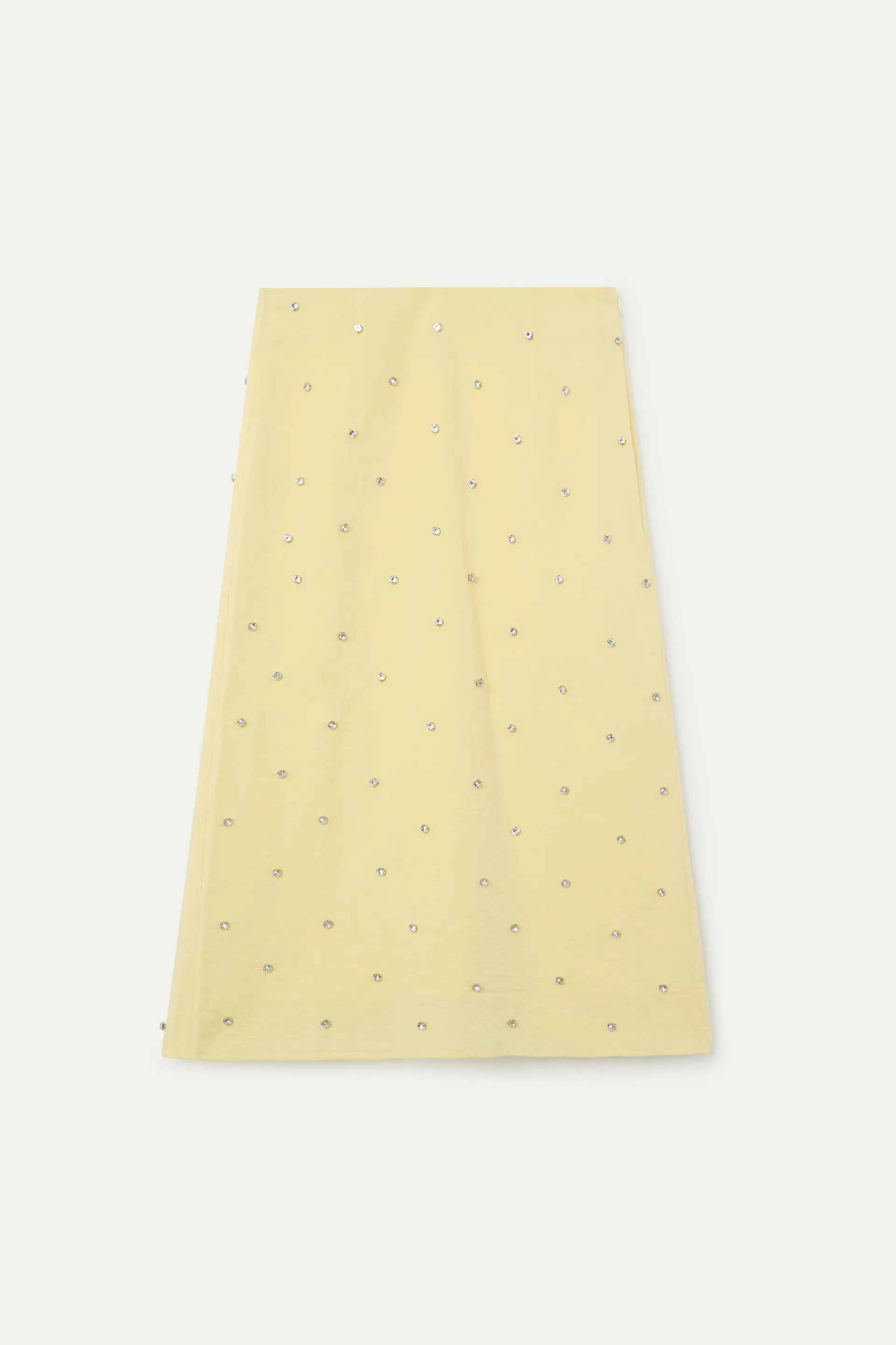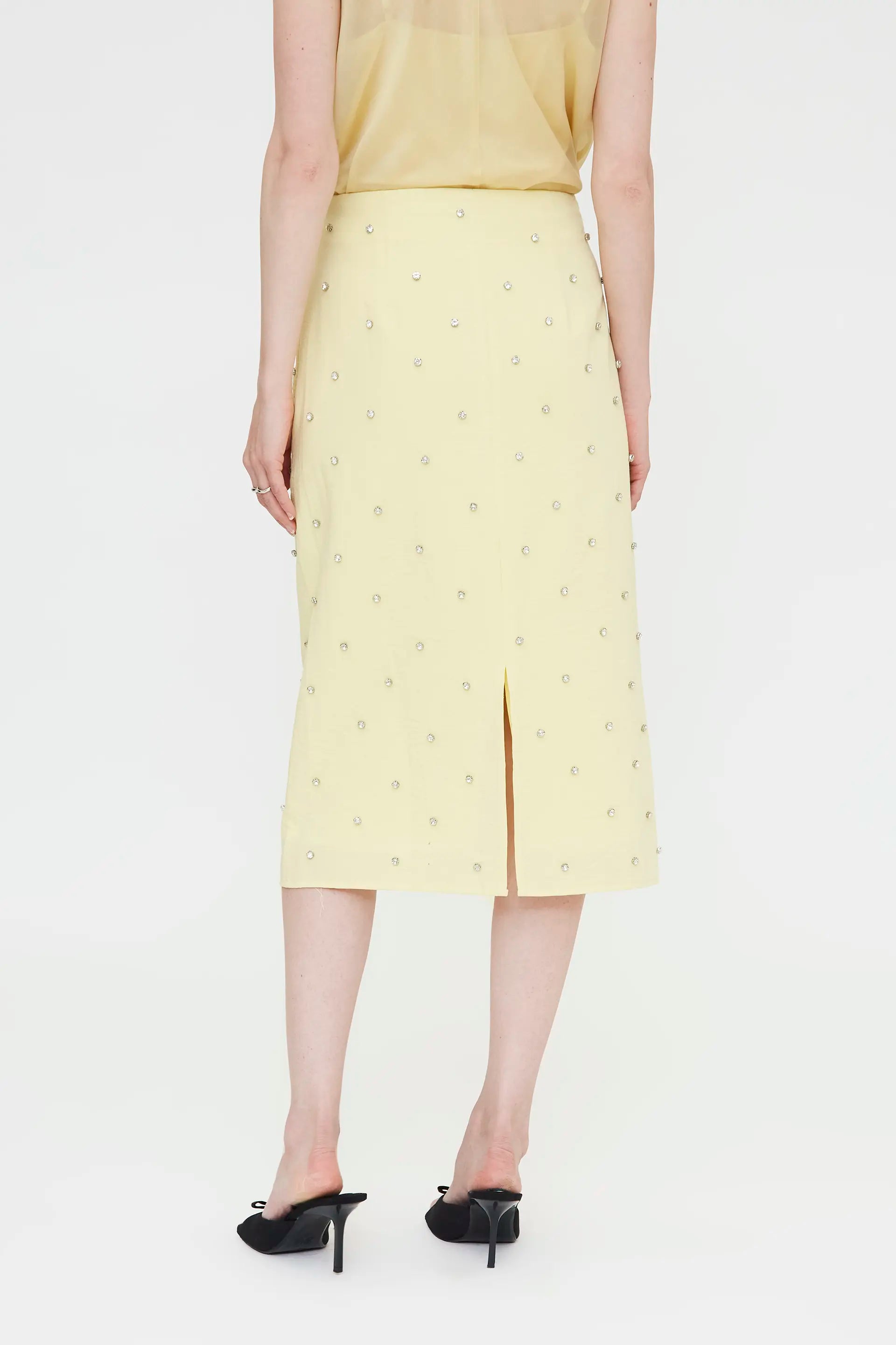 Falda midi de color amarillo con tejido crepé y detalles en diamantes. Cintura fija alta elástica. Forro interior. La modelo mide 178 cm y lleva la talla S.