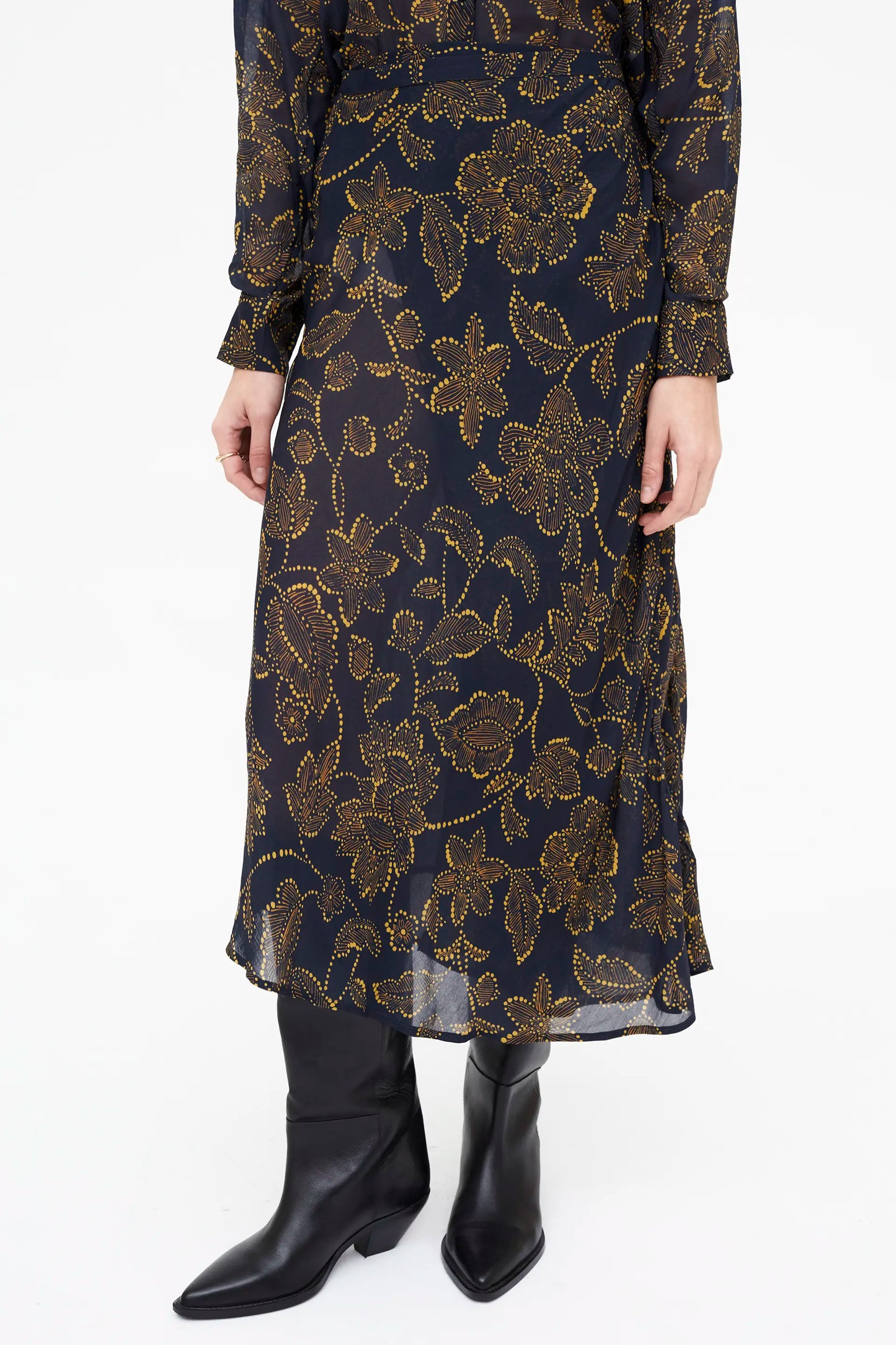 Falda midi asimétrica estampado Mustard Flower. Cintura fija de tiro alto. Estilo pareo.