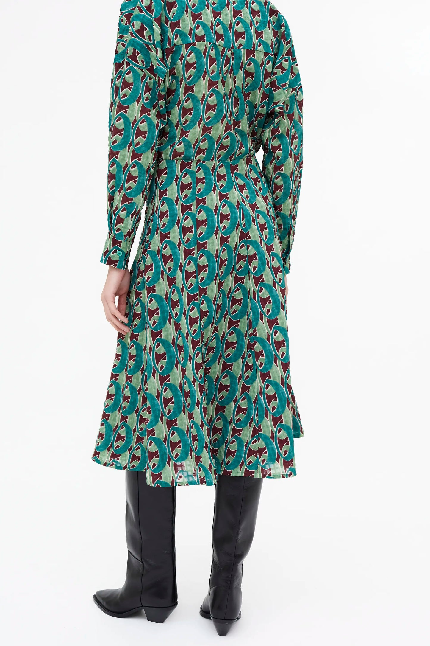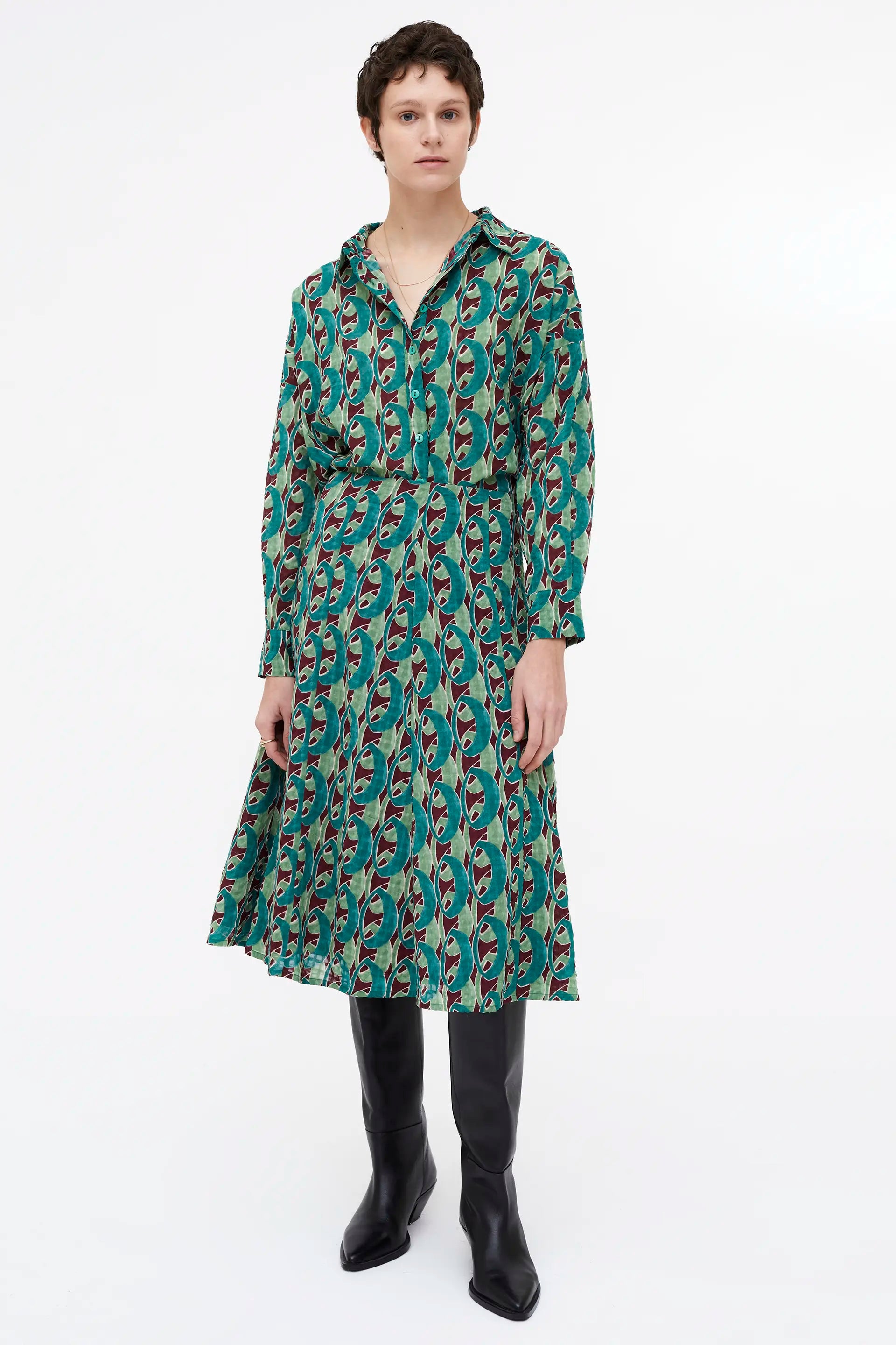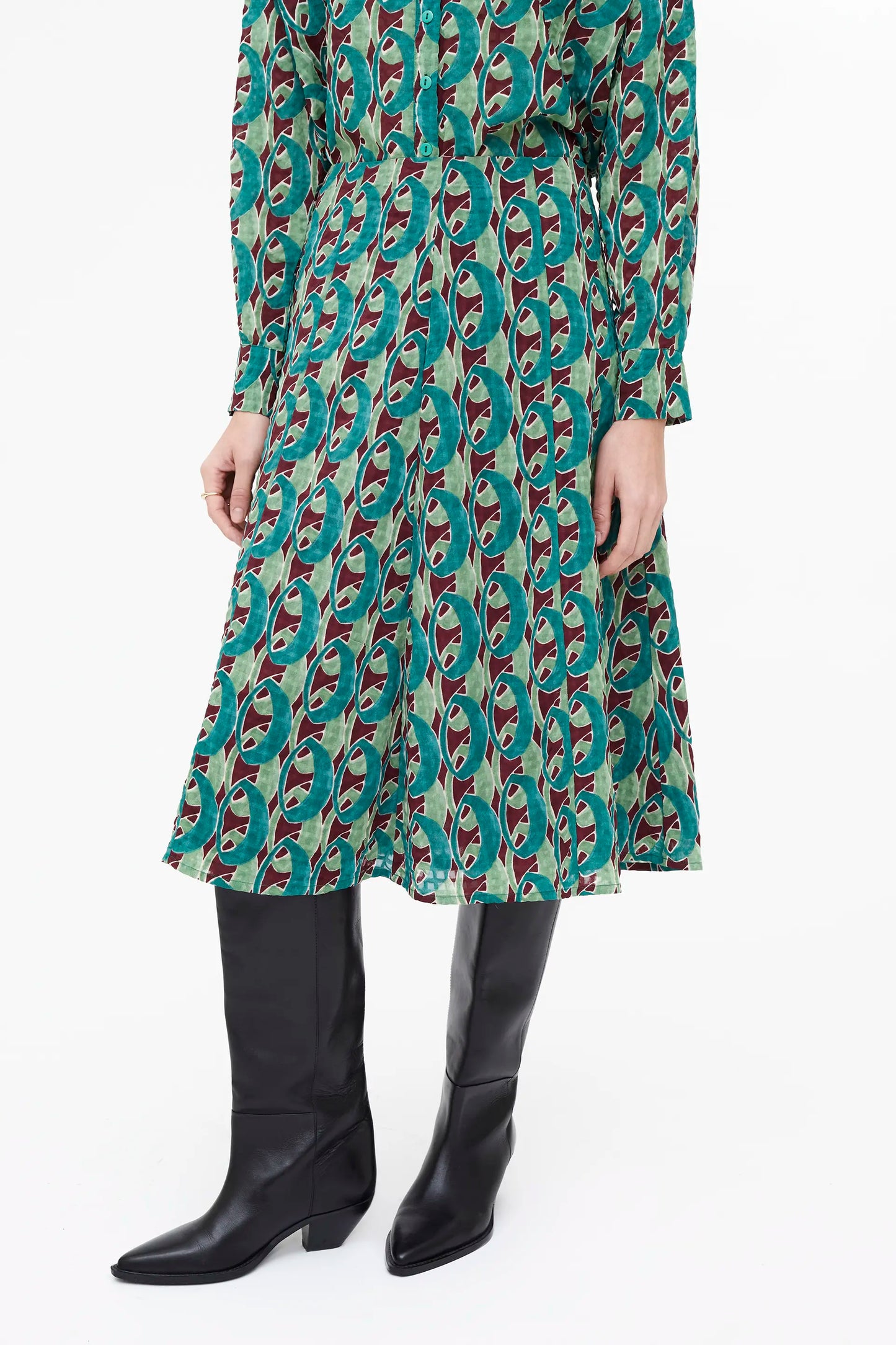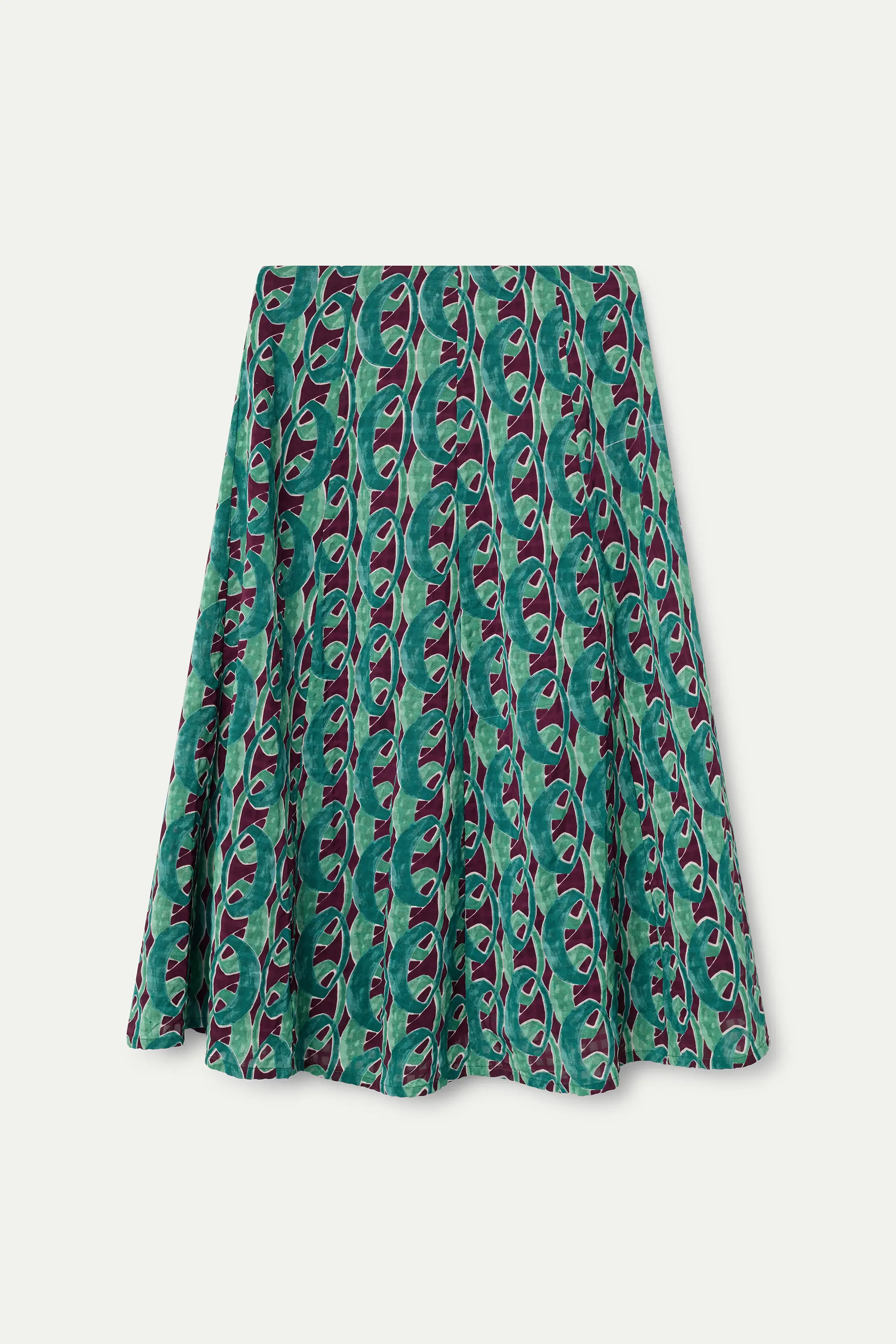 Falda Midi con estampado Jade Chain. Cintura fija de tiro medio con detalles plisados. Cremallera invisible lateral.