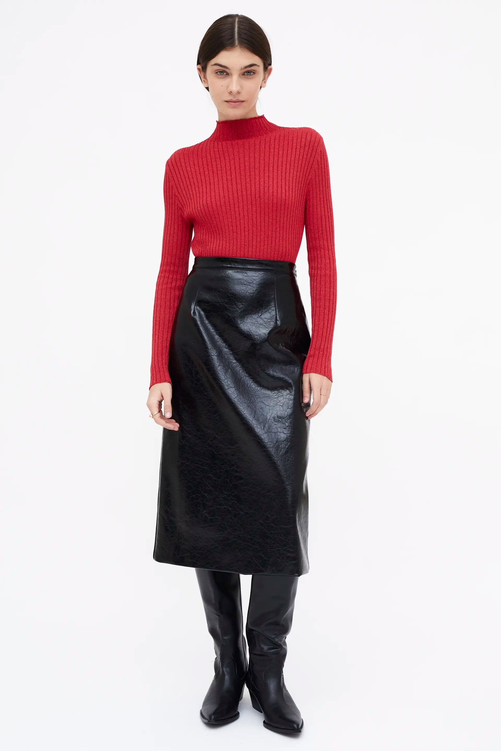 Falda midi en tejido efecto piel de color negro. Con cintura fija de tiro medio. Modelo con costuras visibles. Cierre lateral con cremallera oculta.